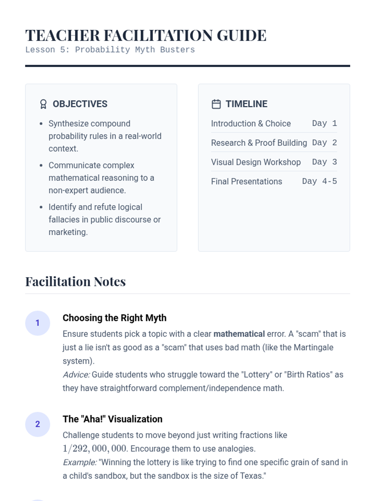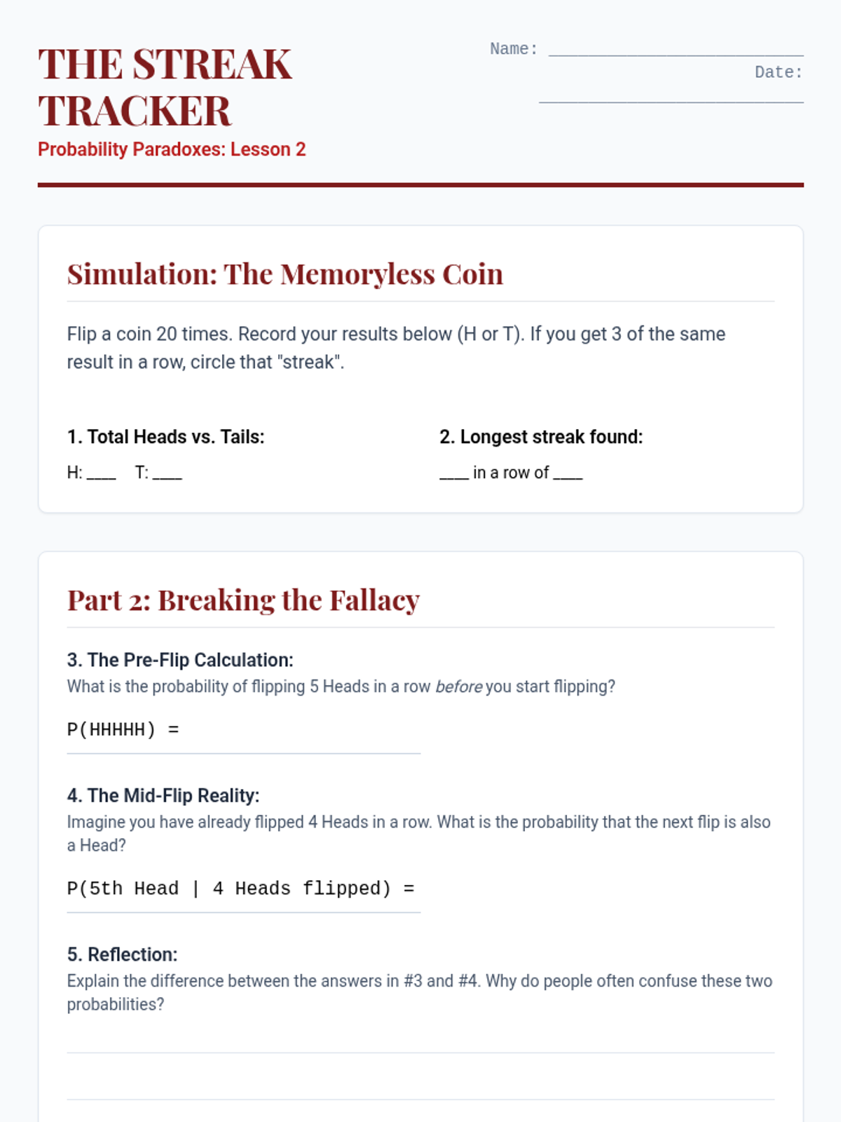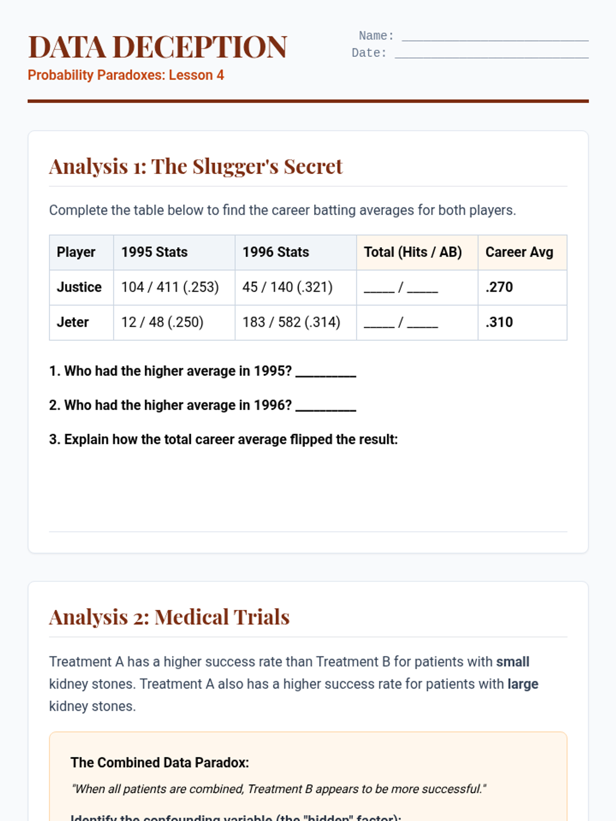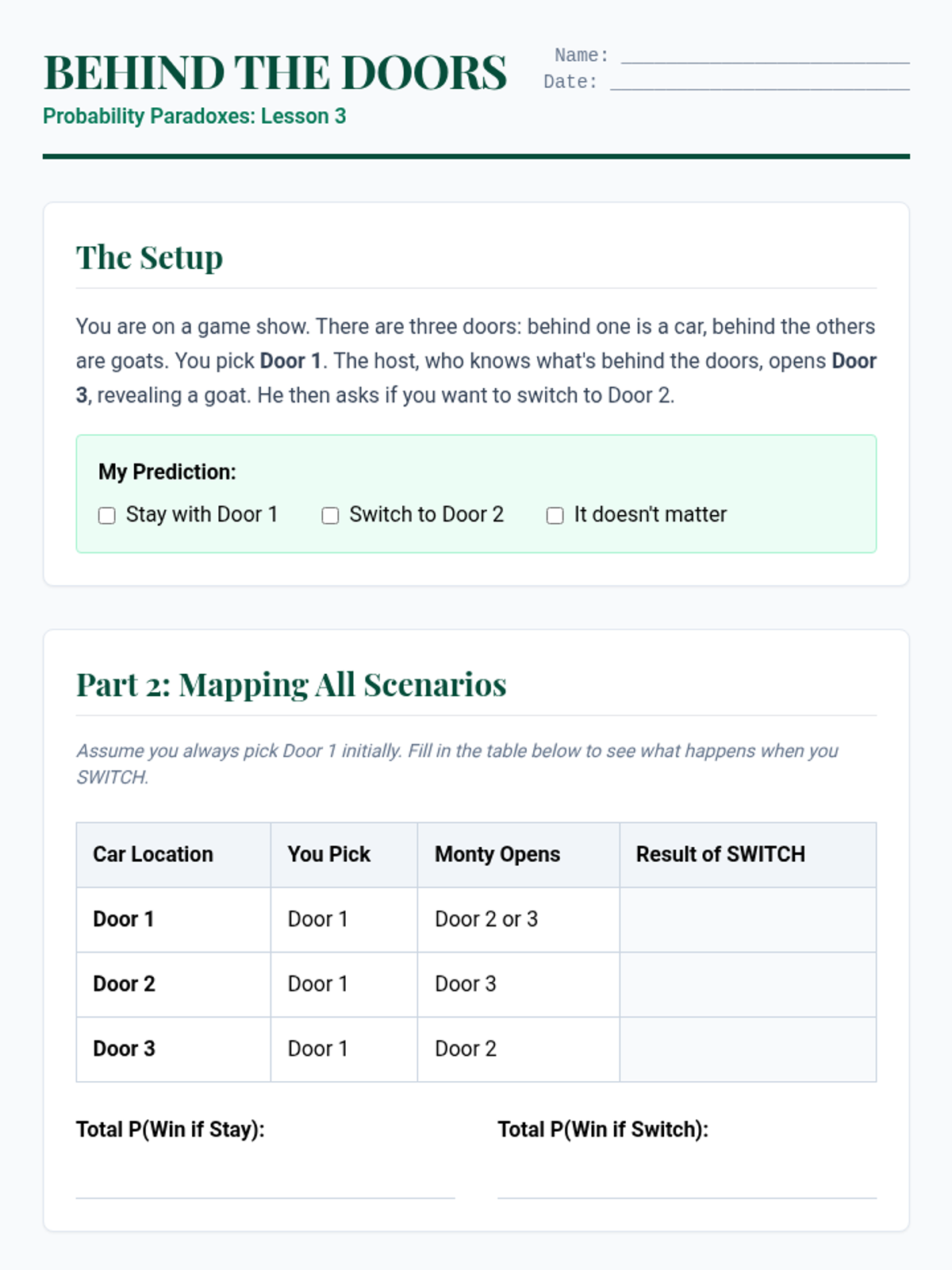 An inquiry-driven investigation into counter-intuitive probability. Students explore the Birthday Problem, Gambler's Fallacy, Monty Hall Problem, and Simpson's Paradox to understand why human intuition often fails in the face of compound event logic.