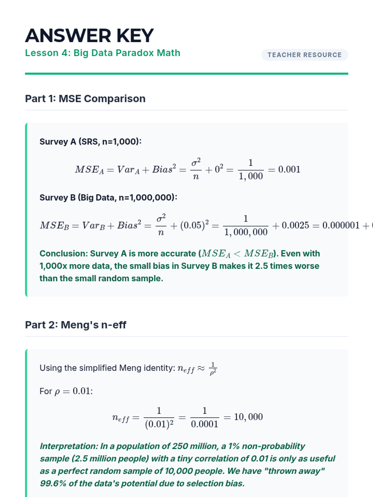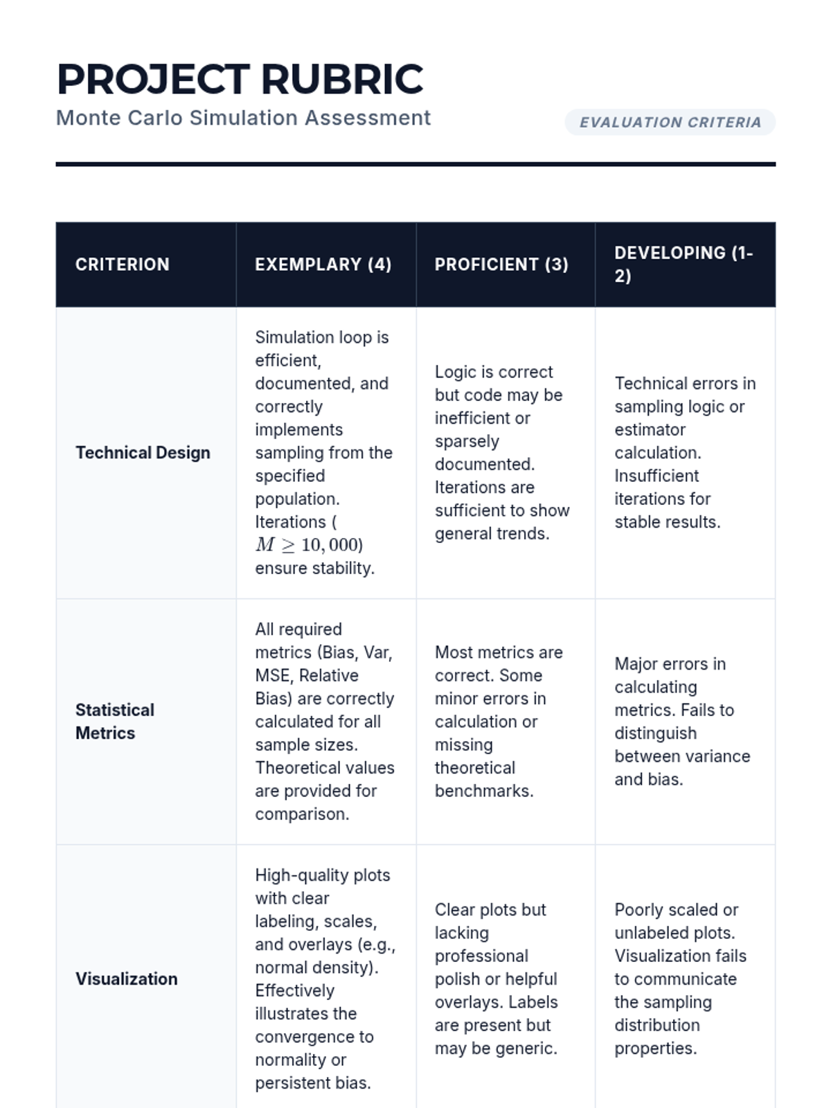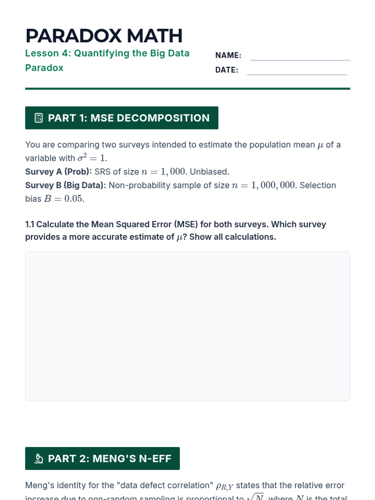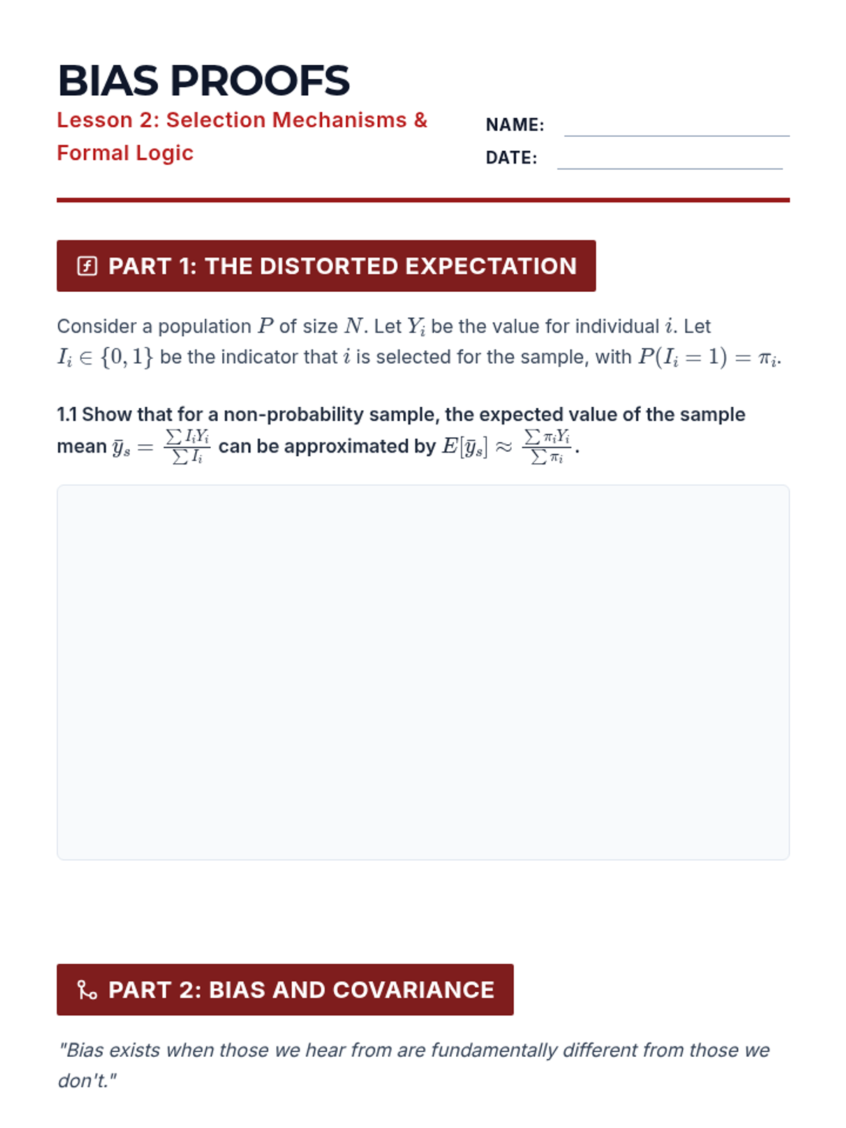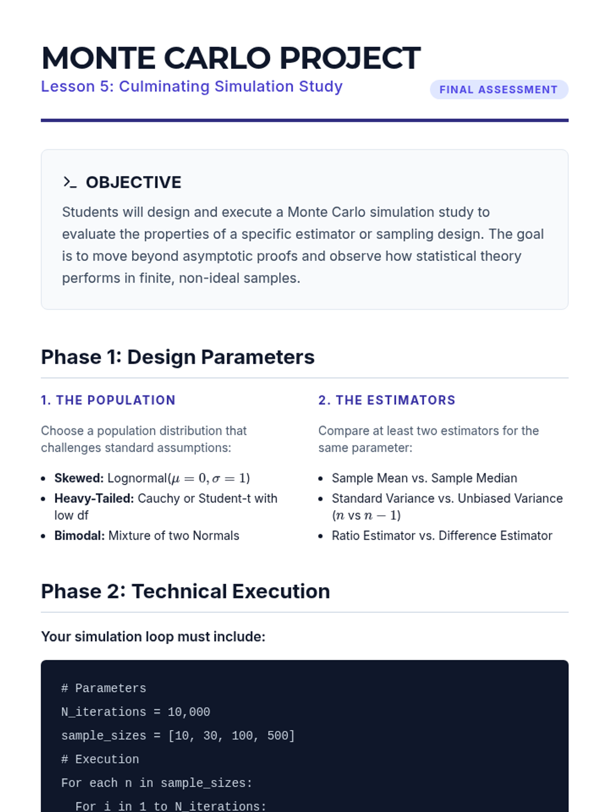 A rigorous graduate-level examination of probability sampling theory, focusing on the mathematical properties of estimators, the mechanics of selection bias, and the use of Monte Carlo simulations to validate sampling designs. Students explore simple random sampling, sampling frame errors, and the 'Big Data Paradox' through proofs and simulation logic.