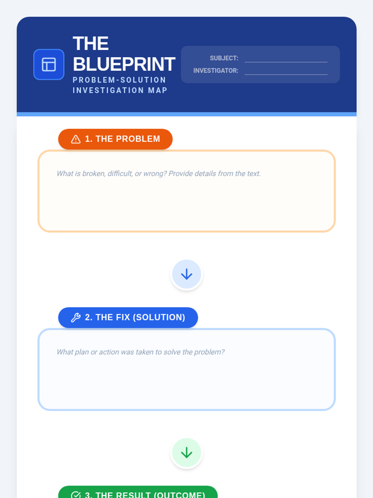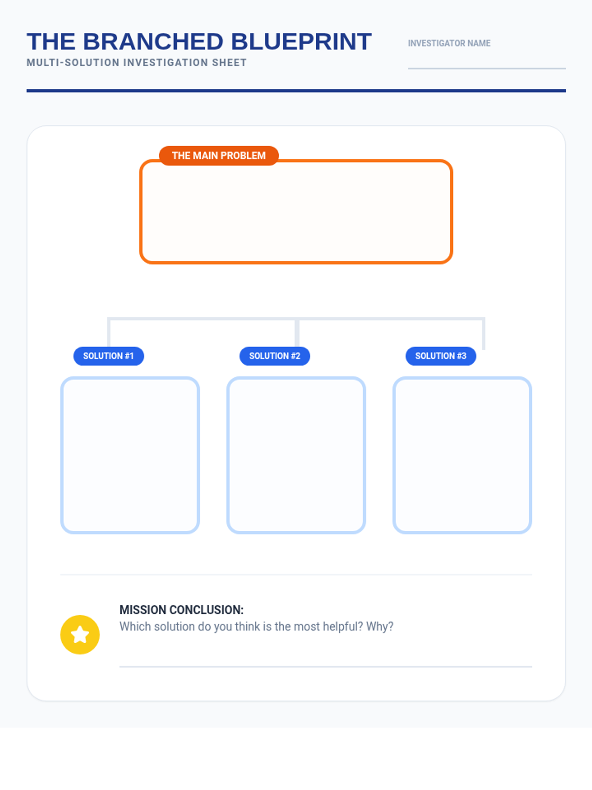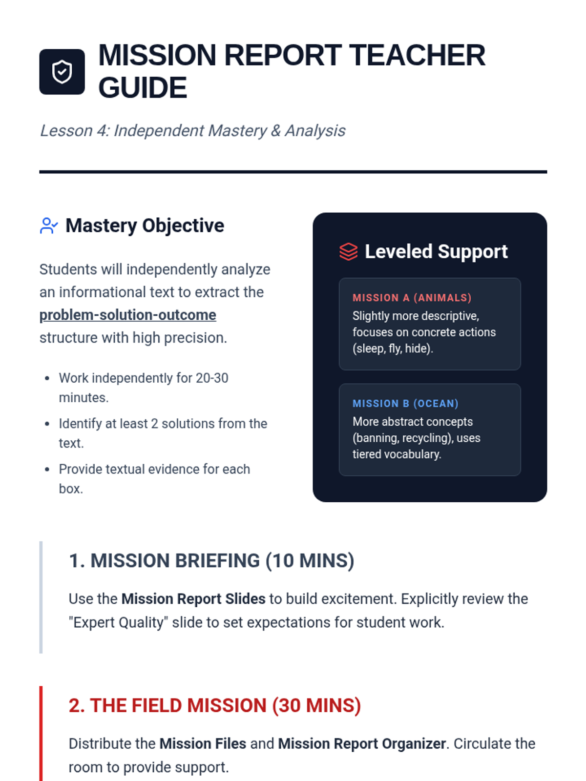 A 5-lesson sequence for 4th-grade students focused on mastering the Problem-Solution text structure through visual graphic organizers. Students move from simple matching to complex multi-solution analysis, culminating in an independent research mission and presentation.