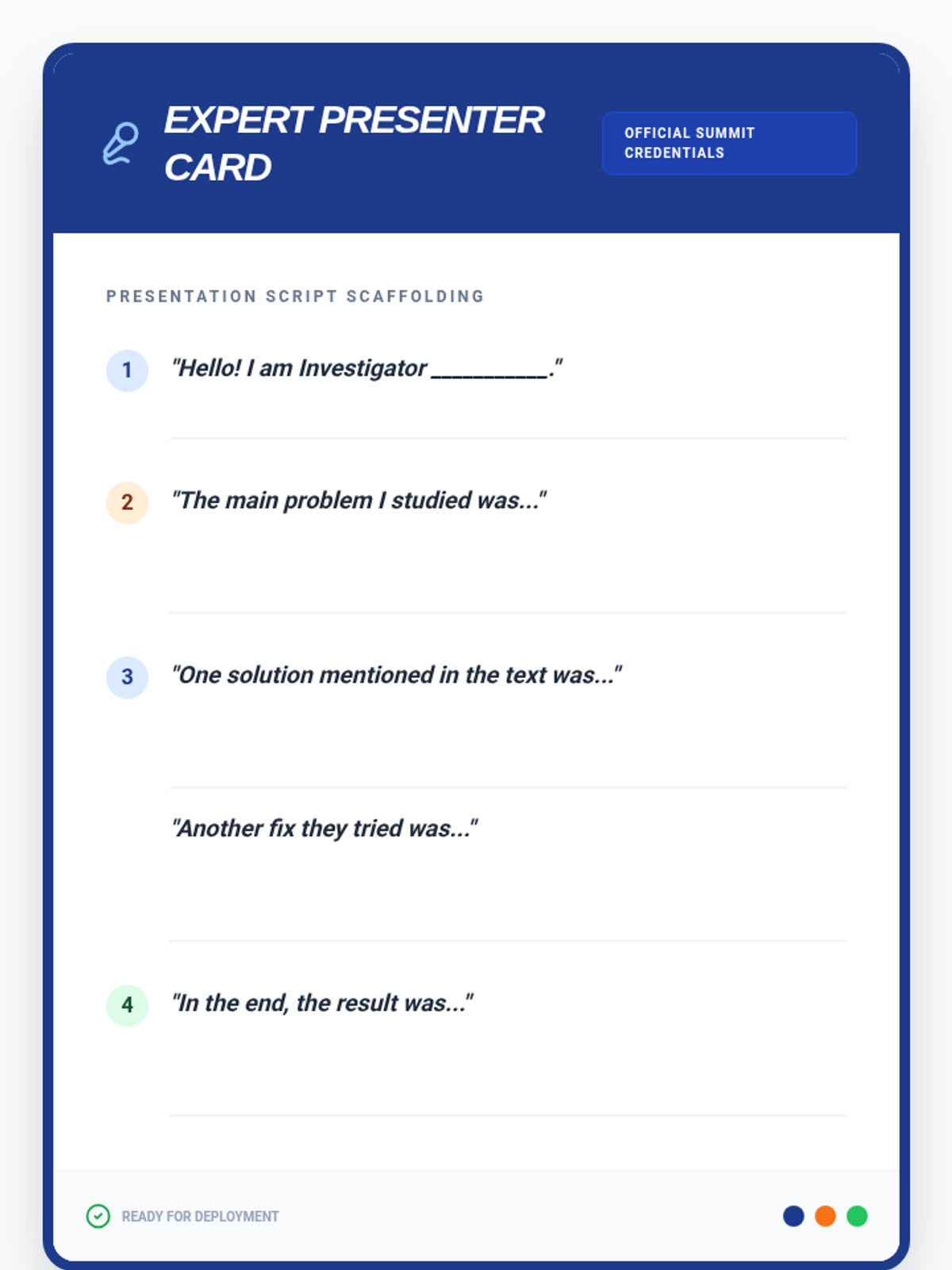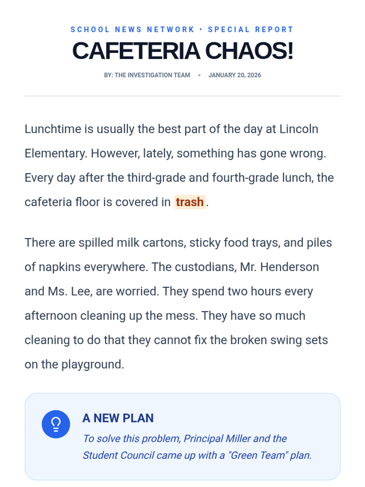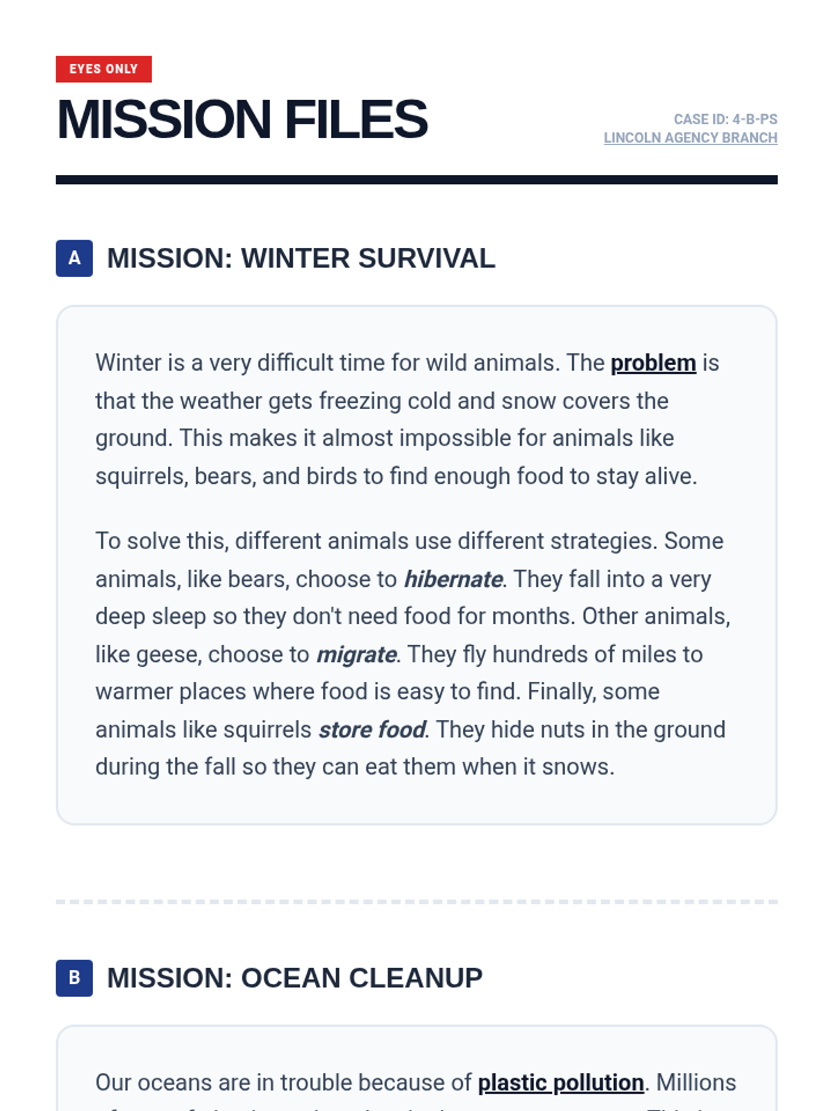 A 5-lesson sequence for 4th-grade students focused on mastering the Problem-Solution text structure through visual graphic organizers. Students move from simple matching to complex multi-solution analysis, culminating in an independent research mission and presentation.