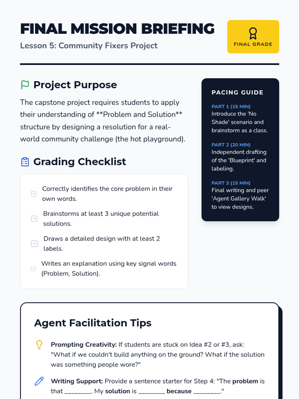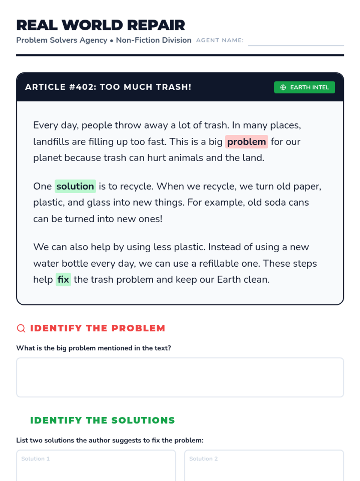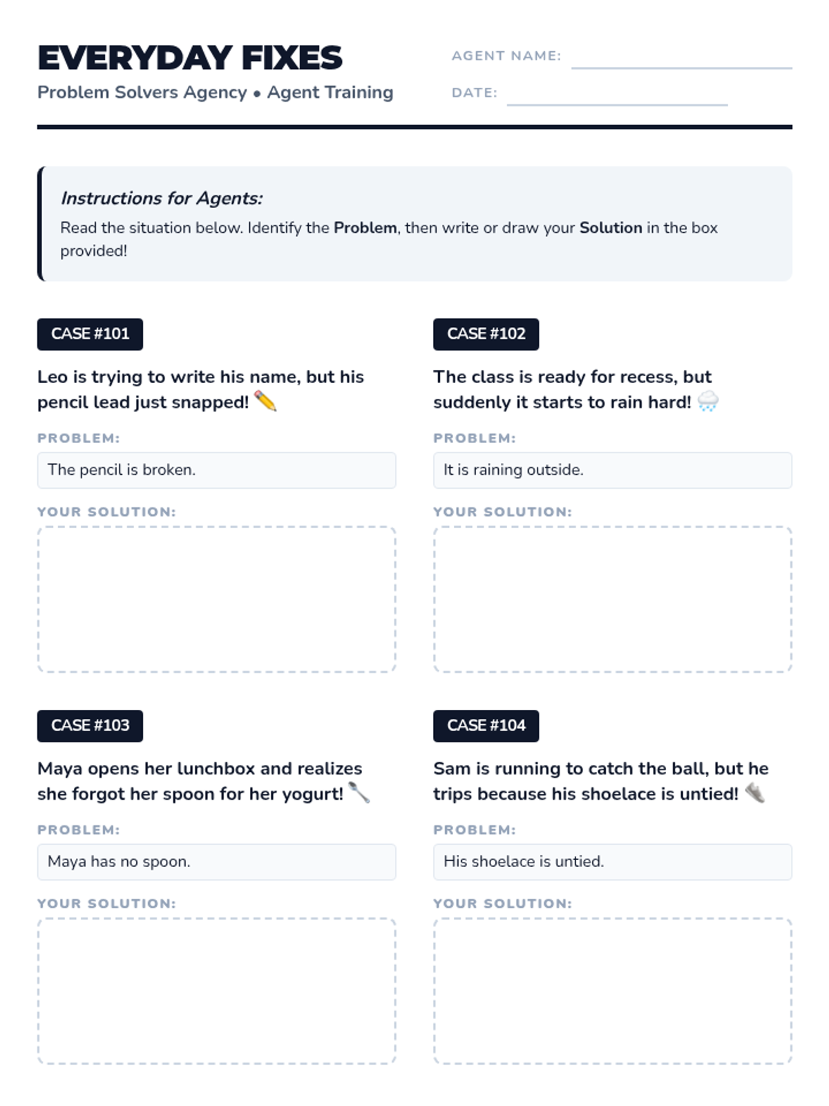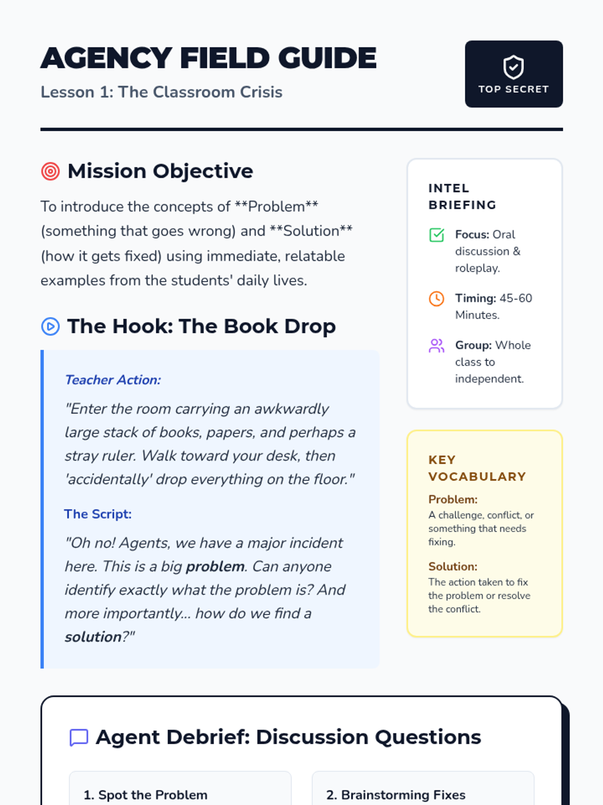 Students become agents of the 'Problem Solvers Agency' to master the text structure of conflict and resolution. They move from real-world scenarios to fairy tales, informational texts, and finally design their own solutions to community challenges.