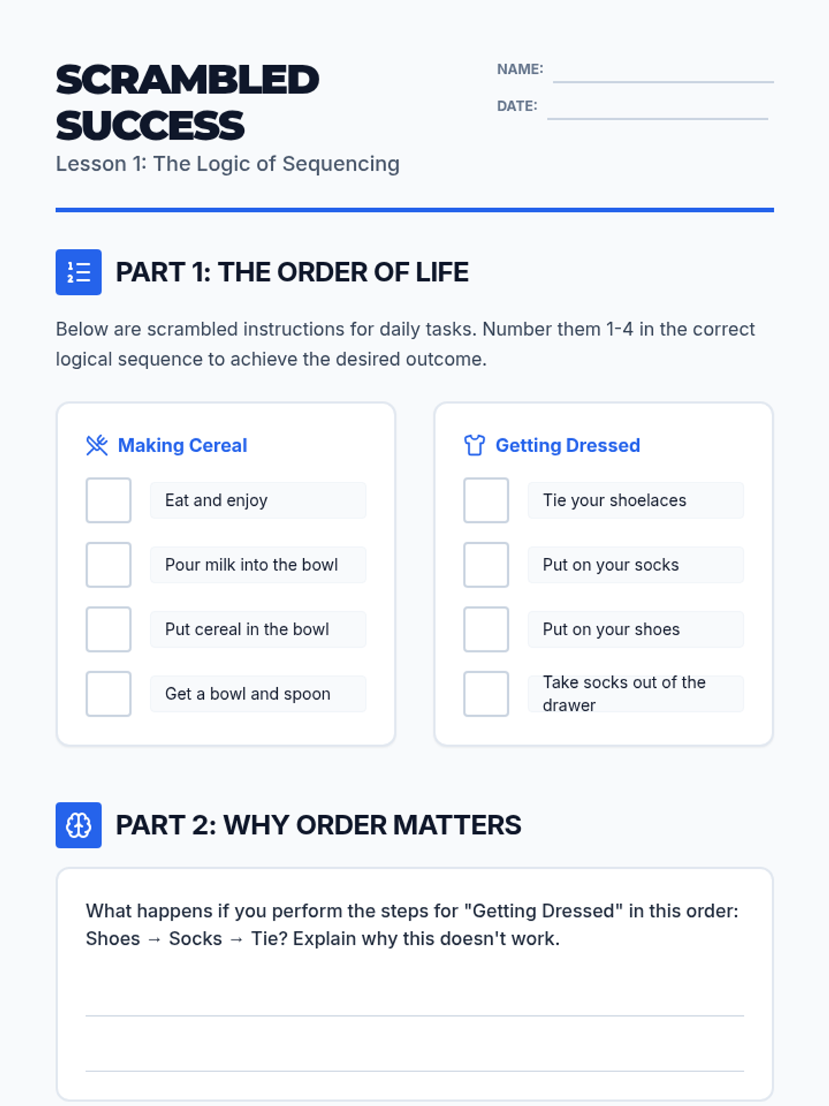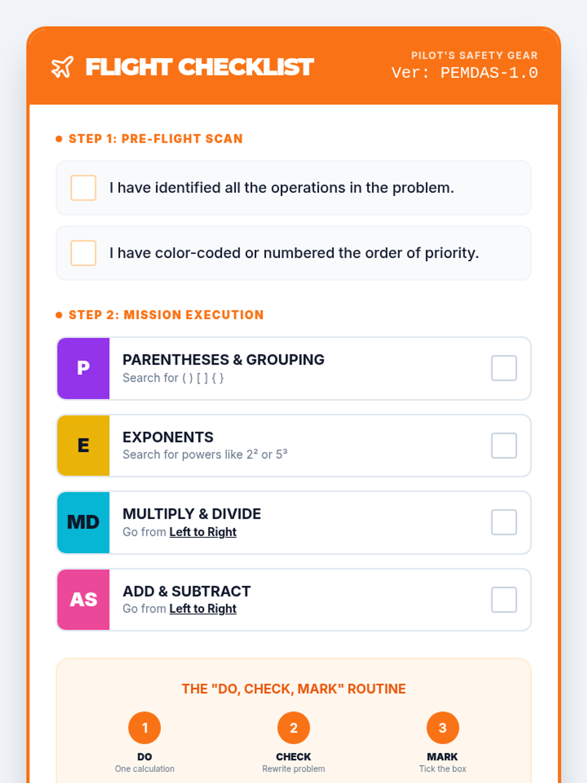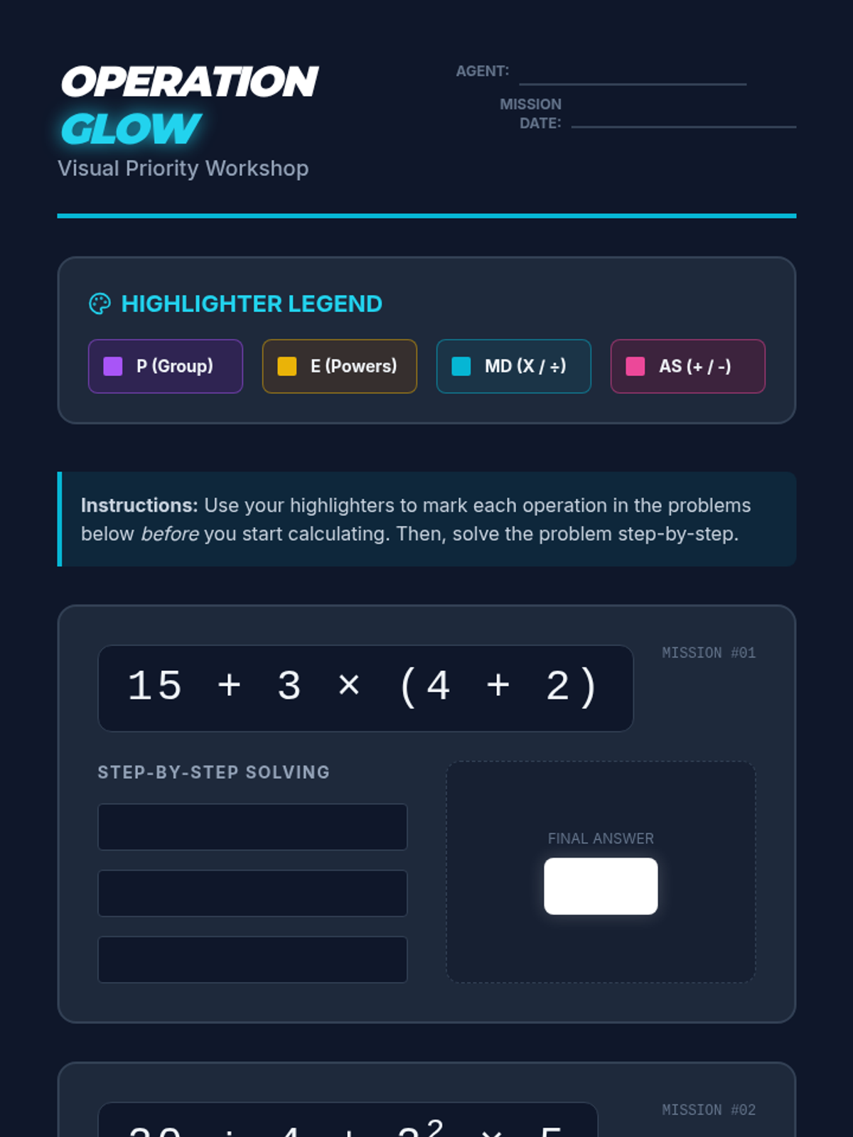 A specialized math sequence for 6th-grade students with executive function needs, focusing on systematic approaches to the Order of Operations (PEMDAS) using color-coding, checklists, and error analysis.