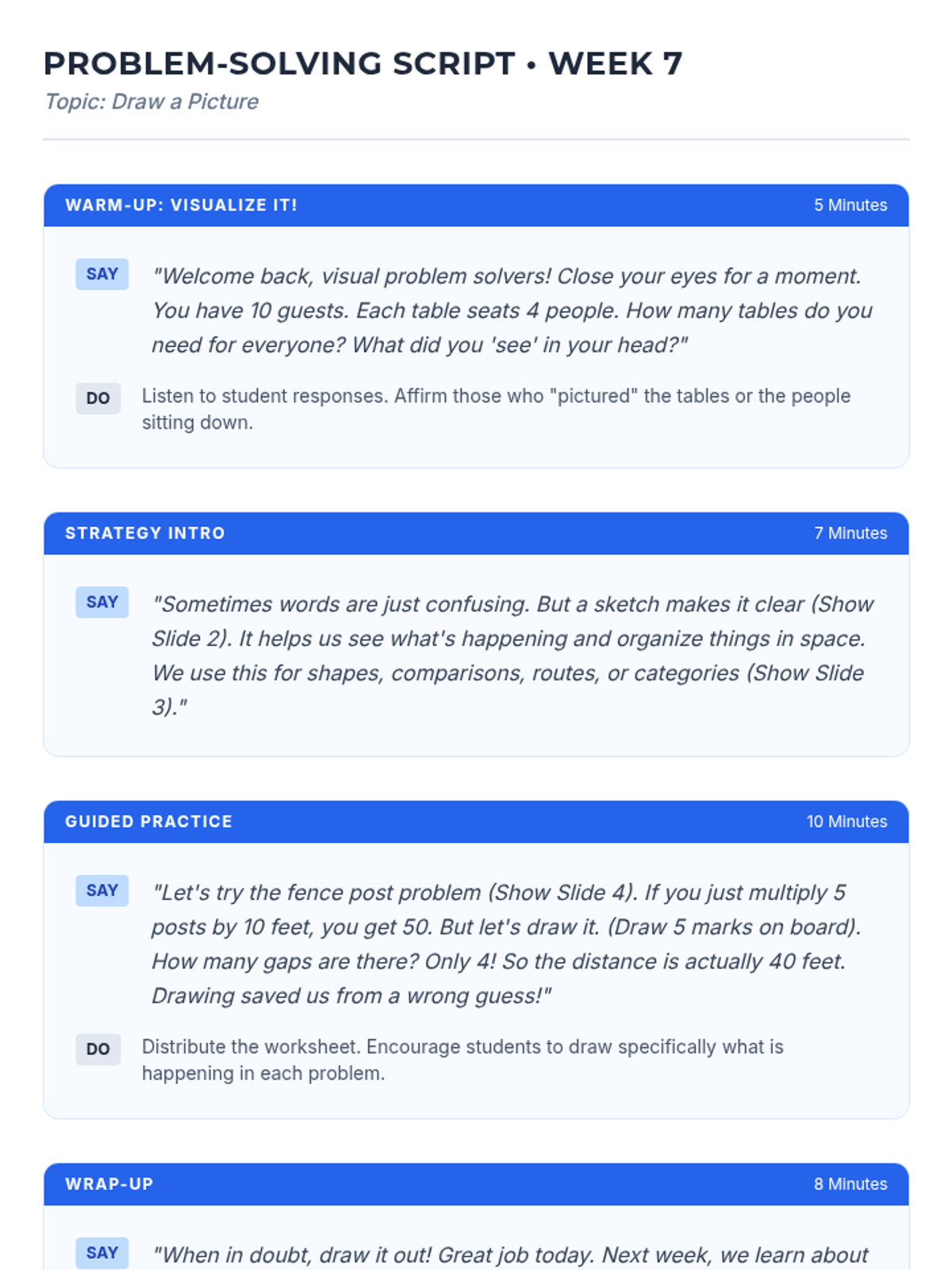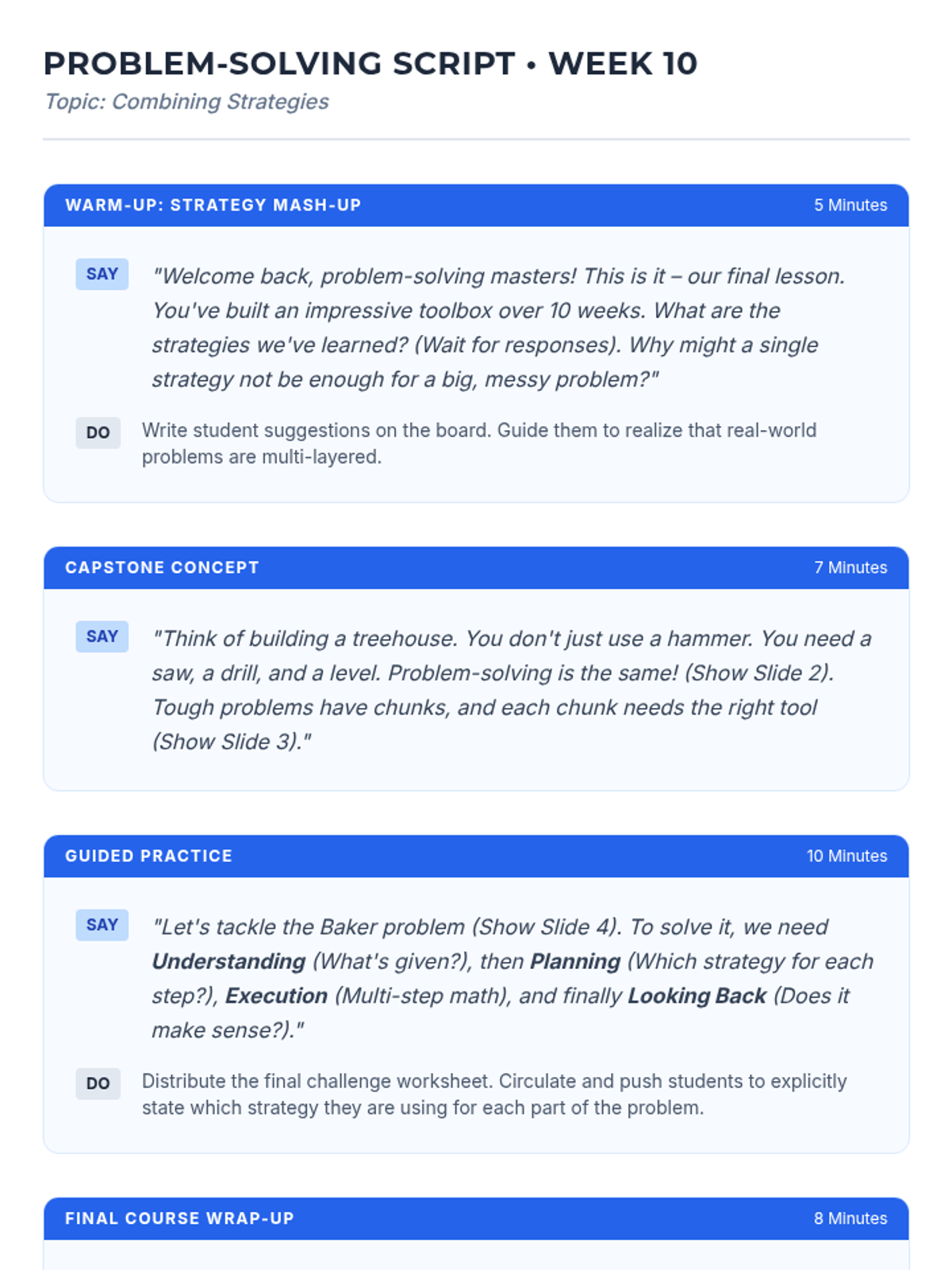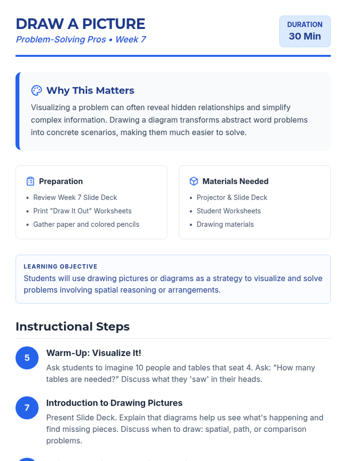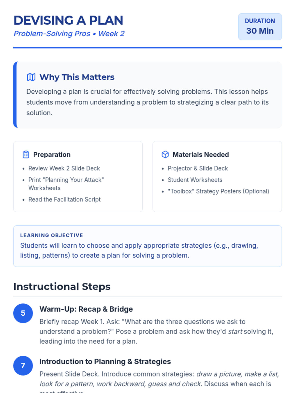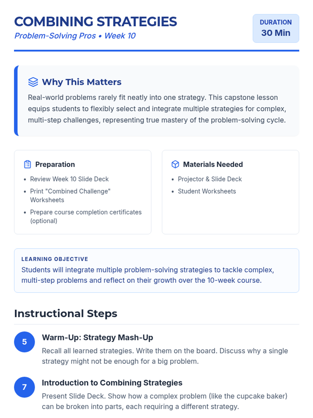 A ten-week Tier 2 intervention program for 7th graders focused on Polya's four-step problem-solving process and specific mathematical strategies. Each session is designed for 30 minutes and includes visual instruction, guided practice, and independent reflection.
