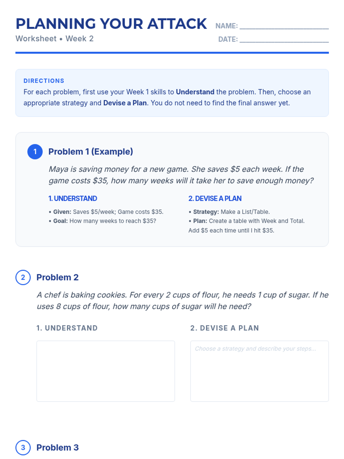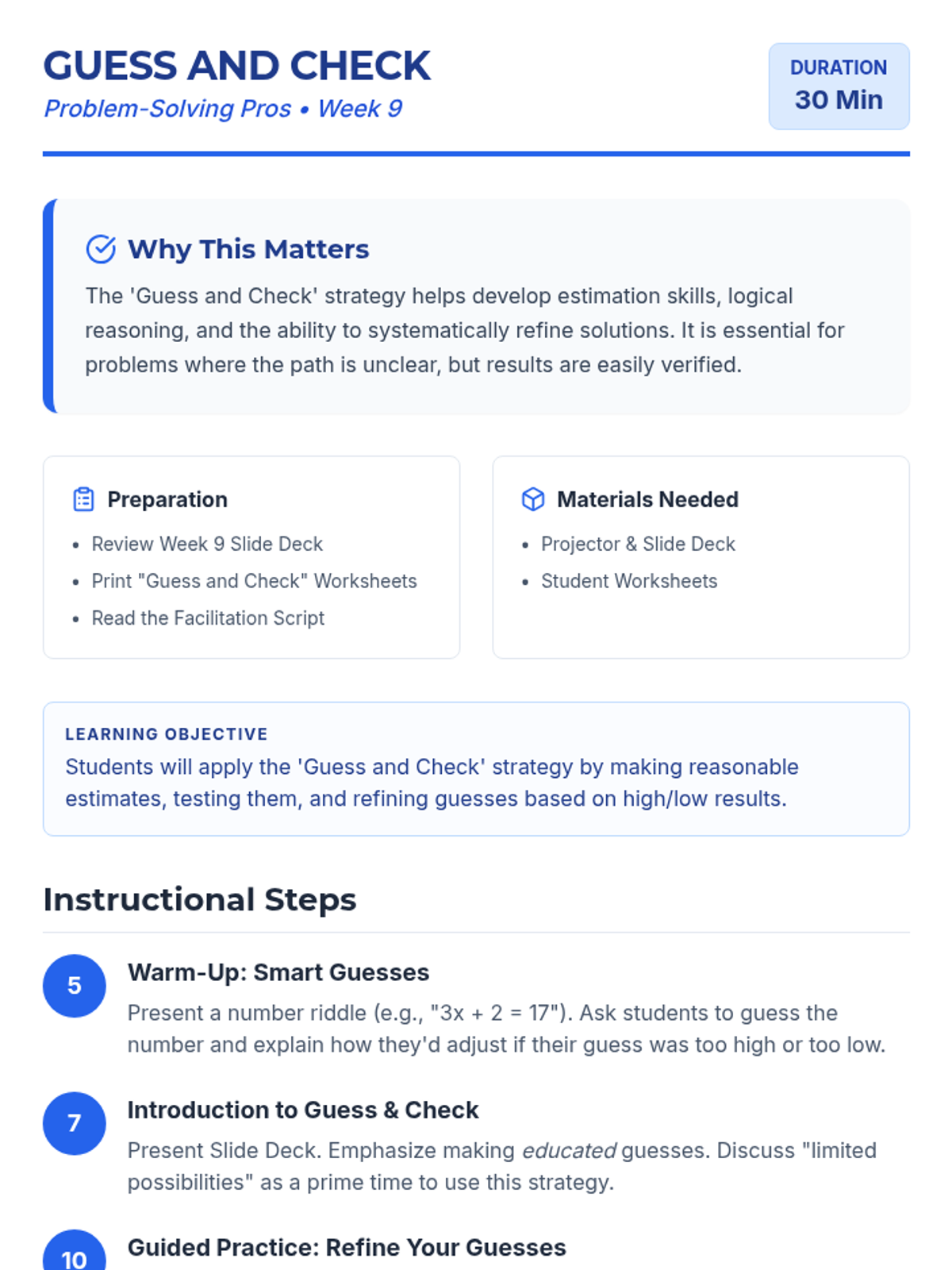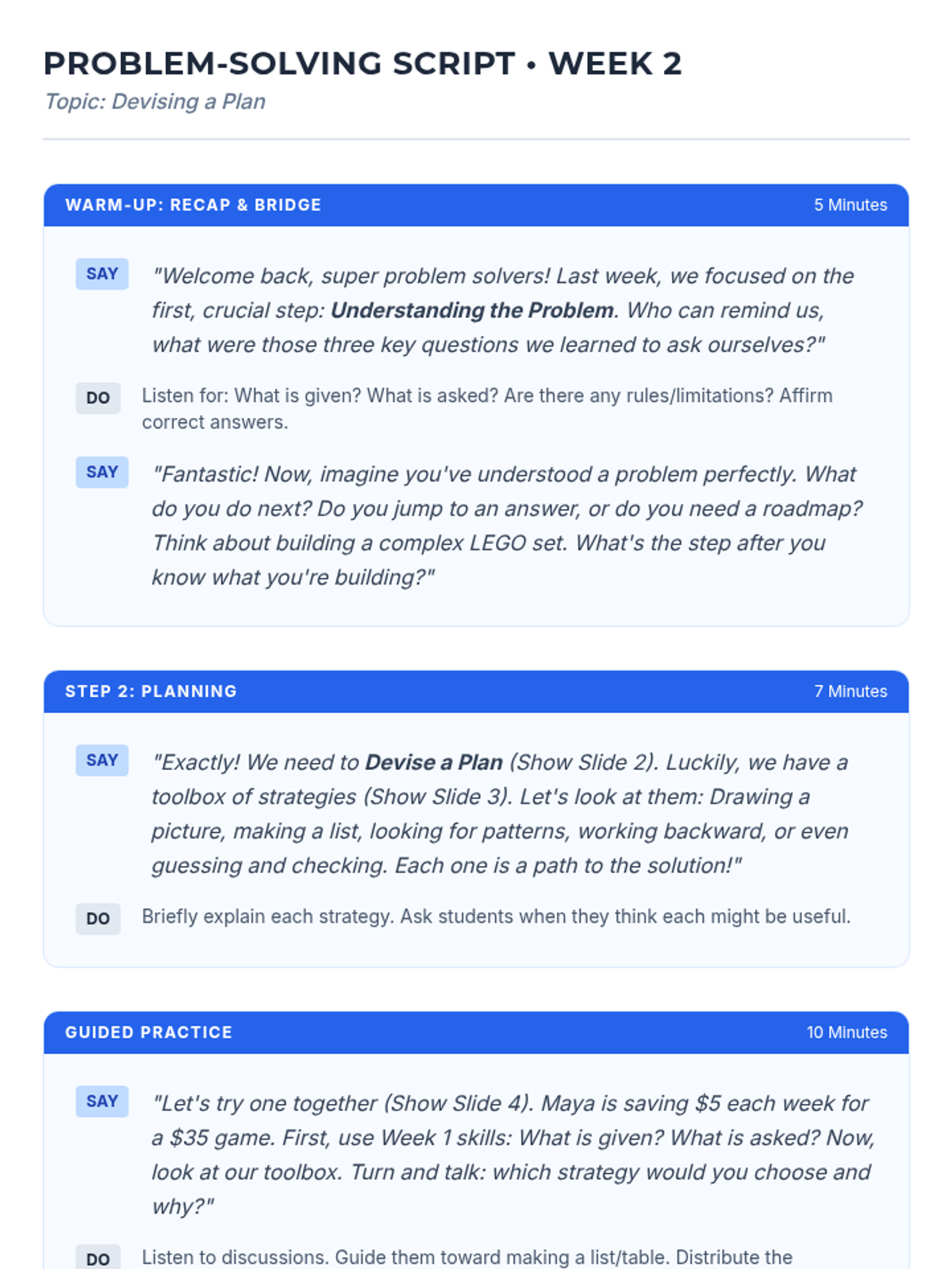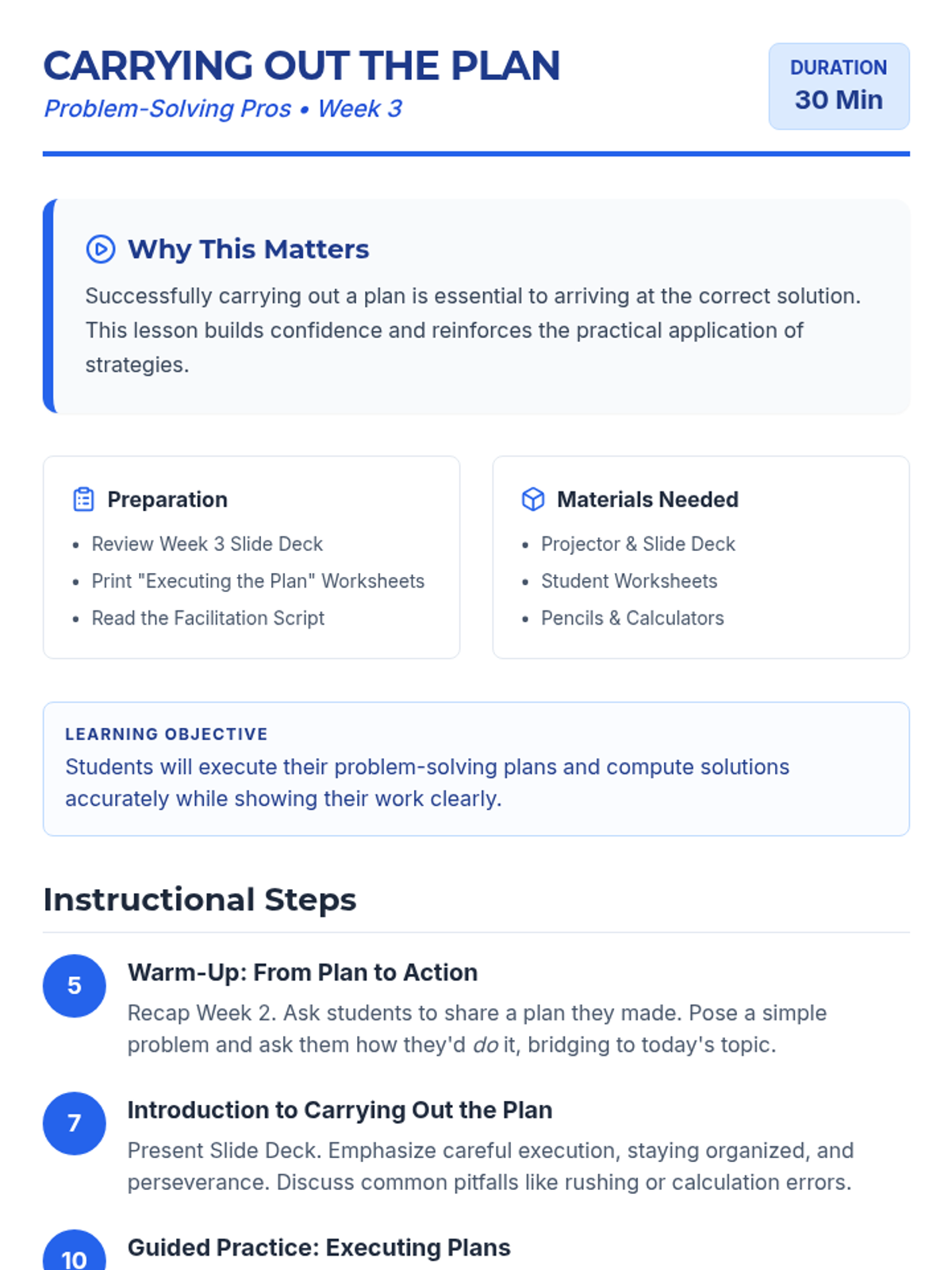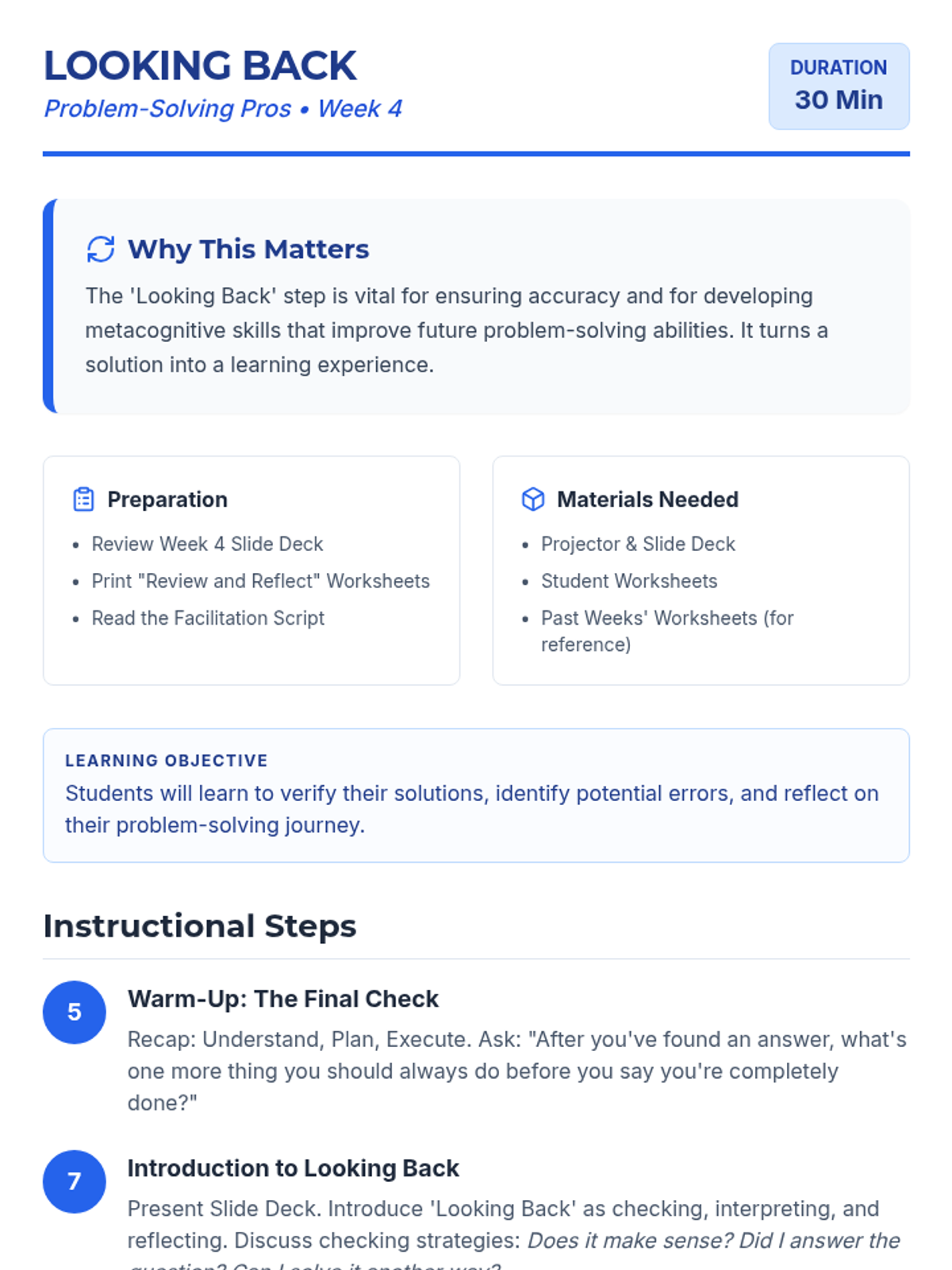 A ten-week Tier 2 intervention program for 7th graders focused on Polya's four-step problem-solving process and specific mathematical strategies. Each session is designed for 30 minutes and includes visual instruction, guided practice, and independent reflection.