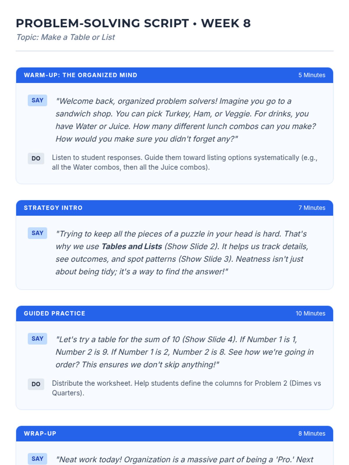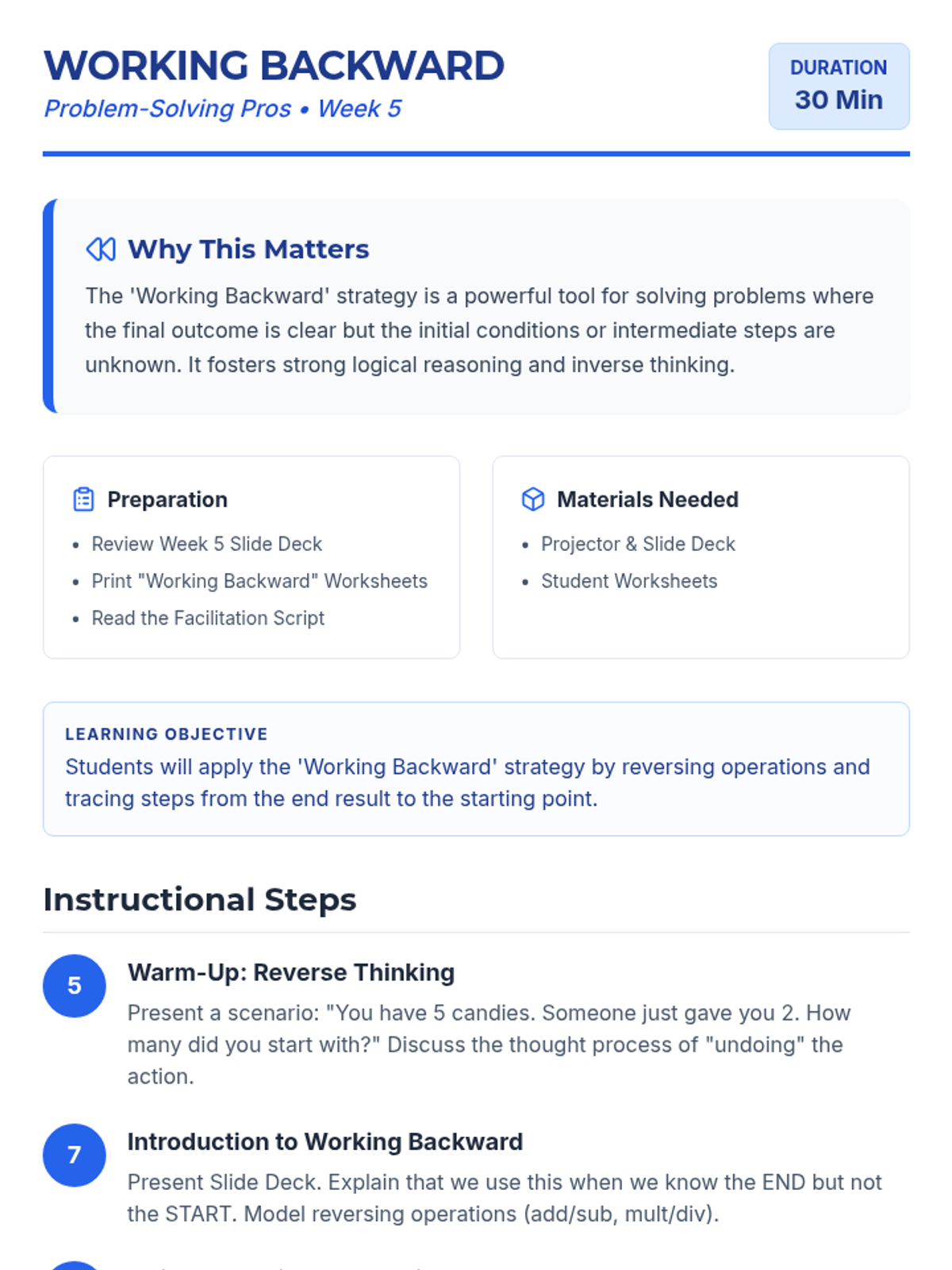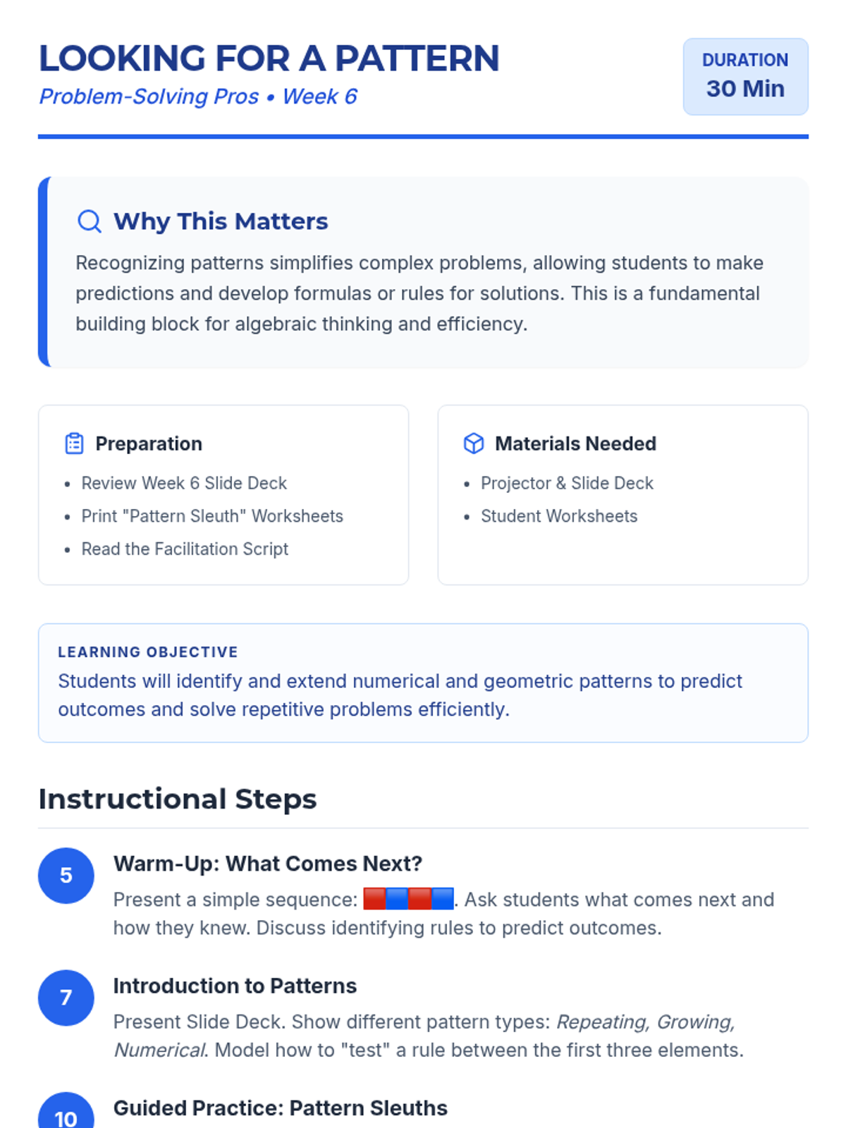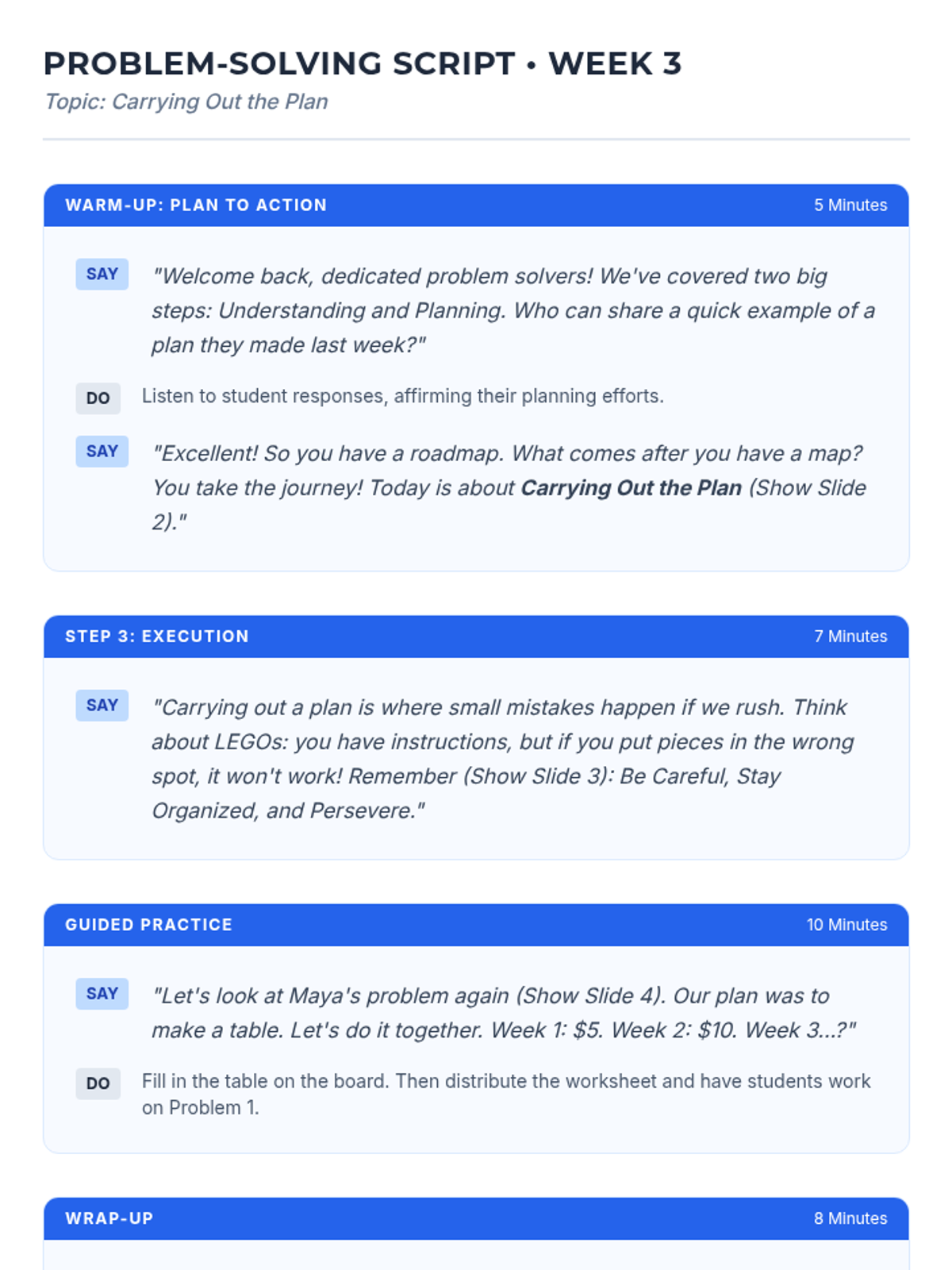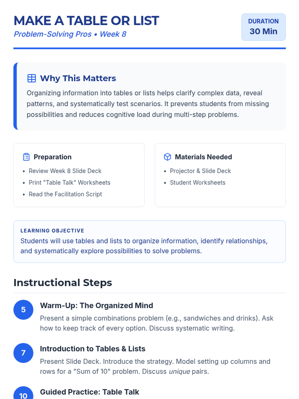 A ten-week Tier 2 intervention program for 7th graders focused on Polya's four-step problem-solving process and specific mathematical strategies. Each session is designed for 30 minutes and includes visual instruction, guided practice, and independent reflection.