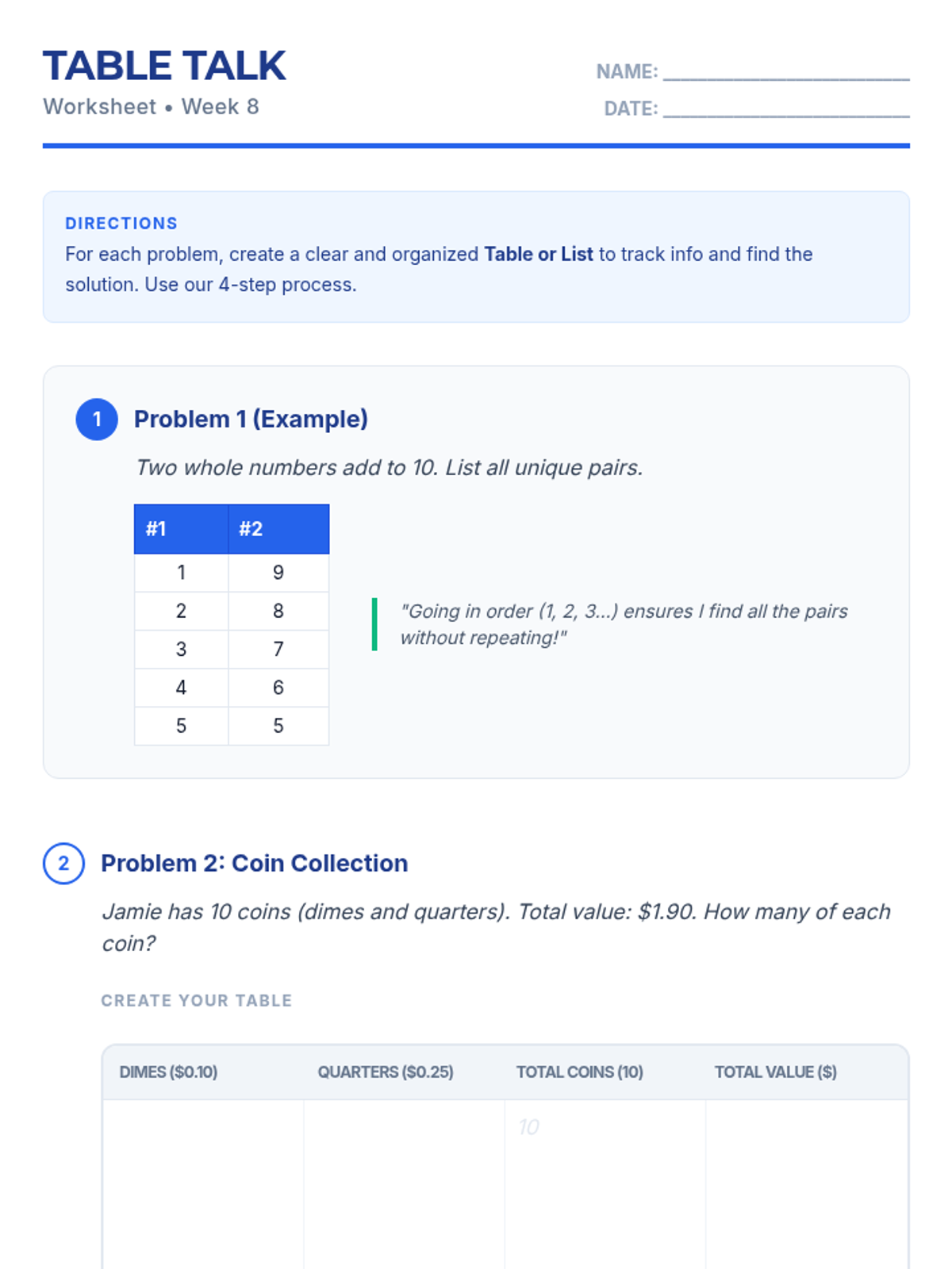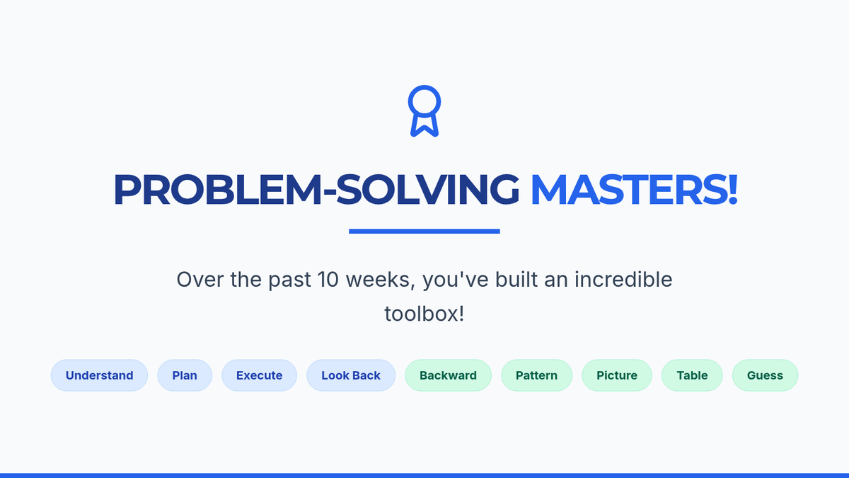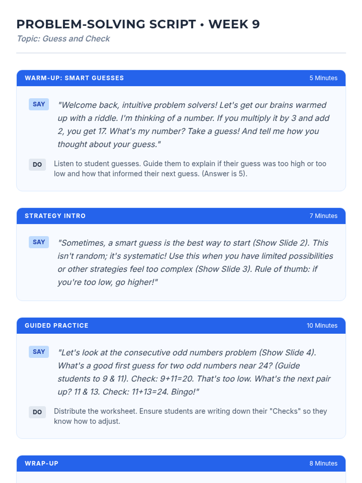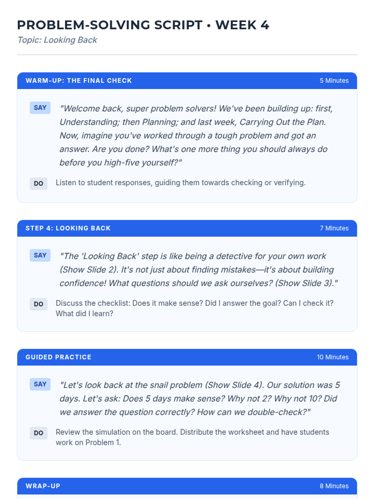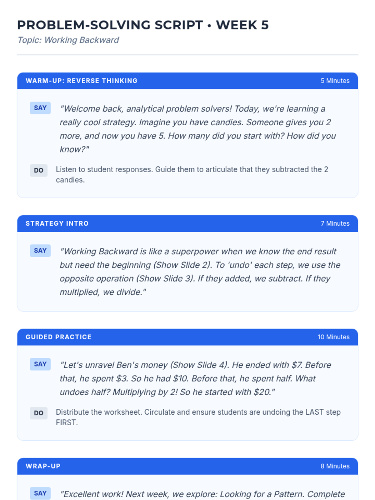 A ten-week Tier 2 intervention program for 7th graders focused on Polya's four-step problem-solving process and specific mathematical strategies. Each session is designed for 30 minutes and includes visual instruction, guided practice, and independent reflection.