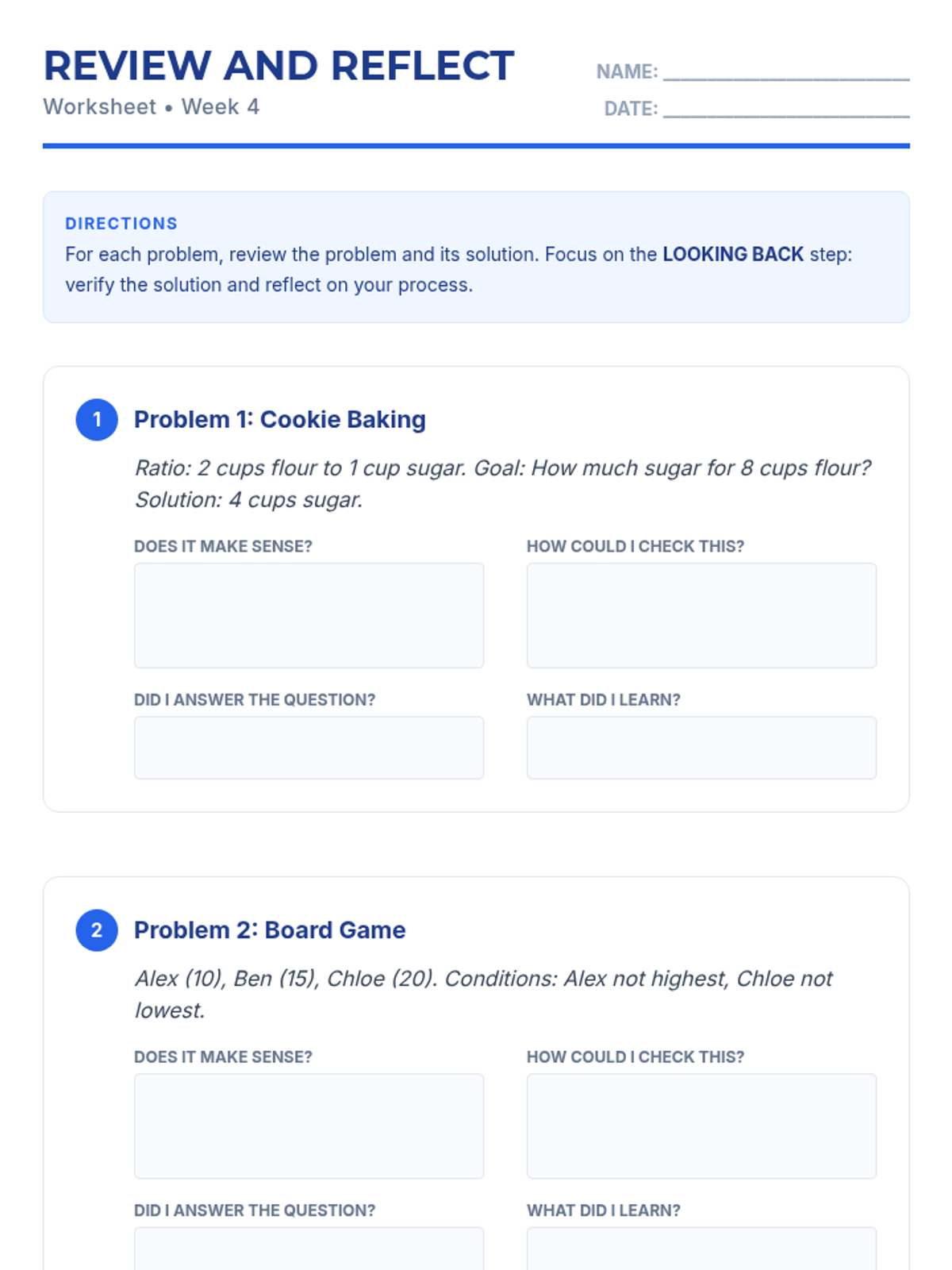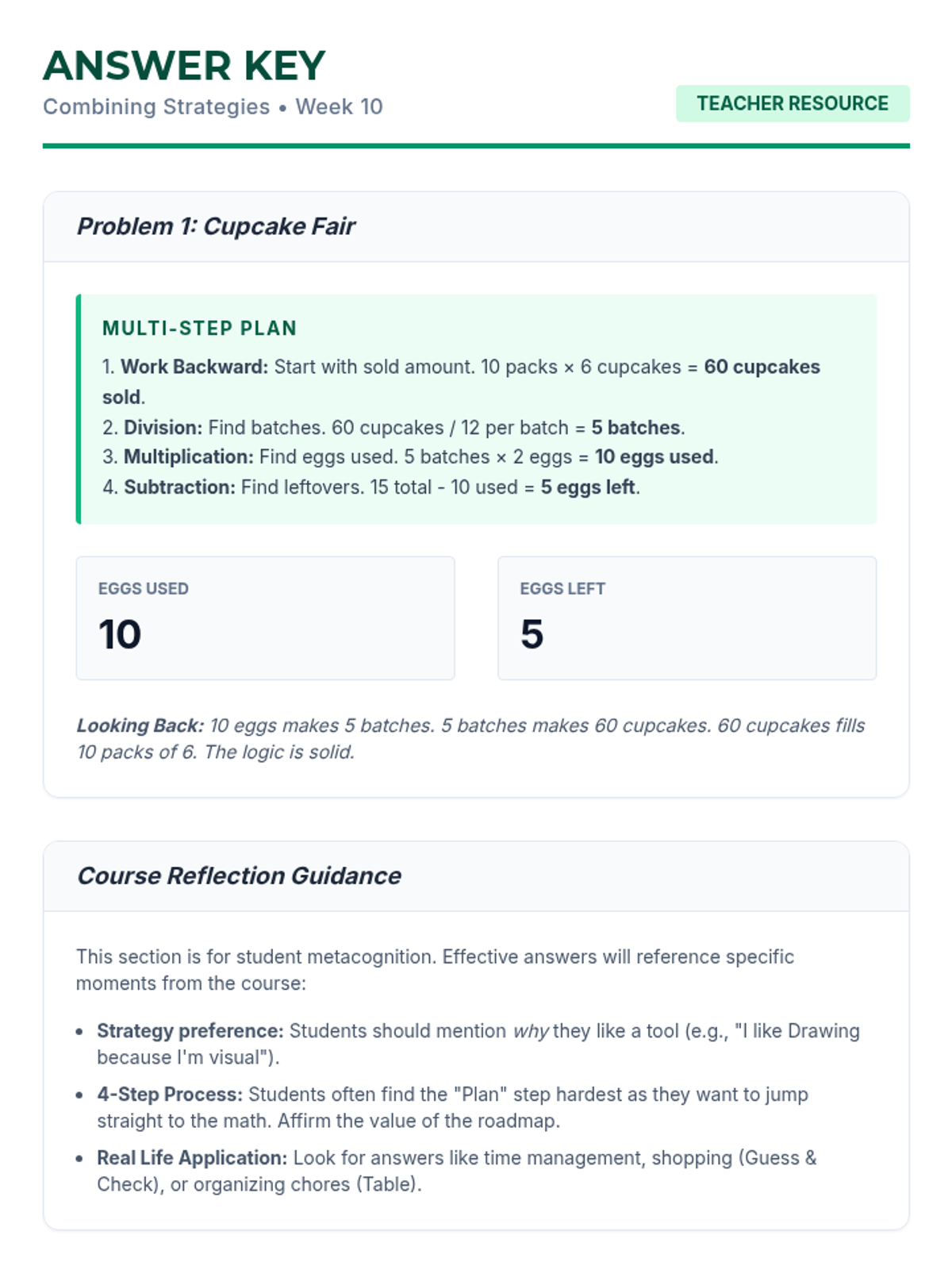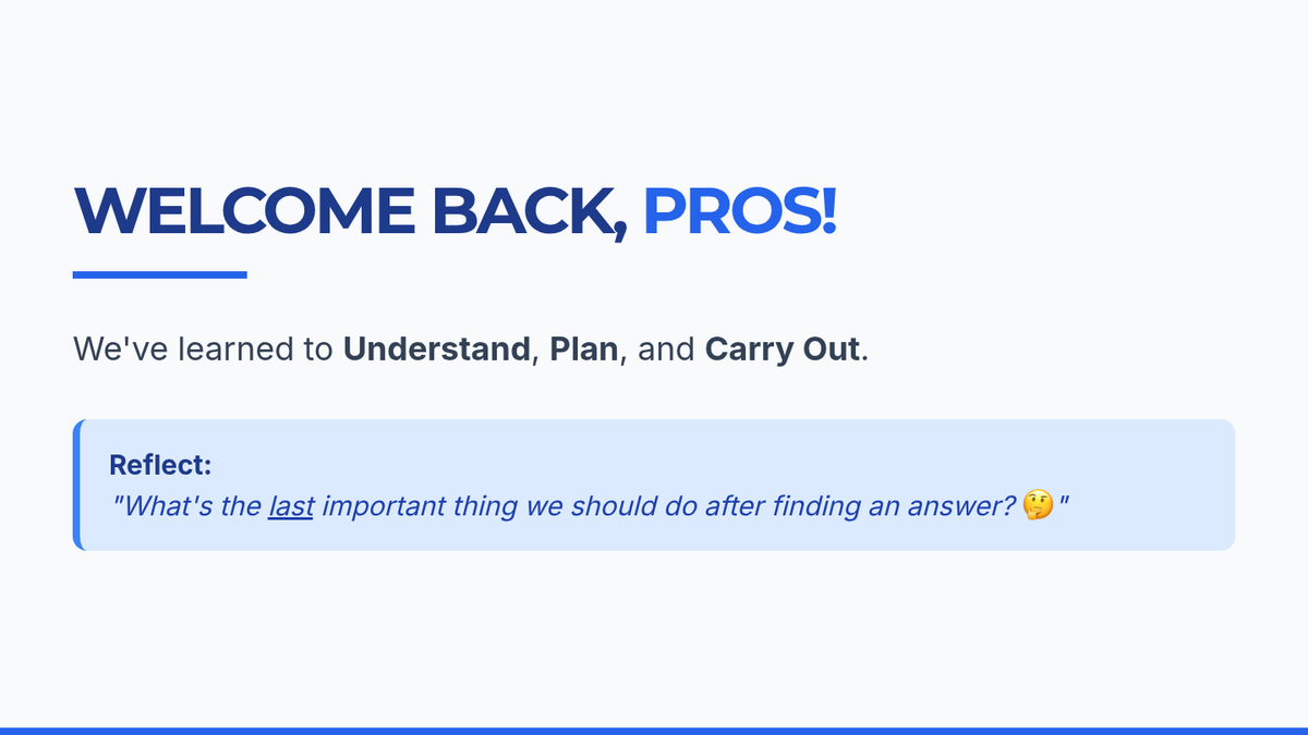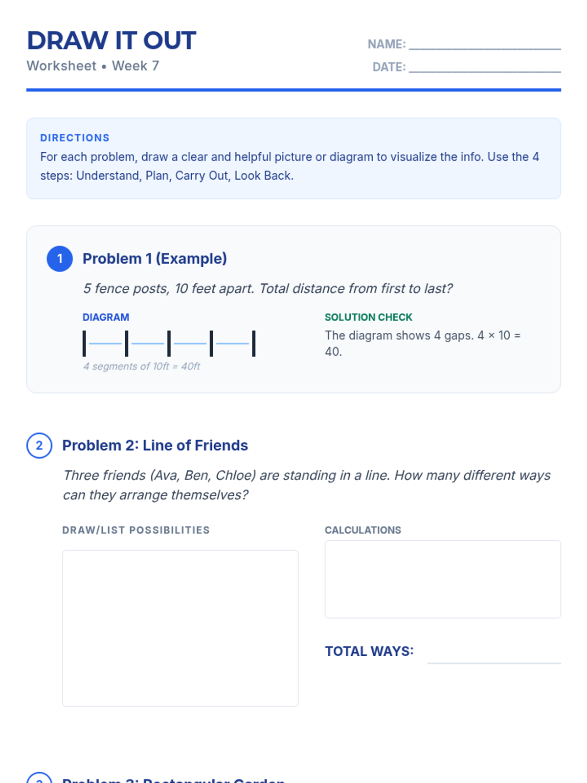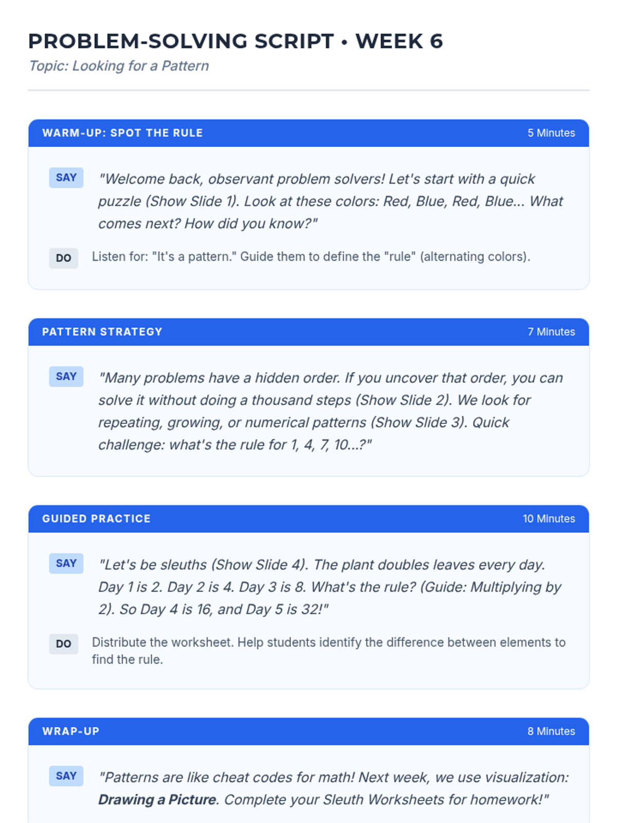 A ten-week Tier 2 intervention program for 7th graders focused on Polya's four-step problem-solving process and specific mathematical strategies. Each session is designed for 30 minutes and includes visual instruction, guided practice, and independent reflection.