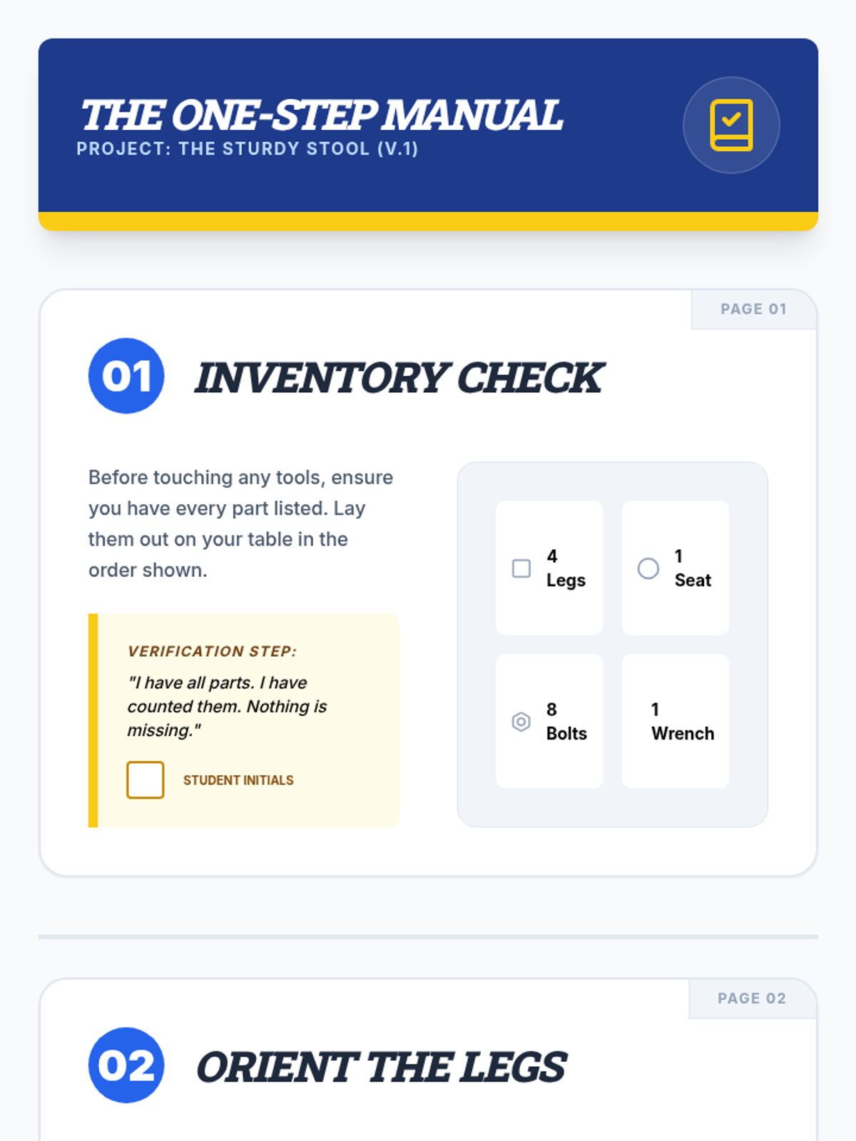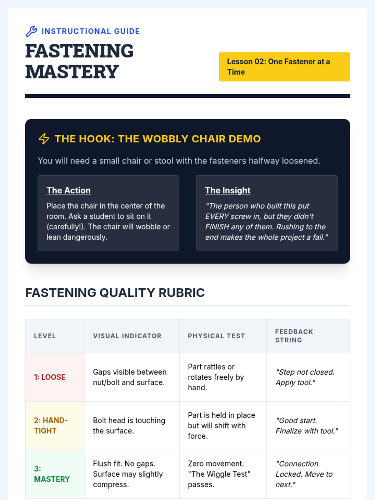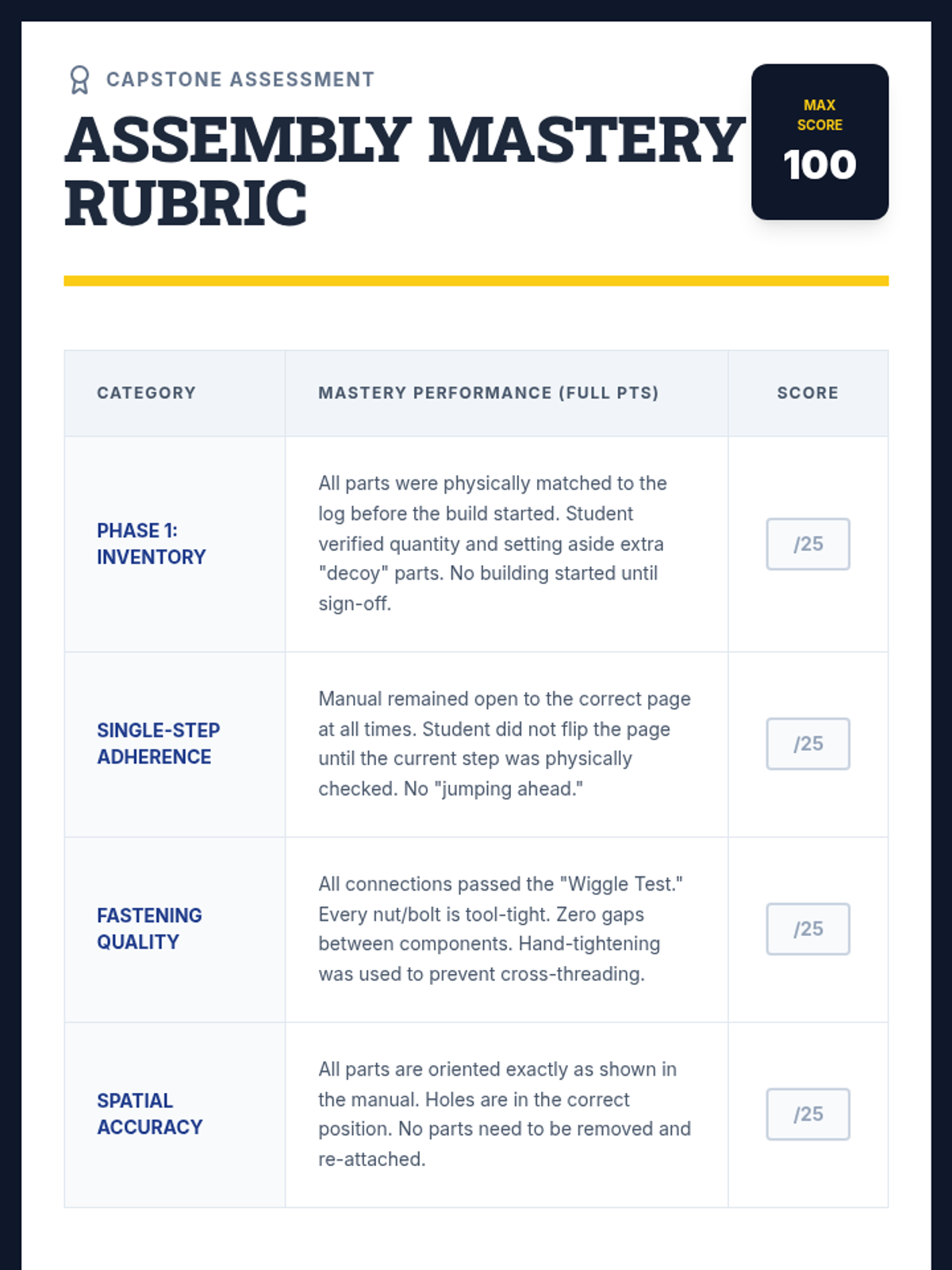 A vocational and life skills sequence focusing on procedural assembly for 12th-grade students with working memory needs. Students practice strict single-step adherence through inventory, fastening, partner systems, and spatial orientation tasks to ensure structural success.