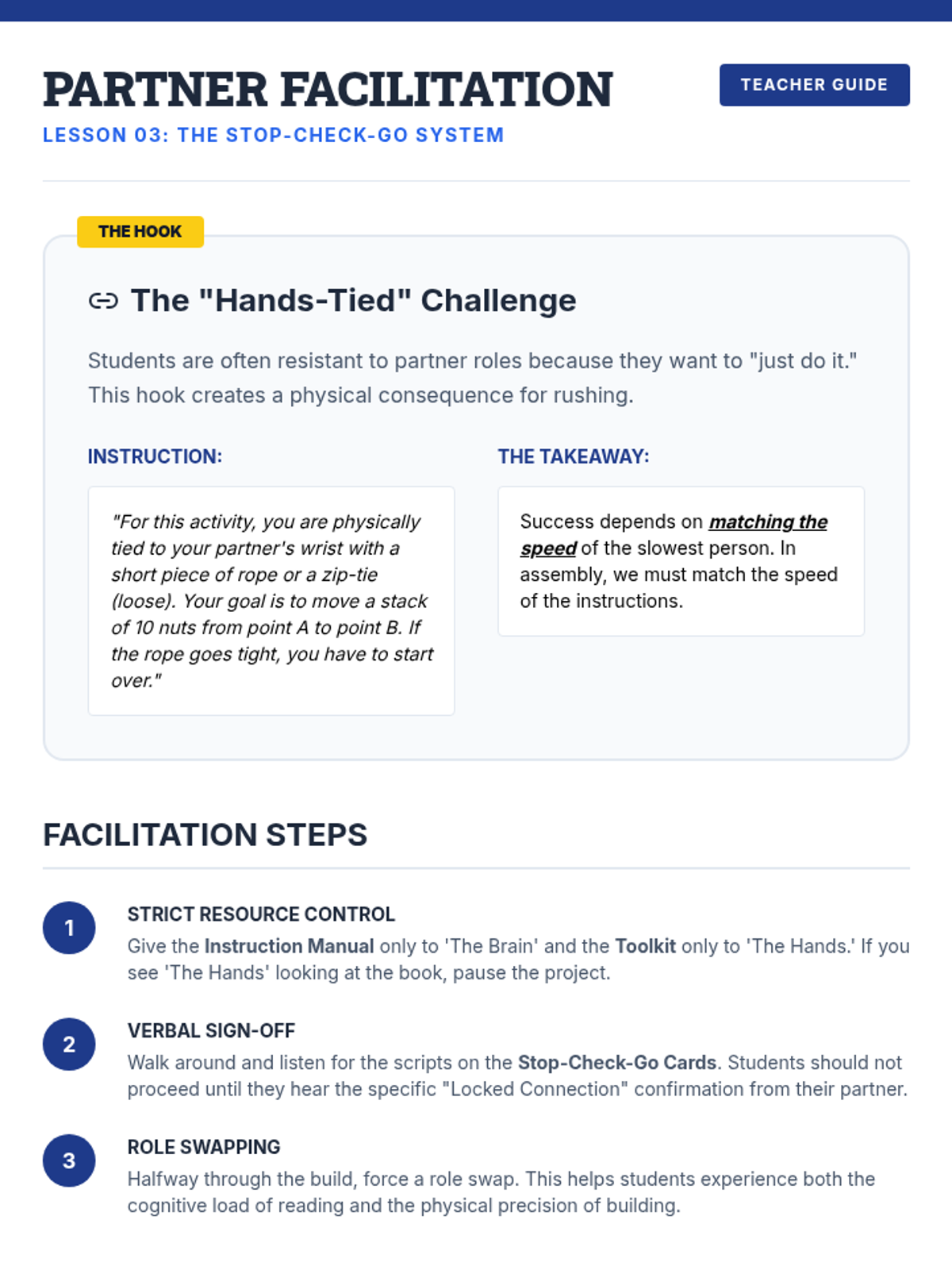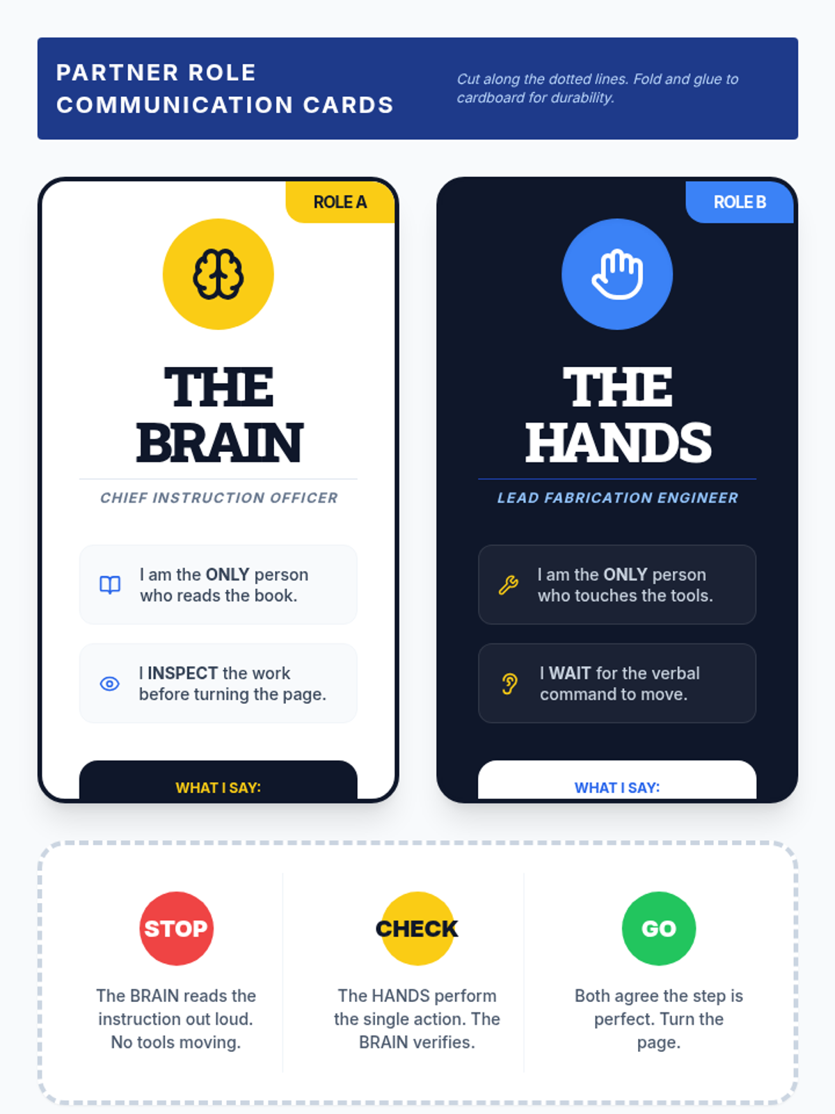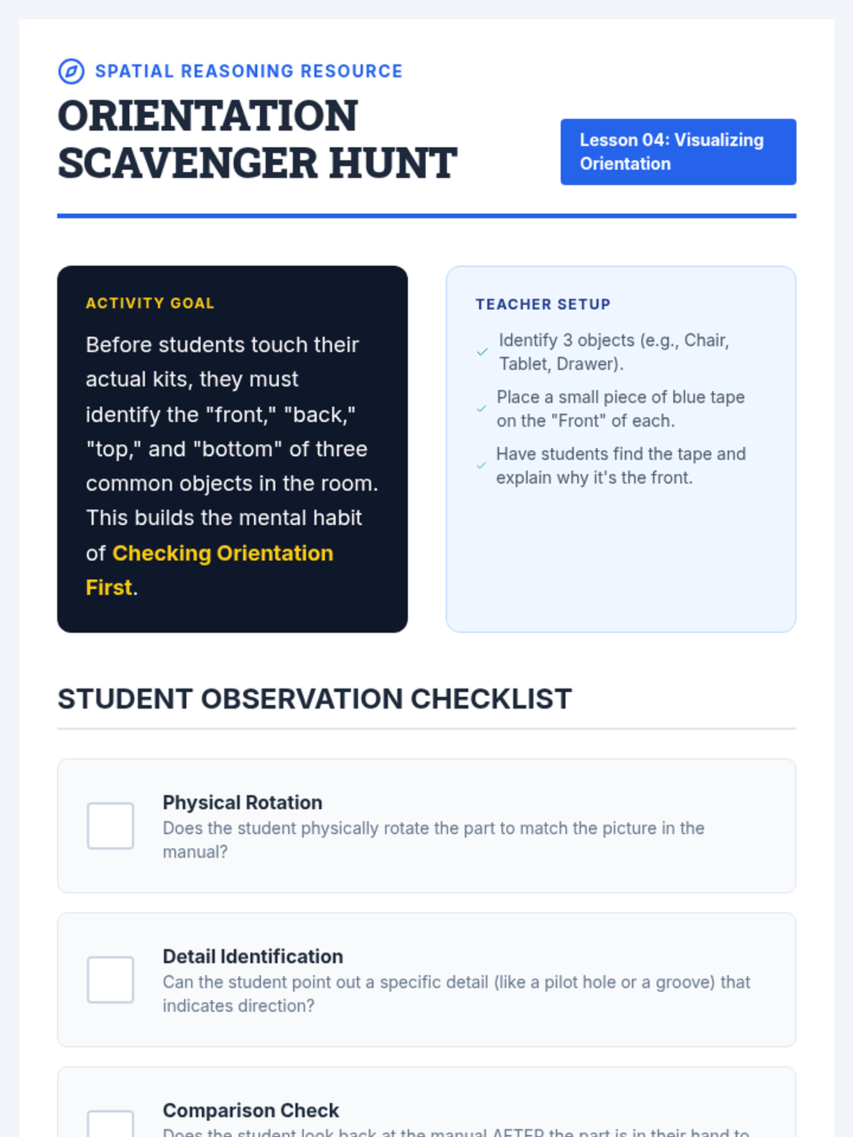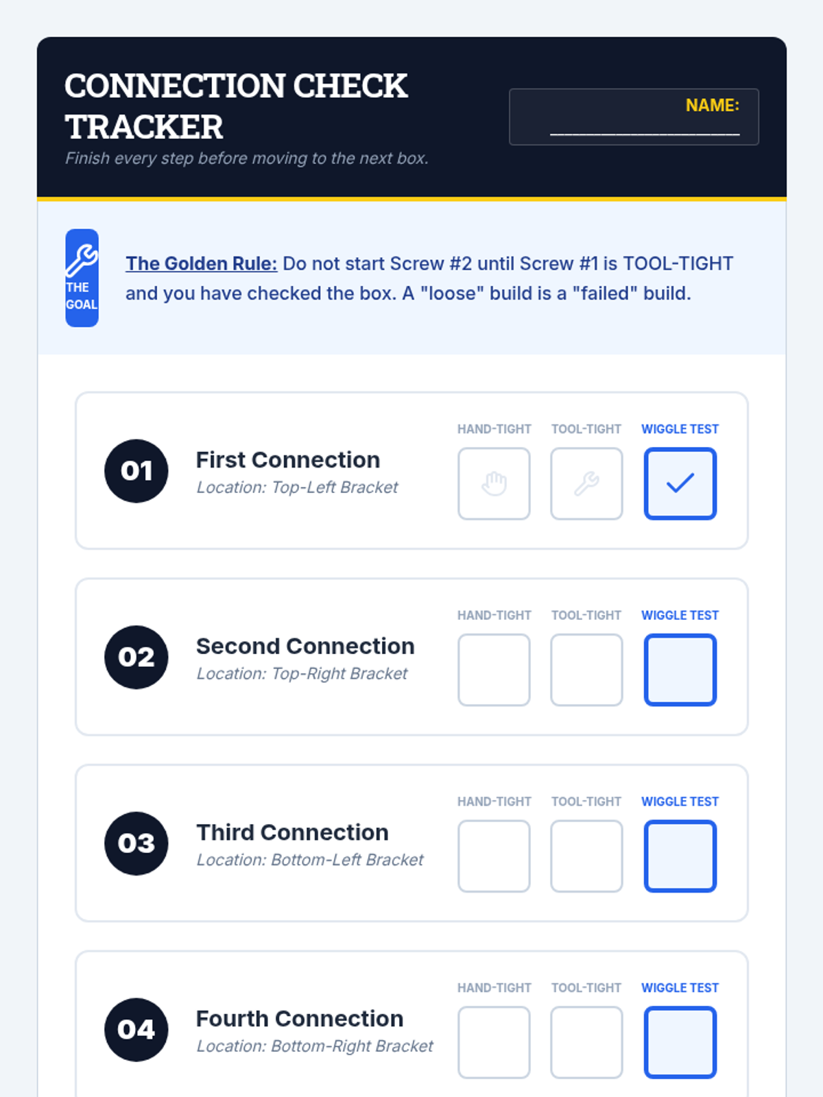 A vocational and life skills sequence focusing on procedural assembly for 12th-grade students with working memory needs. Students practice strict single-step adherence through inventory, fastening, partner systems, and spatial orientation tasks to ensure structural success.