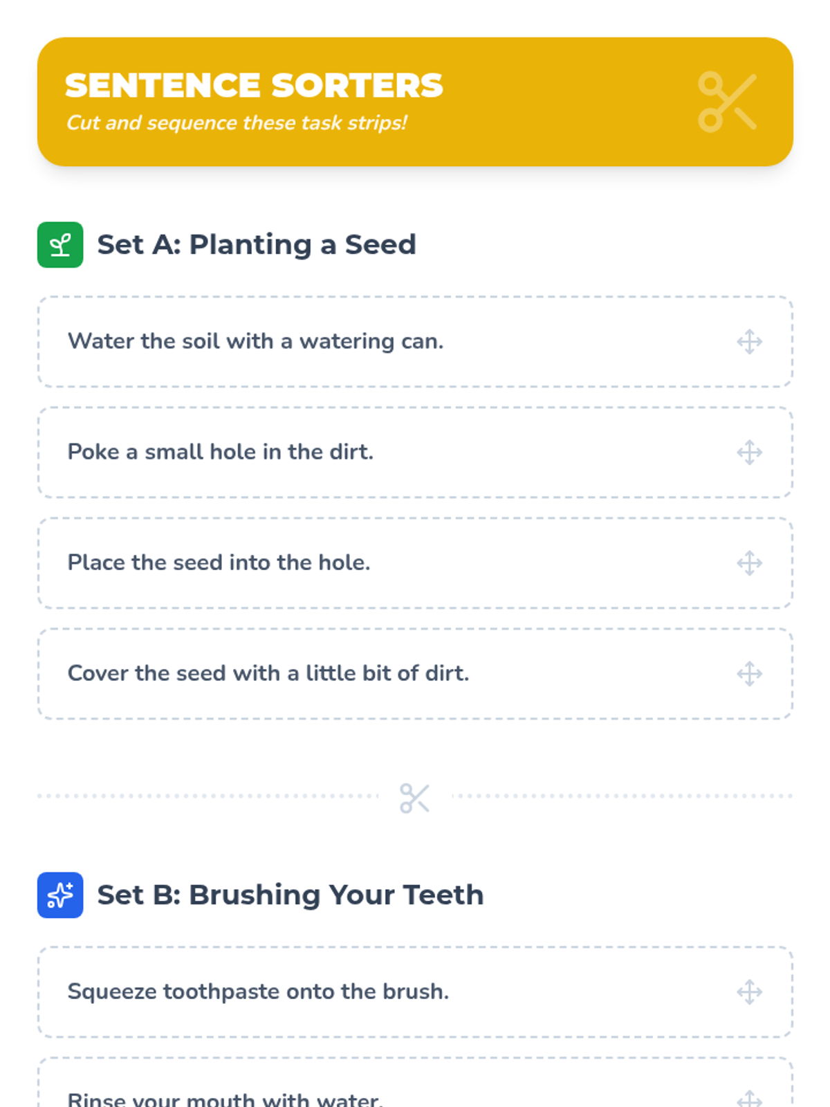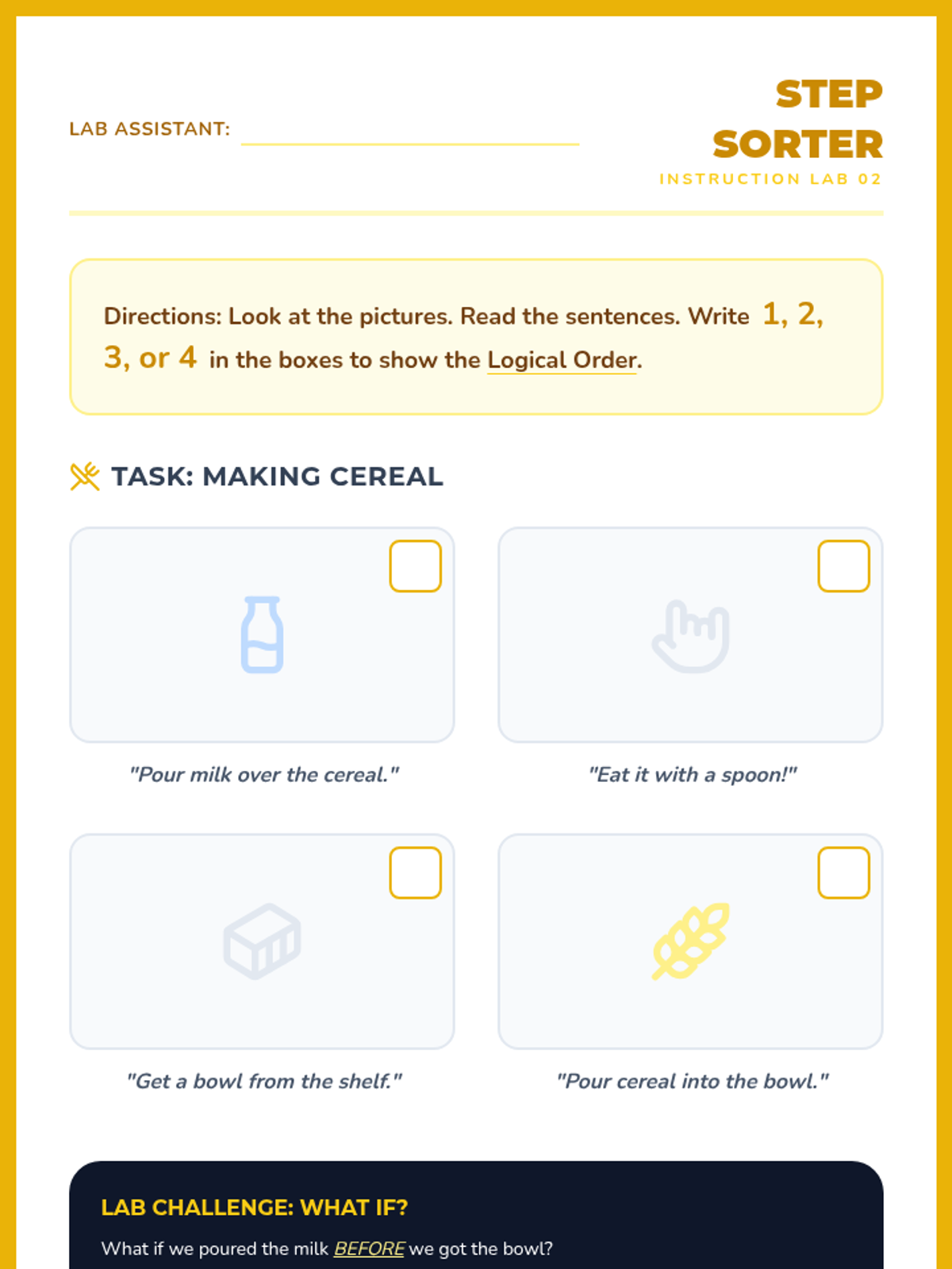 This sequence introduces 1st-grade students to the logical ordering of multi-step procedures. Through simulations, sorting activities, and writing 'How-To' guides, students explore the importance of correct sequencing and the consequences of skipping or reordering steps.