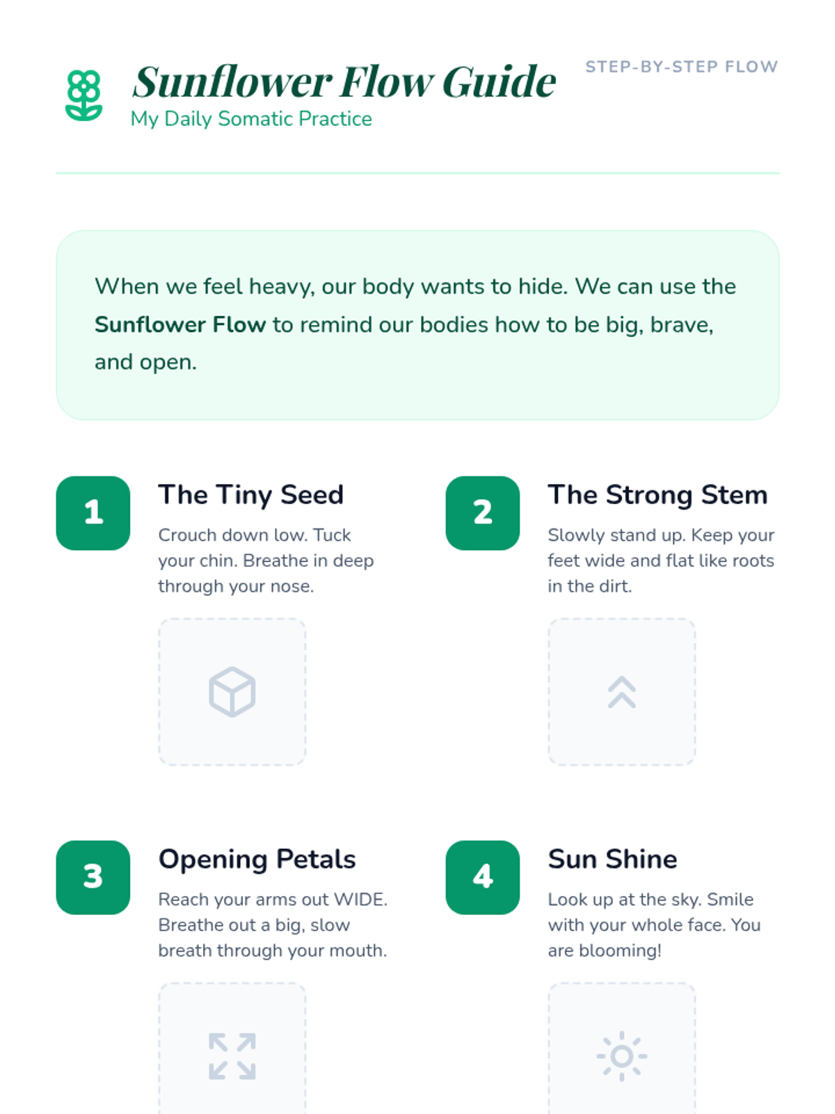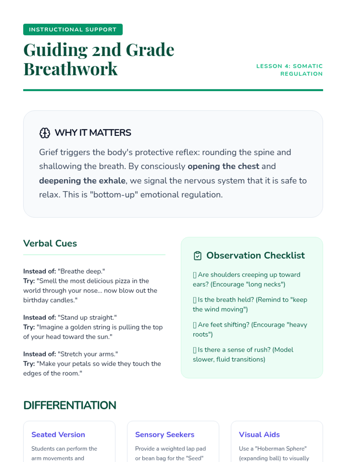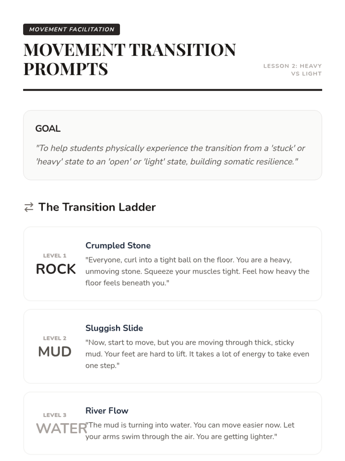A 2nd-grade counseling sequence that uses somatic movement and creative expression to help students process grief and loss. Through movement qualities, guided dance, and breathwork, students learn to identify physical sensations of emotion and find healthy ways to release 'heavy' feelings.