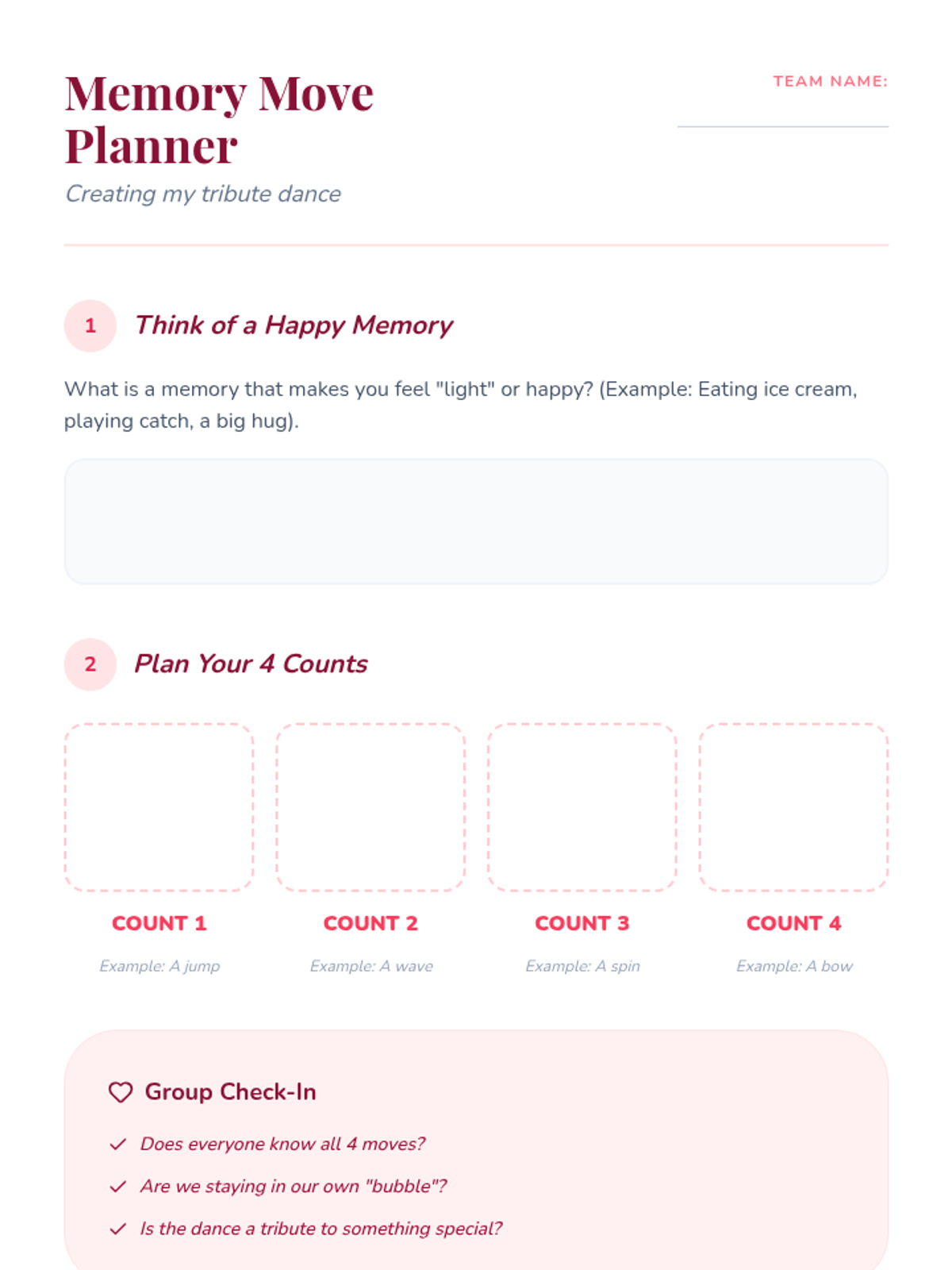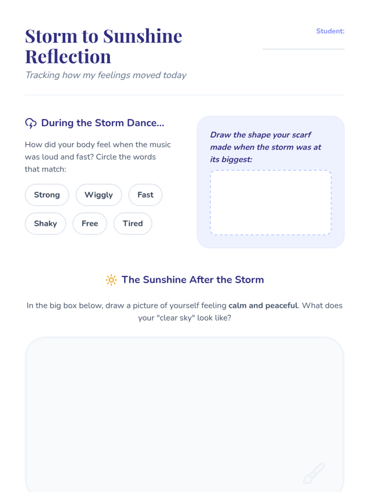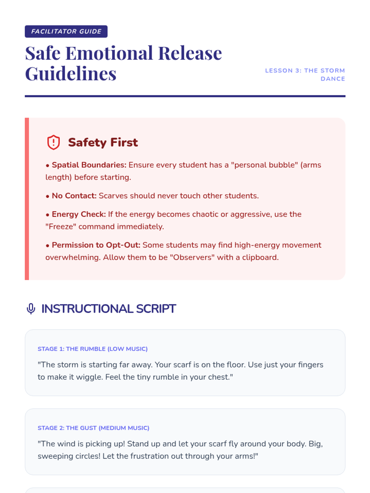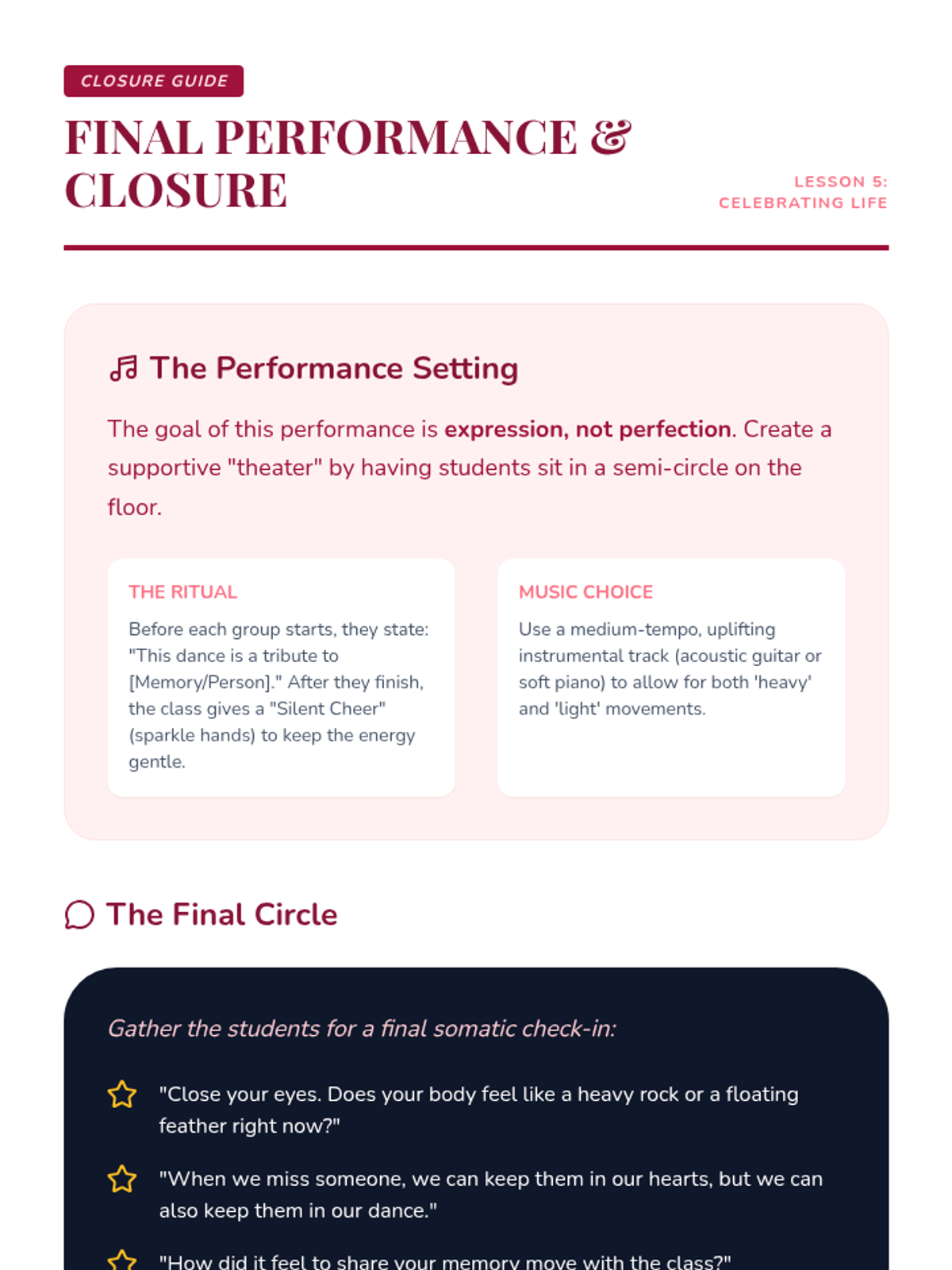 A 2nd-grade counseling sequence that uses somatic movement and creative expression to help students process grief and loss. Through movement qualities, guided dance, and breathwork, students learn to identify physical sensations of emotion and find healthy ways to release 'heavy' feelings.