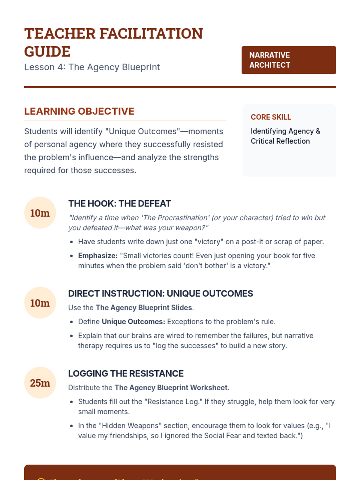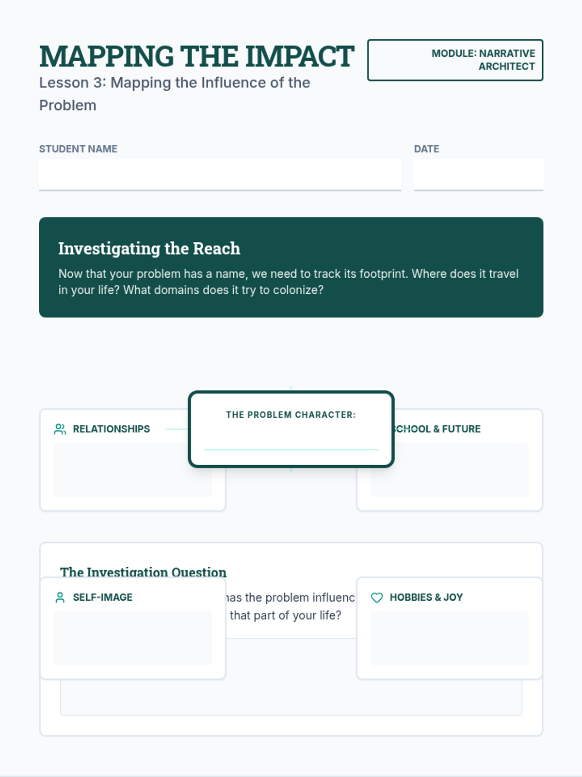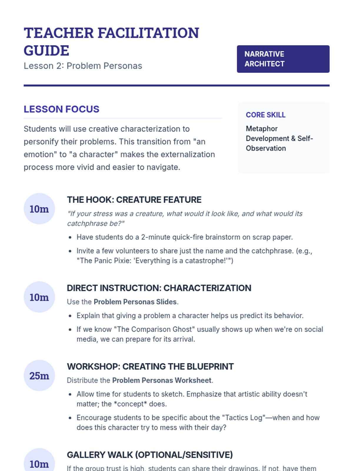 A 5-lesson sequence for 11th-grade students on the Narrative Therapy technique of externalization, focusing on separating identity from problems to build agency and resolve challenges.