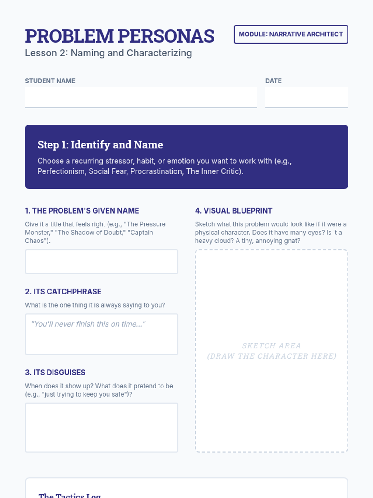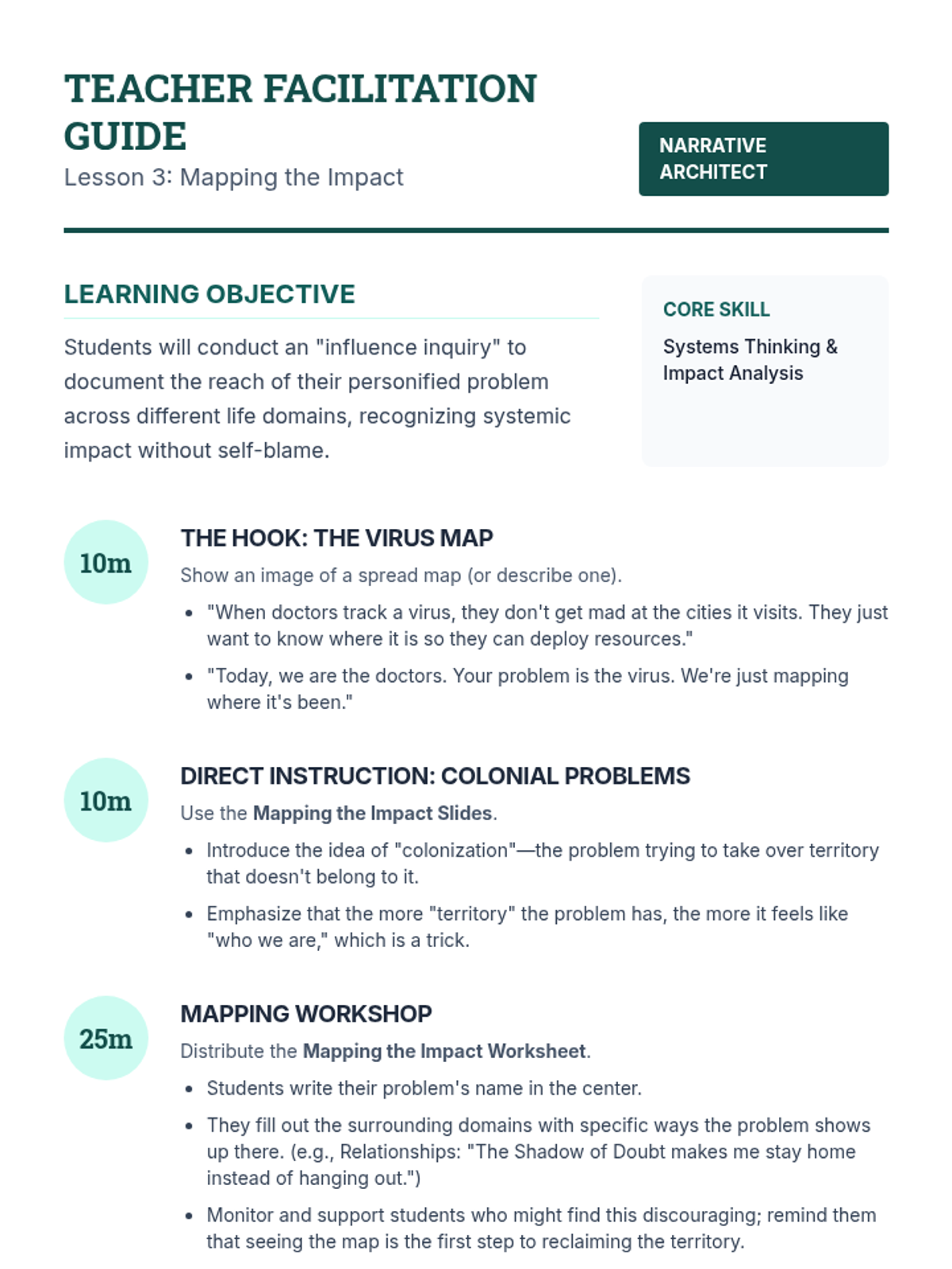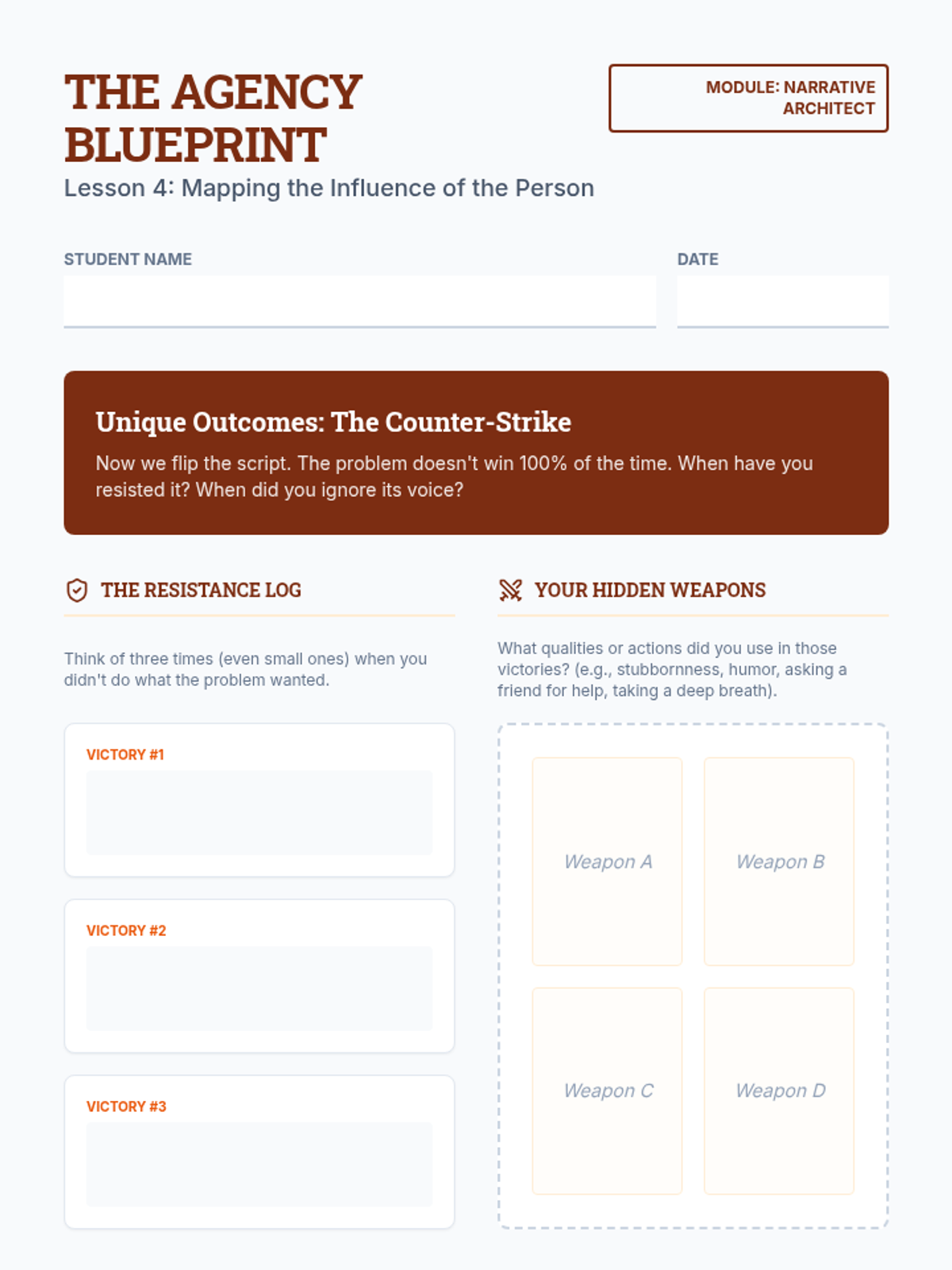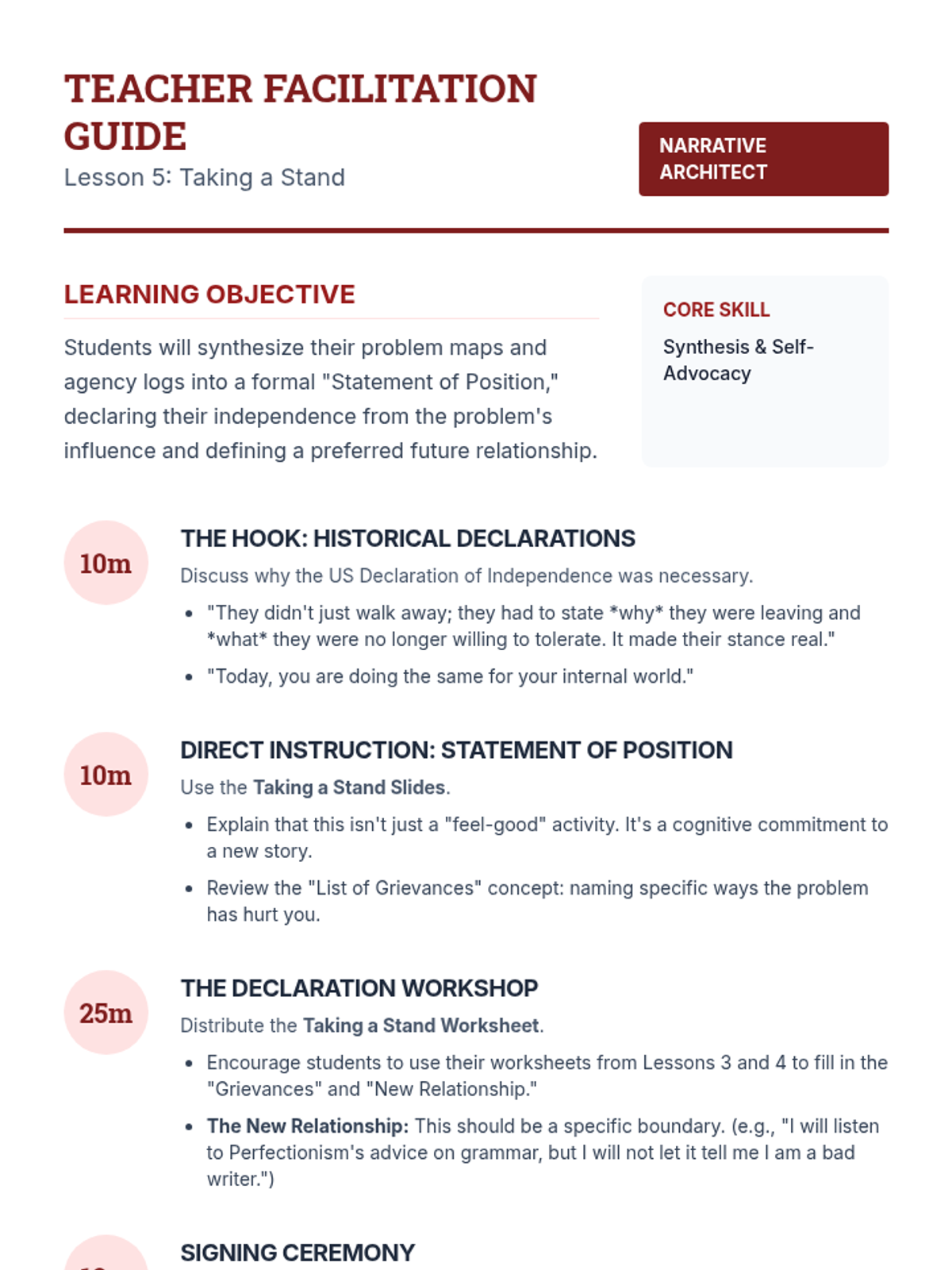 A 5-lesson sequence for 11th-grade students on the Narrative Therapy technique of externalization, focusing on separating identity from problems to build agency and resolve challenges.