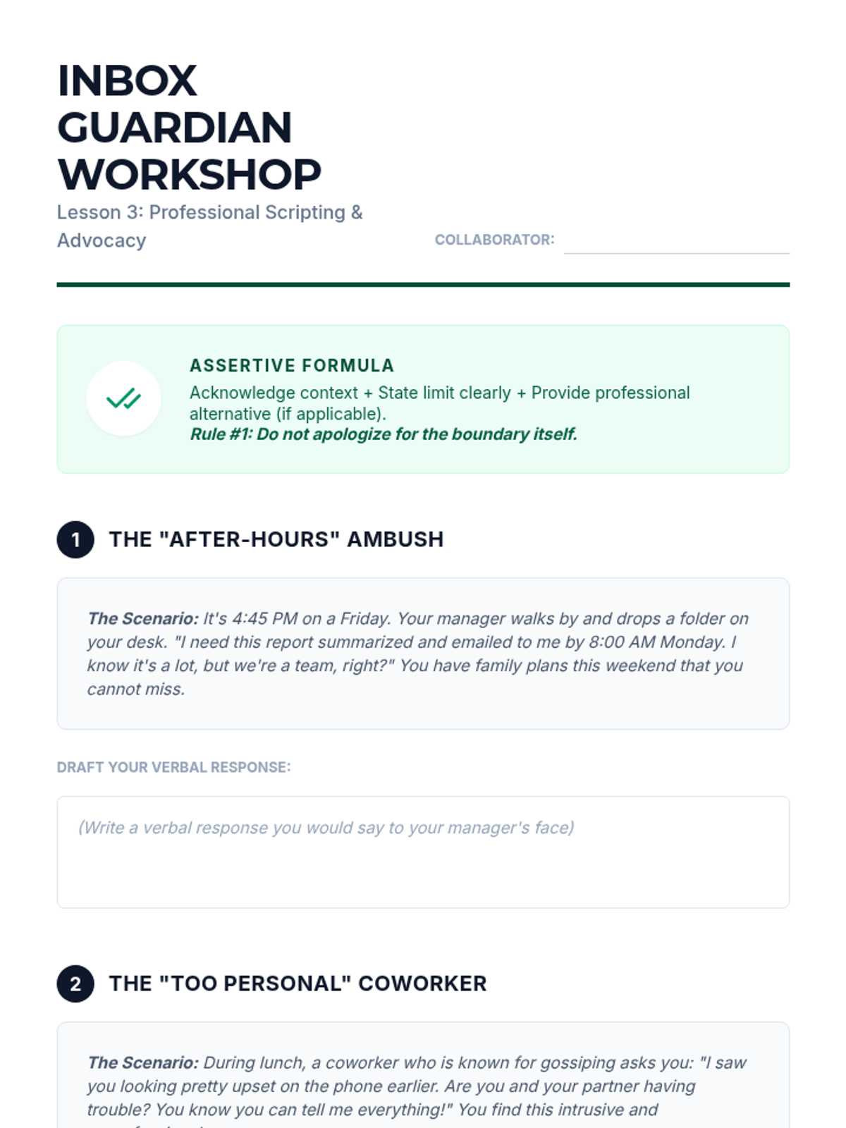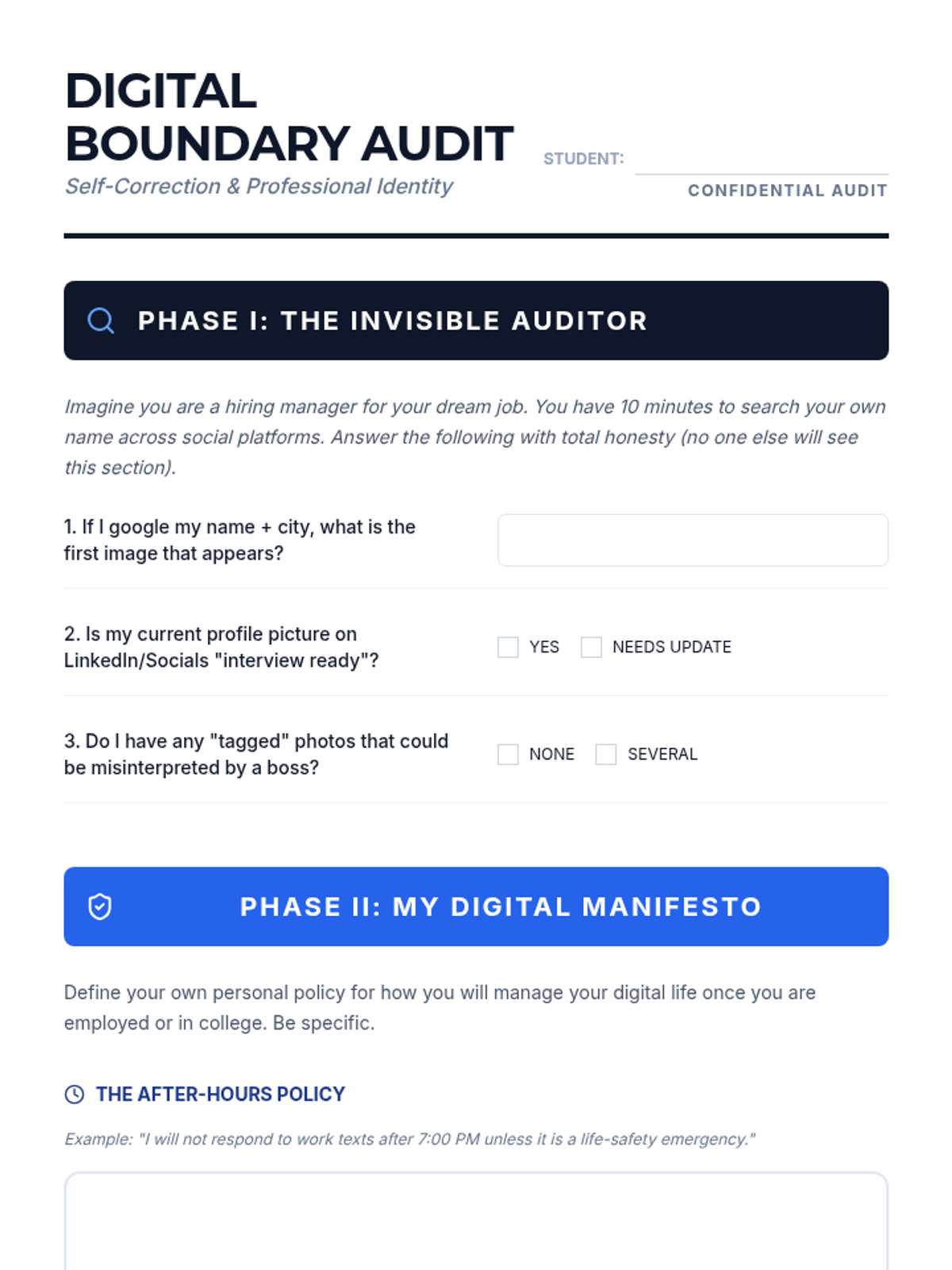 A comprehensive 12th-grade sequence focused on setting professional and personal boundaries in the workplace and shared living environments. Students learn to navigate hierarchies, identify harassment, script assertive responses, and manage digital availability.