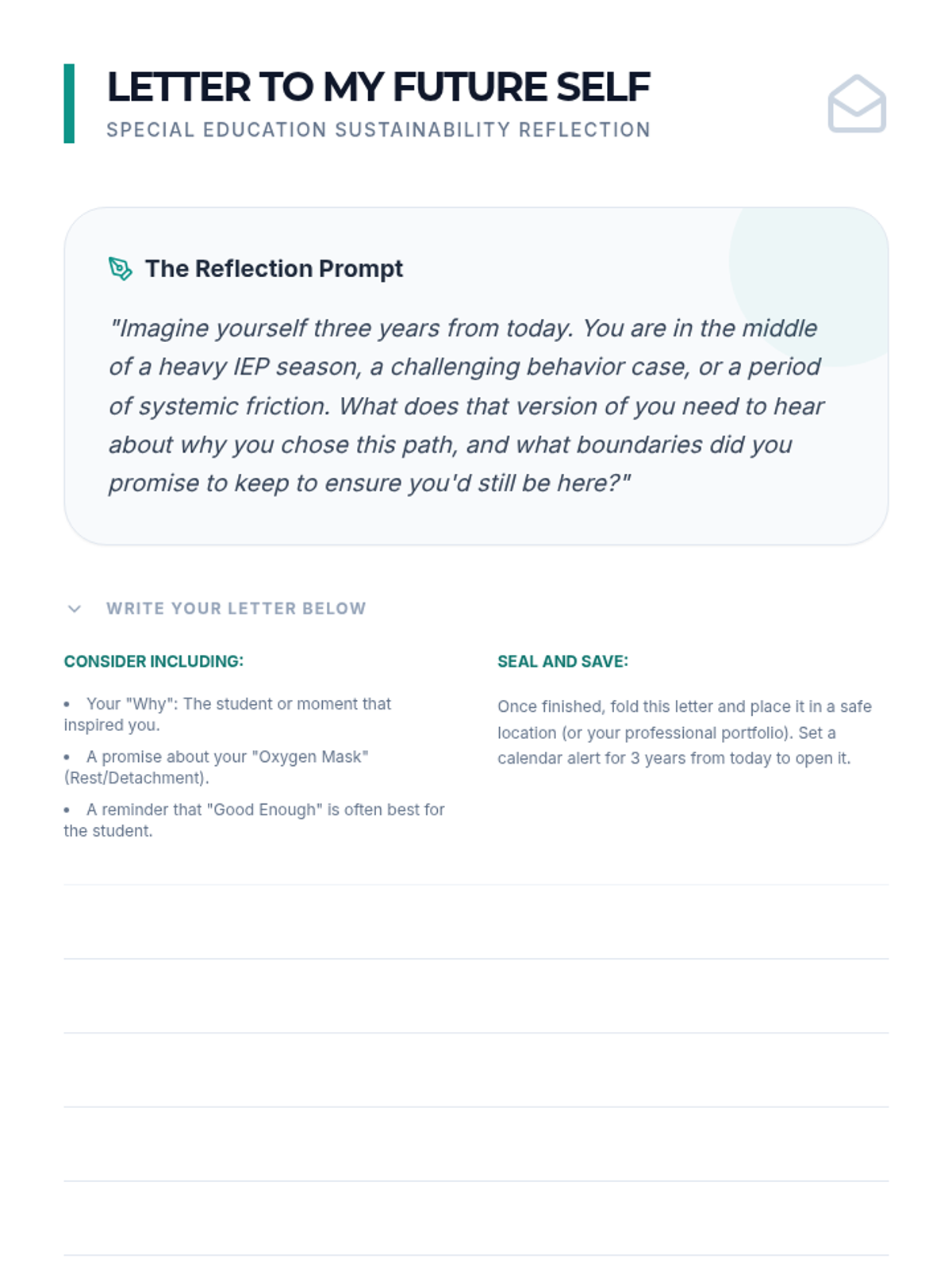 A comprehensive graduate-level sequence designed to combat special education attrition by reframing self-care as a professional ethical competency. This inquiry-based unit moves students from systemic analysis of burnout to the creation of a personalized, sustainable professional lifestyle plan.