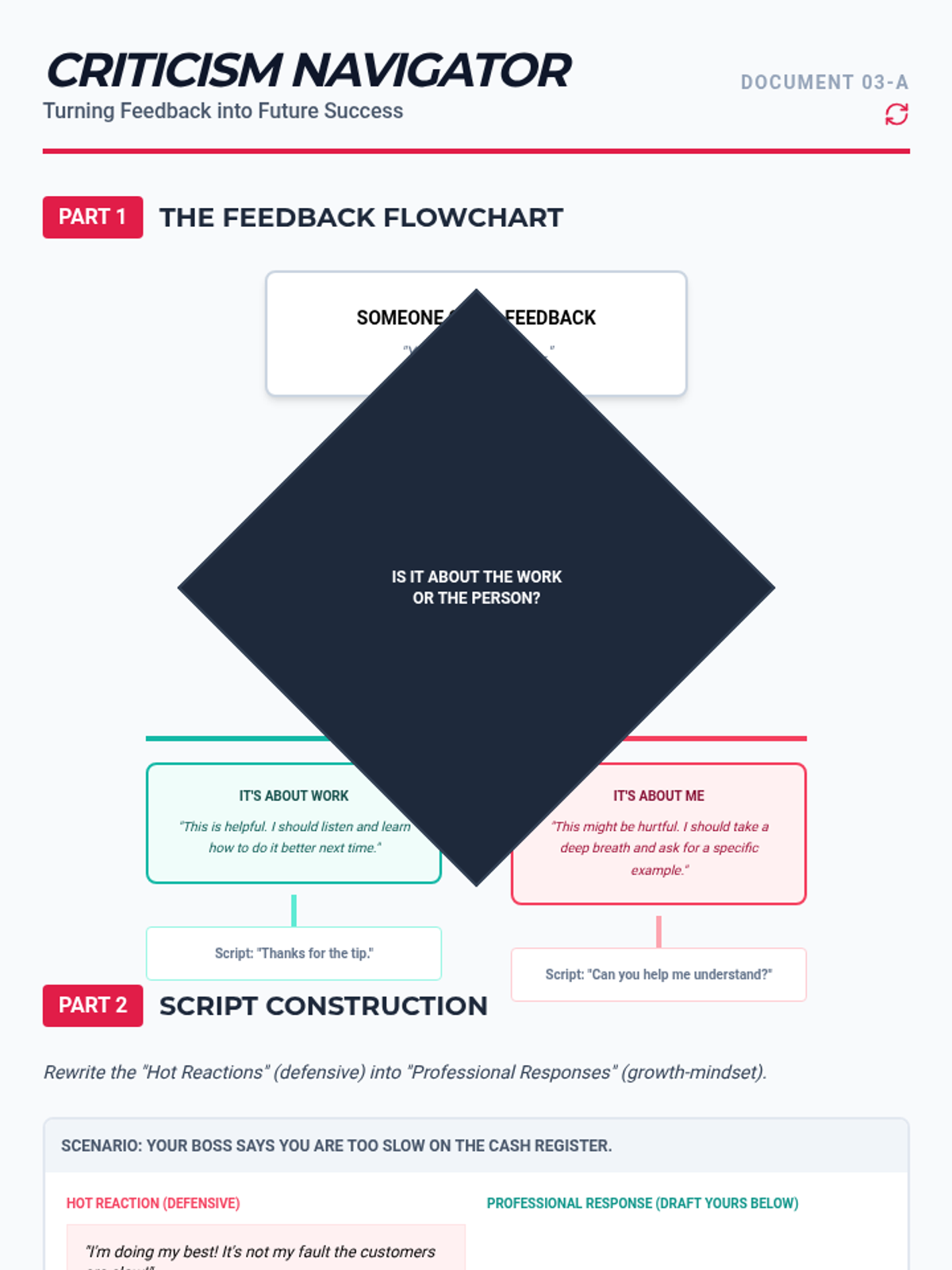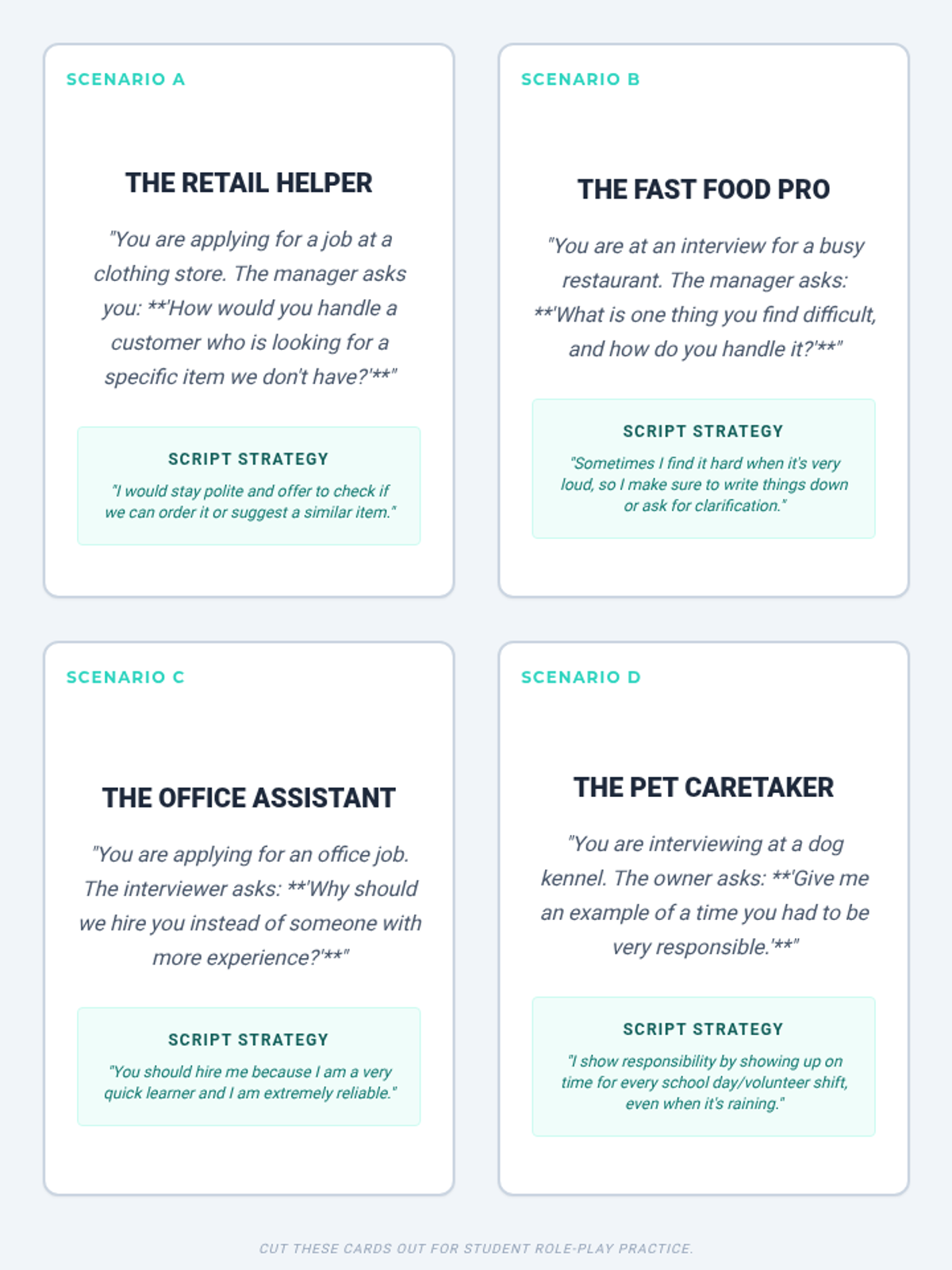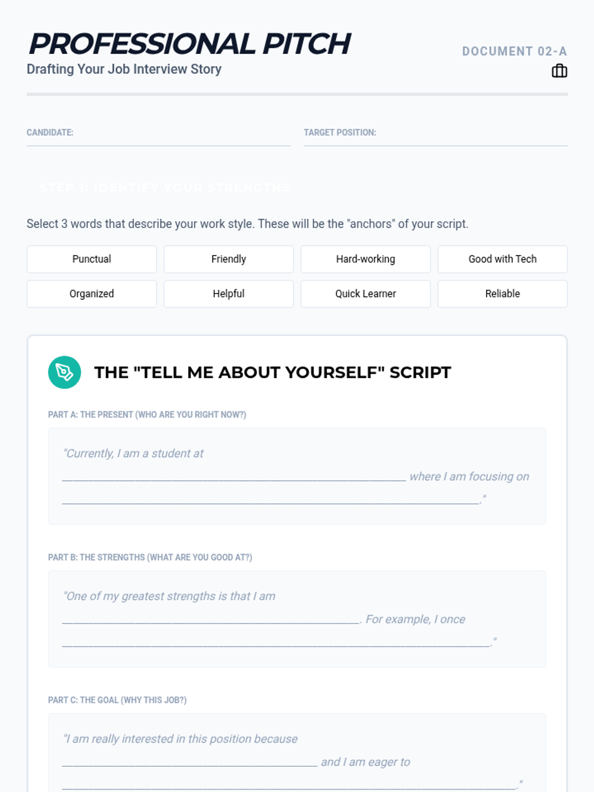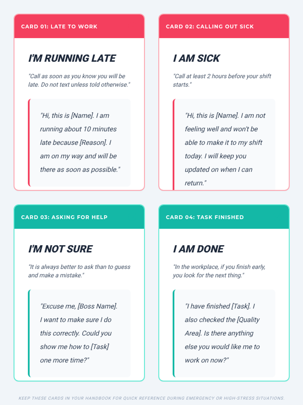 This sequence guides students through the creation of personalized narratives specifically designed for workplace environments. Students will transition from analyzing general employee expectations to crafting specific scripts for interviews, interactions with supervisors, and handling critical feedback, culminating in a personal 'Job Success Handbook'.