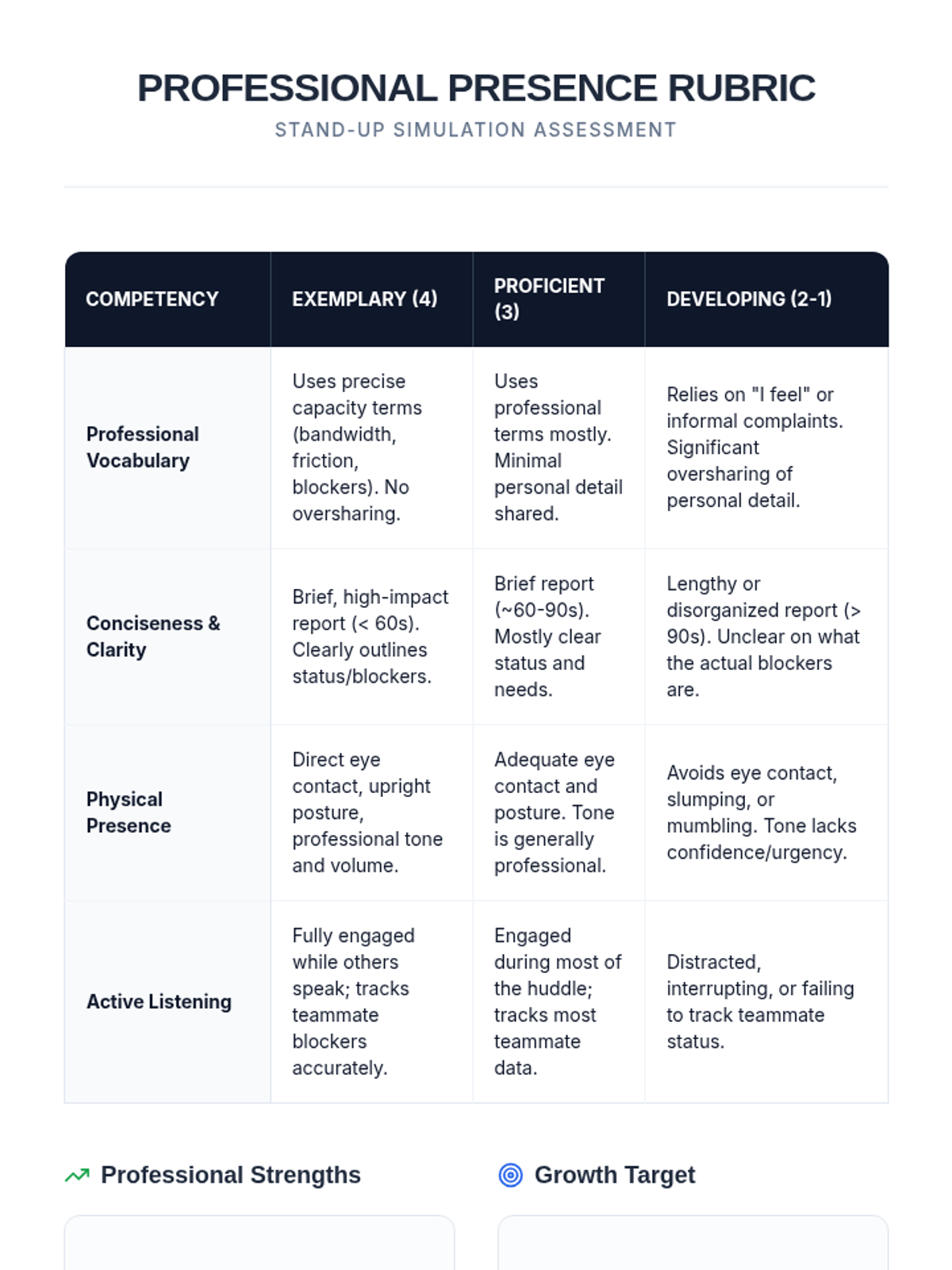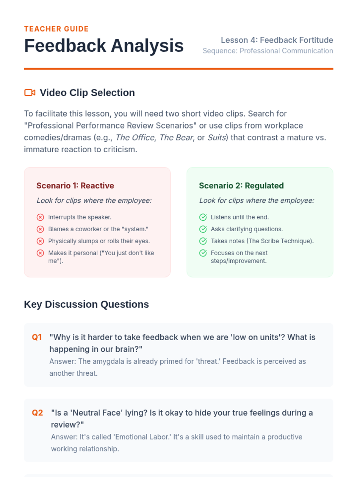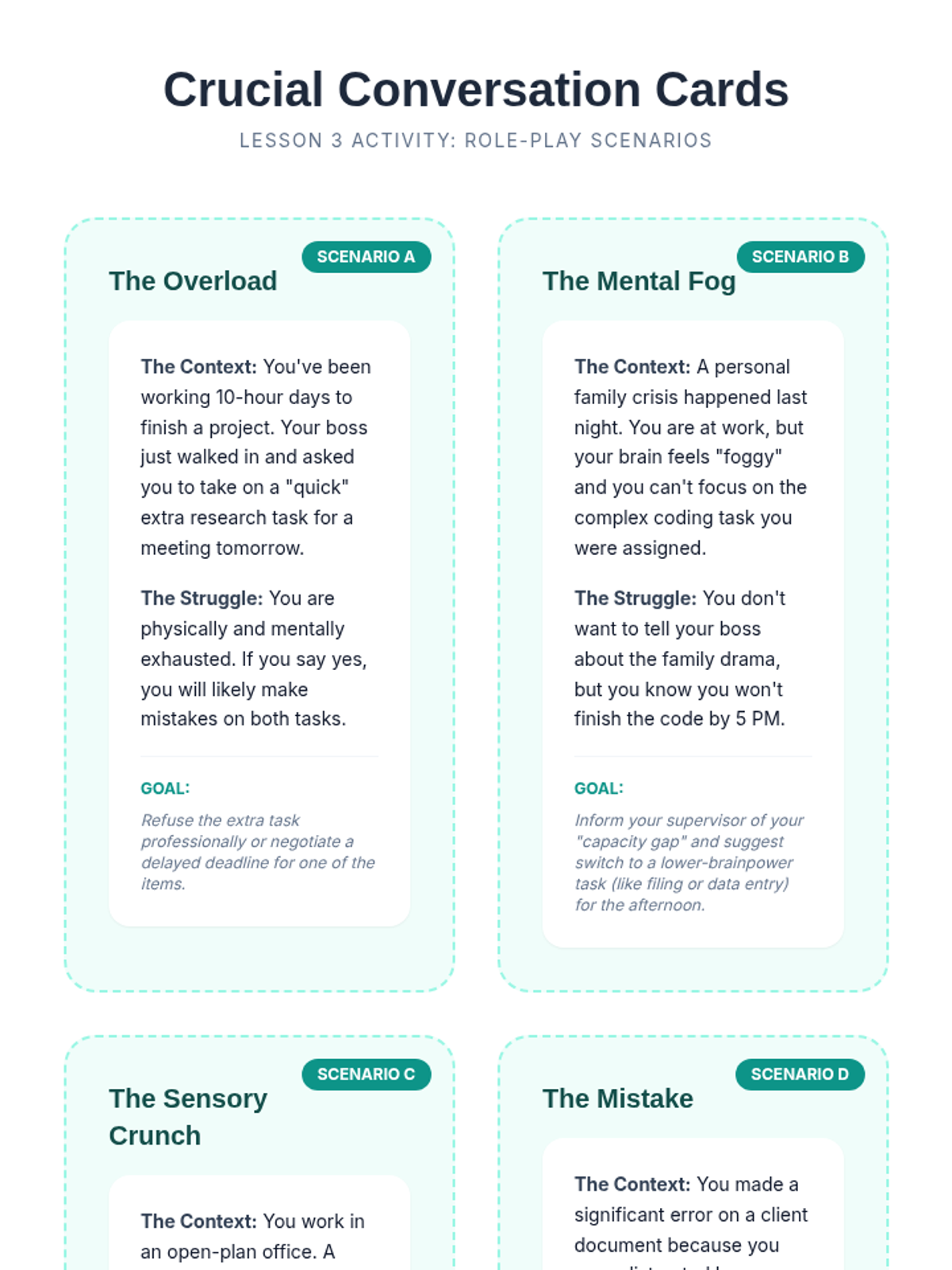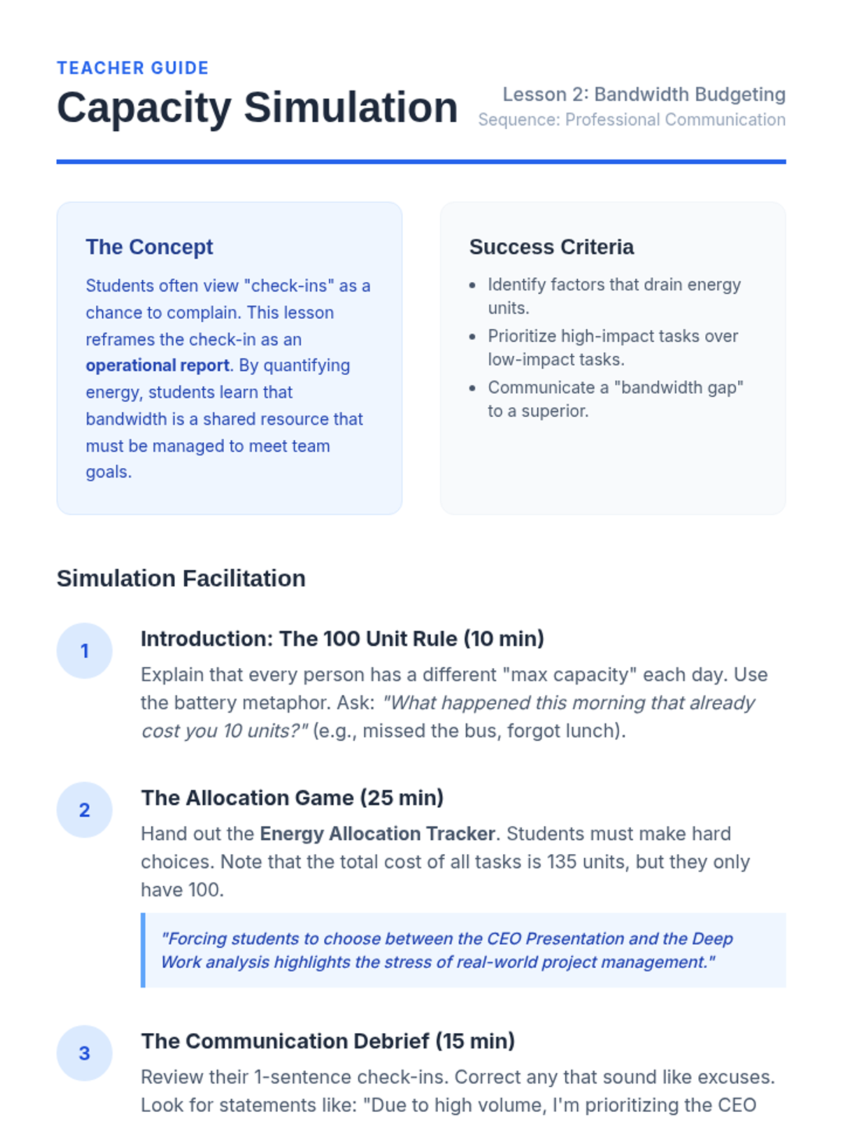 This sequence reframes daily check-ins as a professional soft skill, teaching 11th-grade students to communicate emotional needs and capacity limits effectively in workplace environments. Students move from expanding their emotional vocabulary to participating in a simulated corporate stand-up meeting.