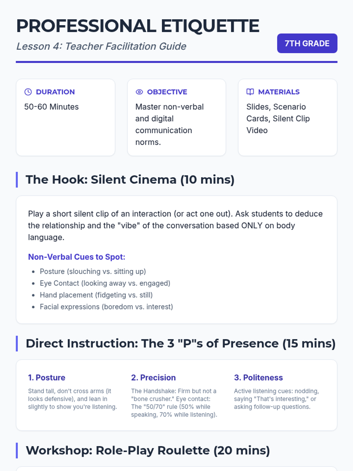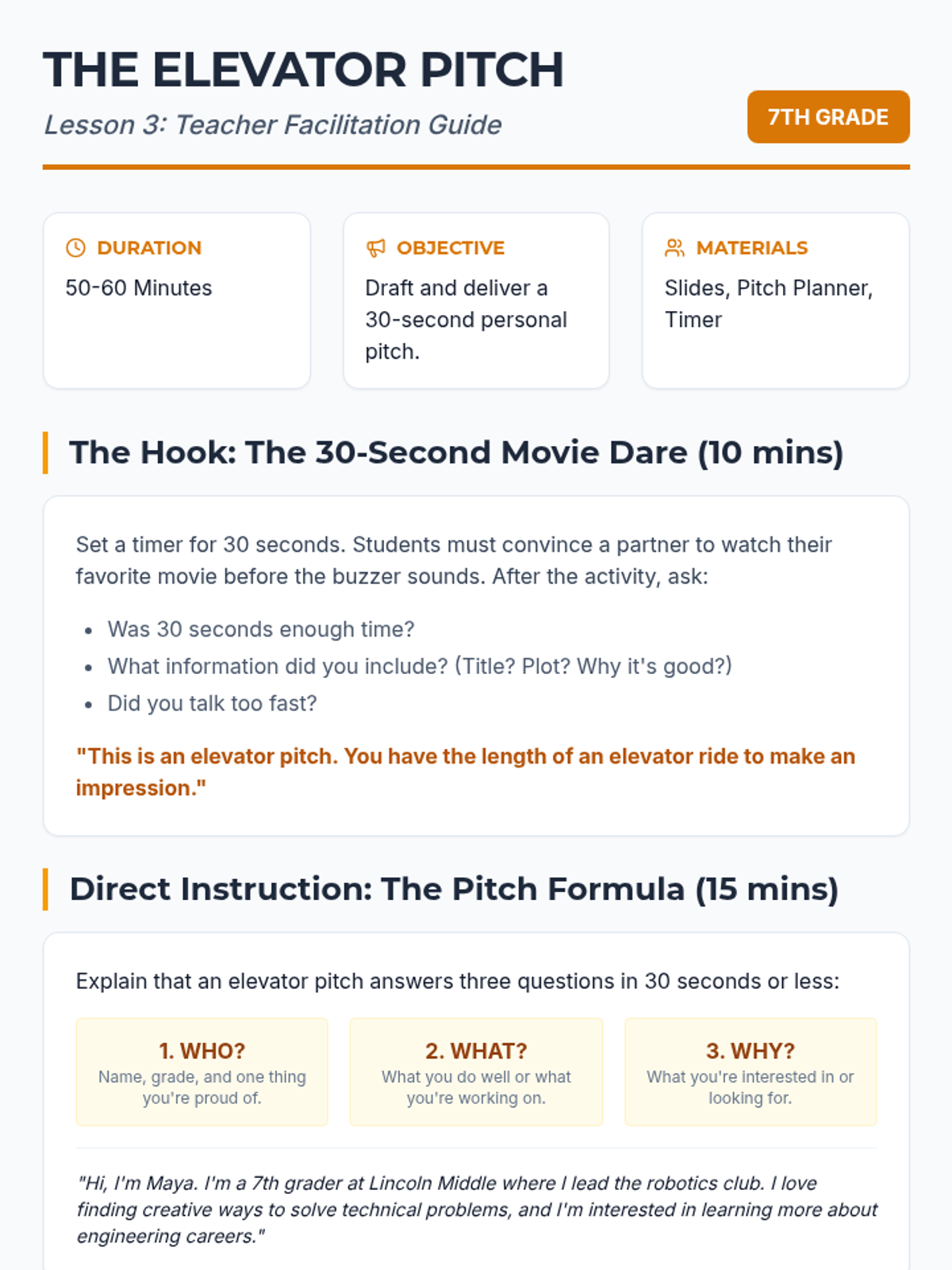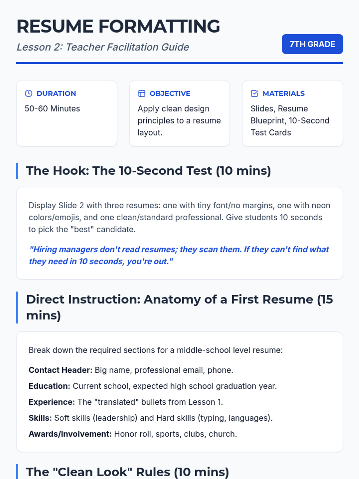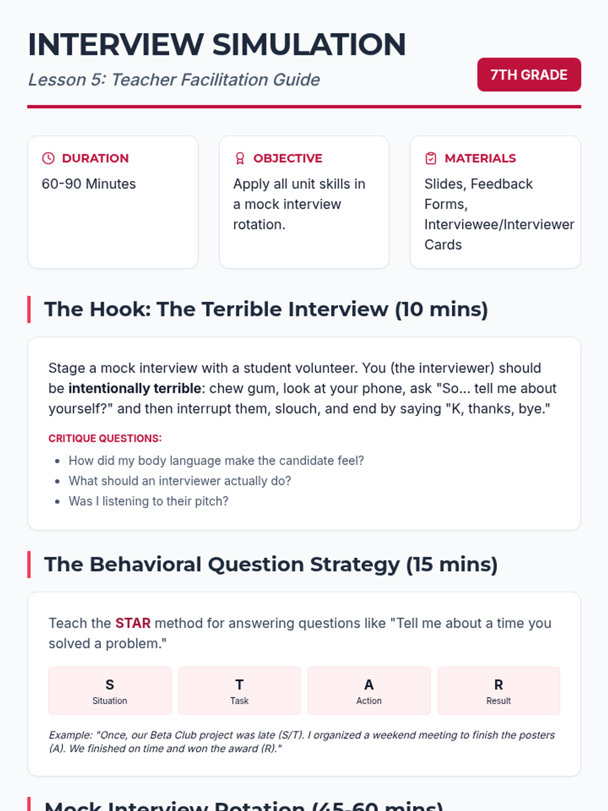 A comprehensive 5-lesson unit for 7th graders focusing on professional communication, resume writing, and interview skills, helping students translate life experiences into professional assets.