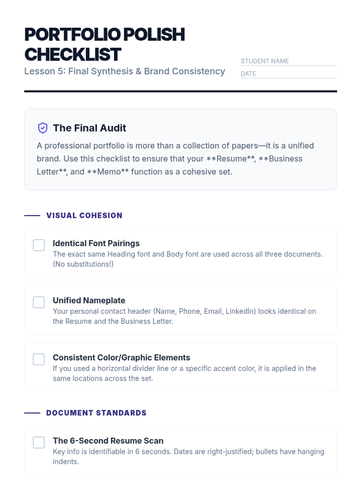 A project-based sequence for 12th-grade students focusing on visual hierarchy, document design, and professional formatting standards. Students move from basic principles of white space to creating a cohesive professional portfolio.