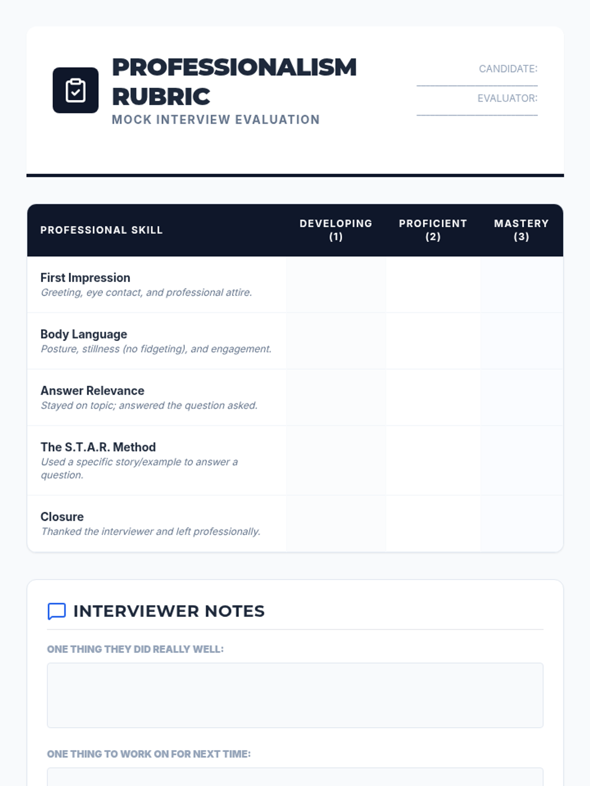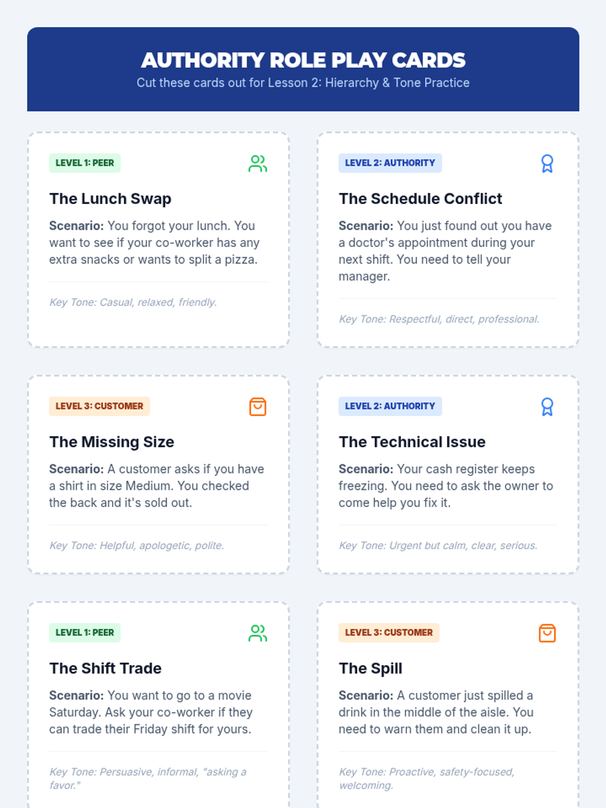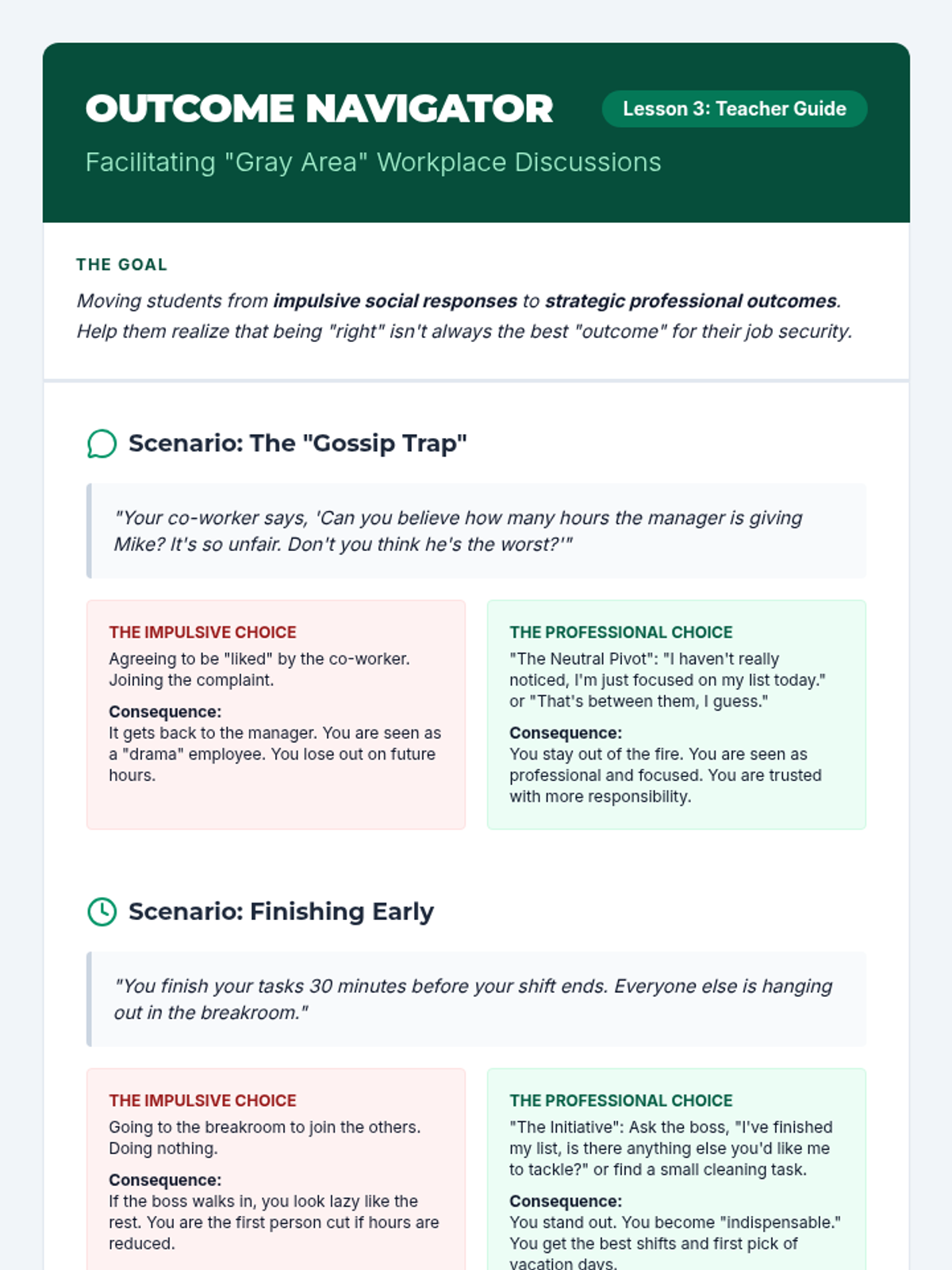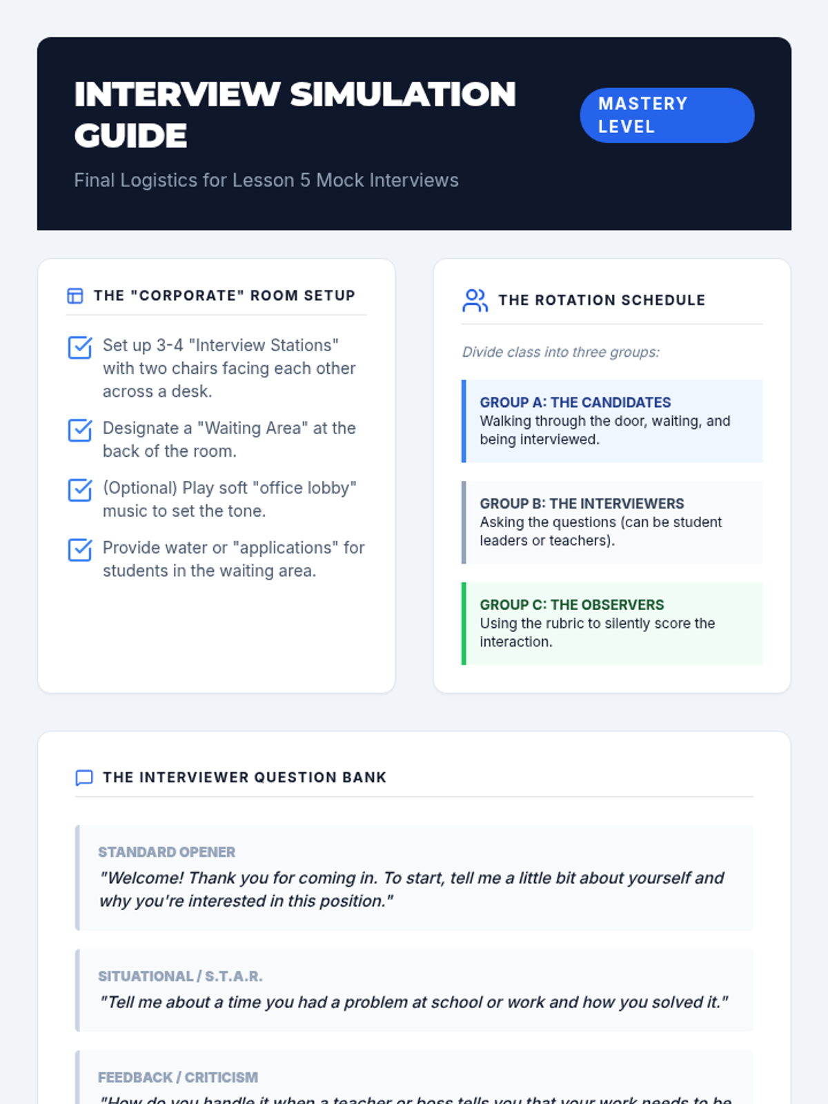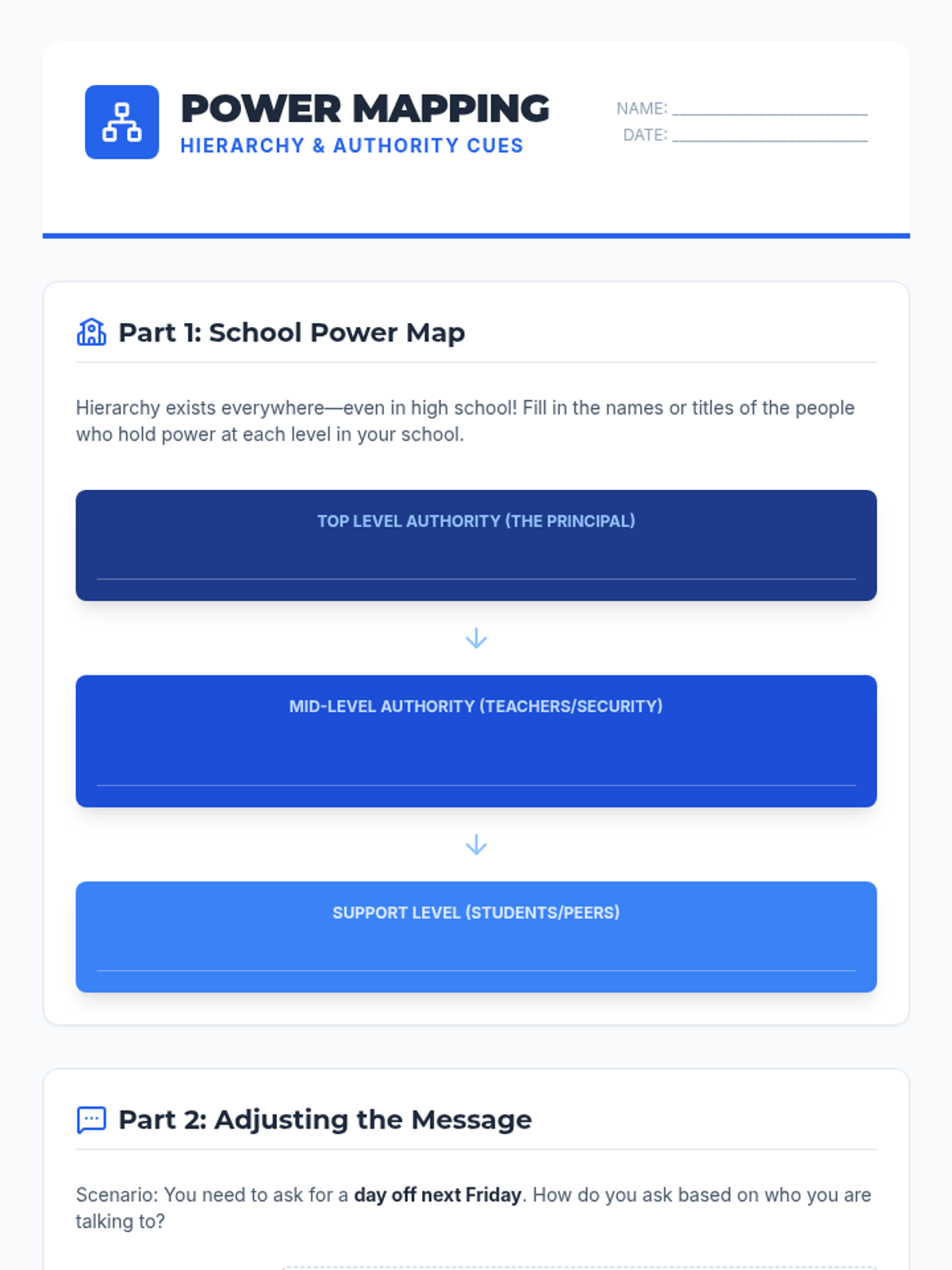 A 5-lesson sequence designed for 9th-grade students to navigate the social complexities of professional environments. Students learn to distinguish between formal and informal contexts, understand workplace hierarchy, predict social outcomes, handle constructive criticism, and participate in mock interviews.