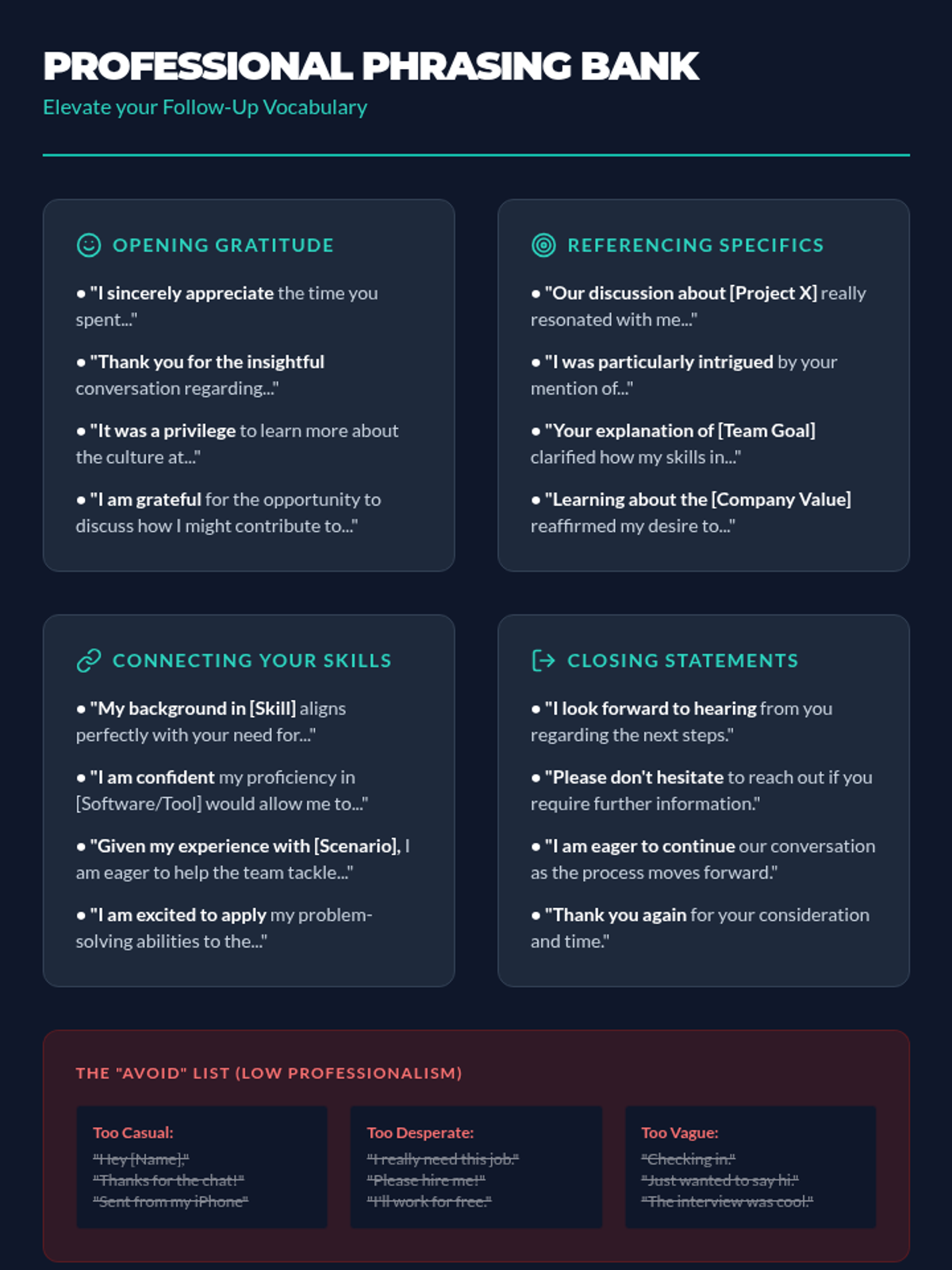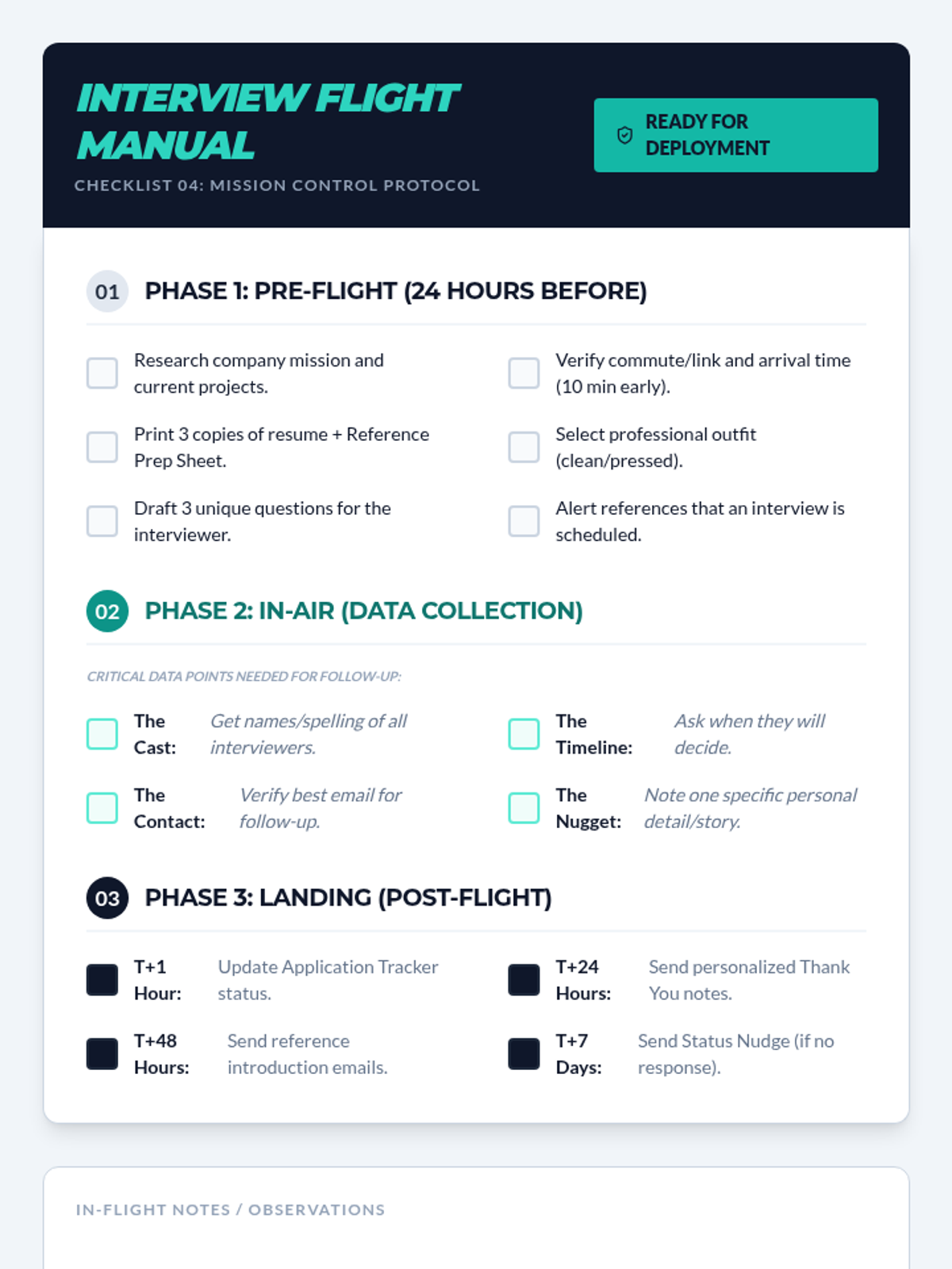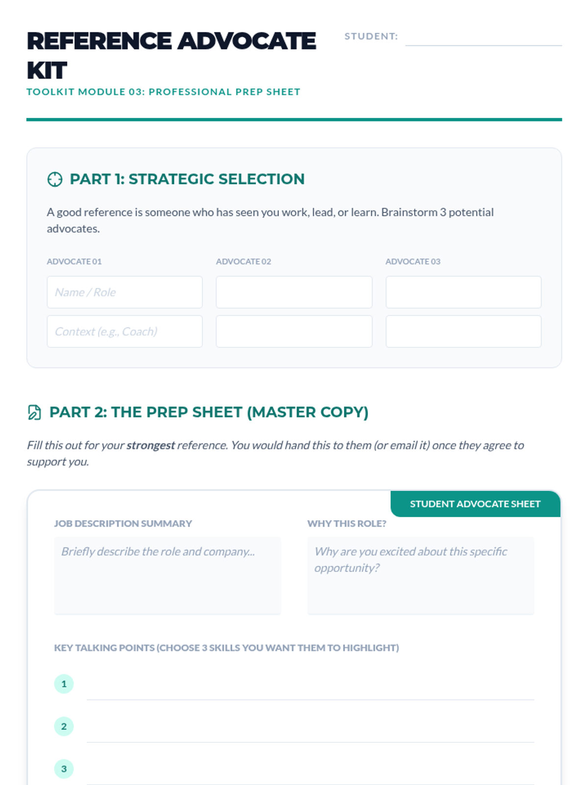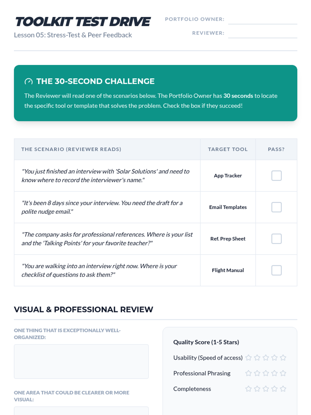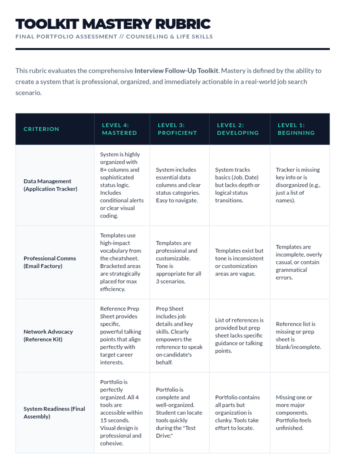 Students build a comprehensive Interview Follow-Up Toolkit, designing reusable systems like trackers, email templates, and reference sheets to manage the job search process with organization and confidence.