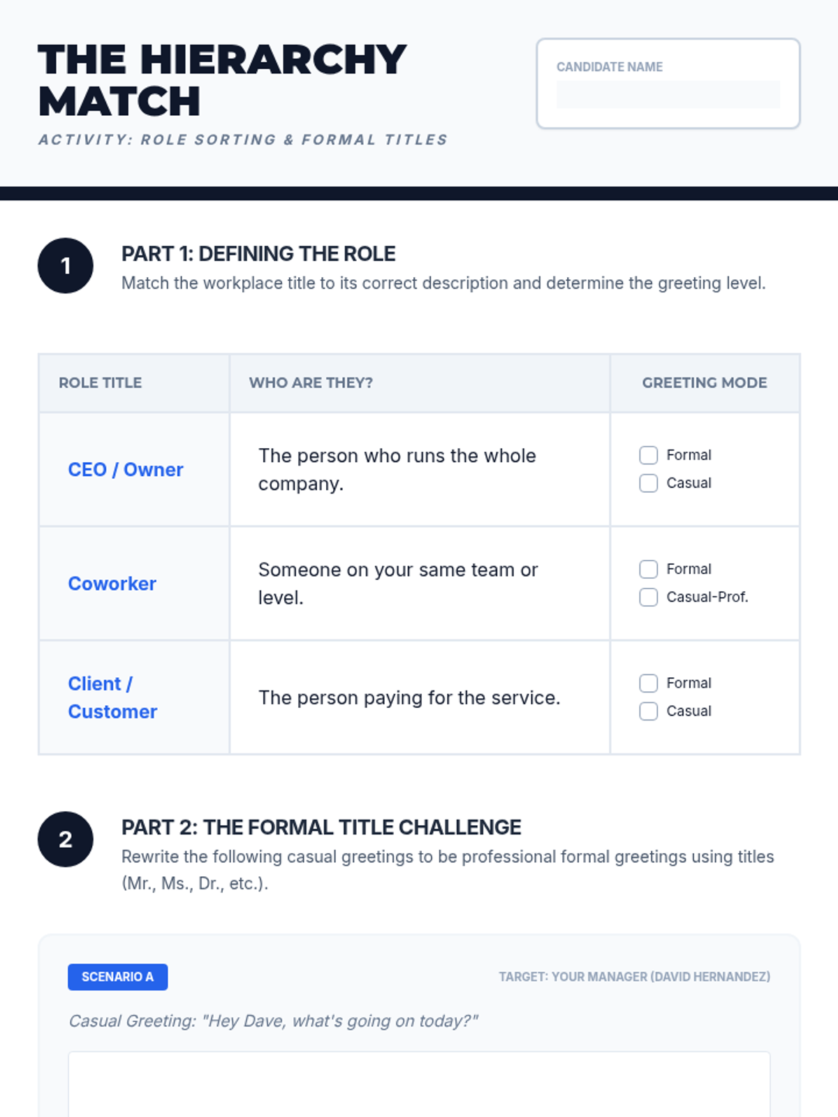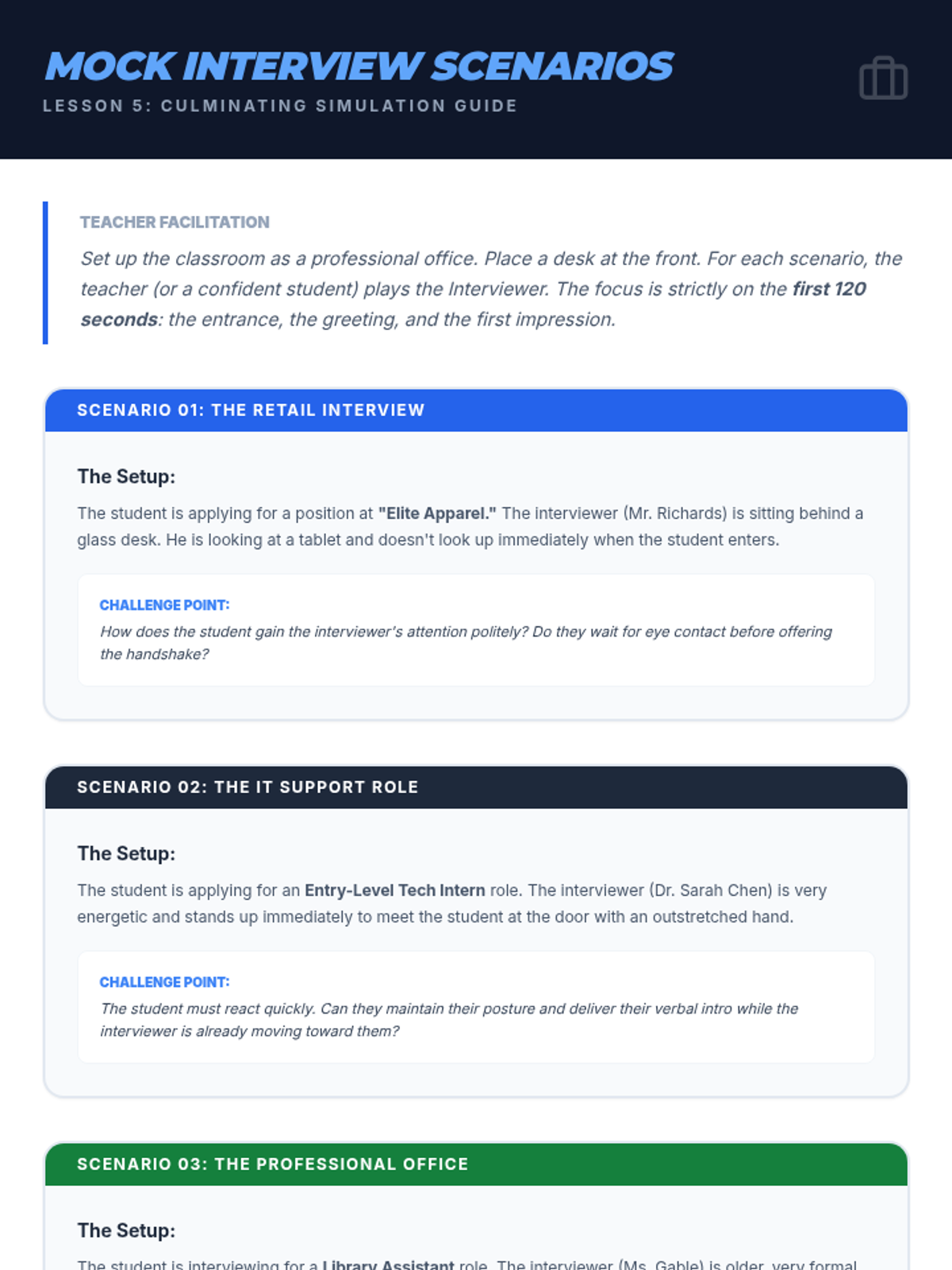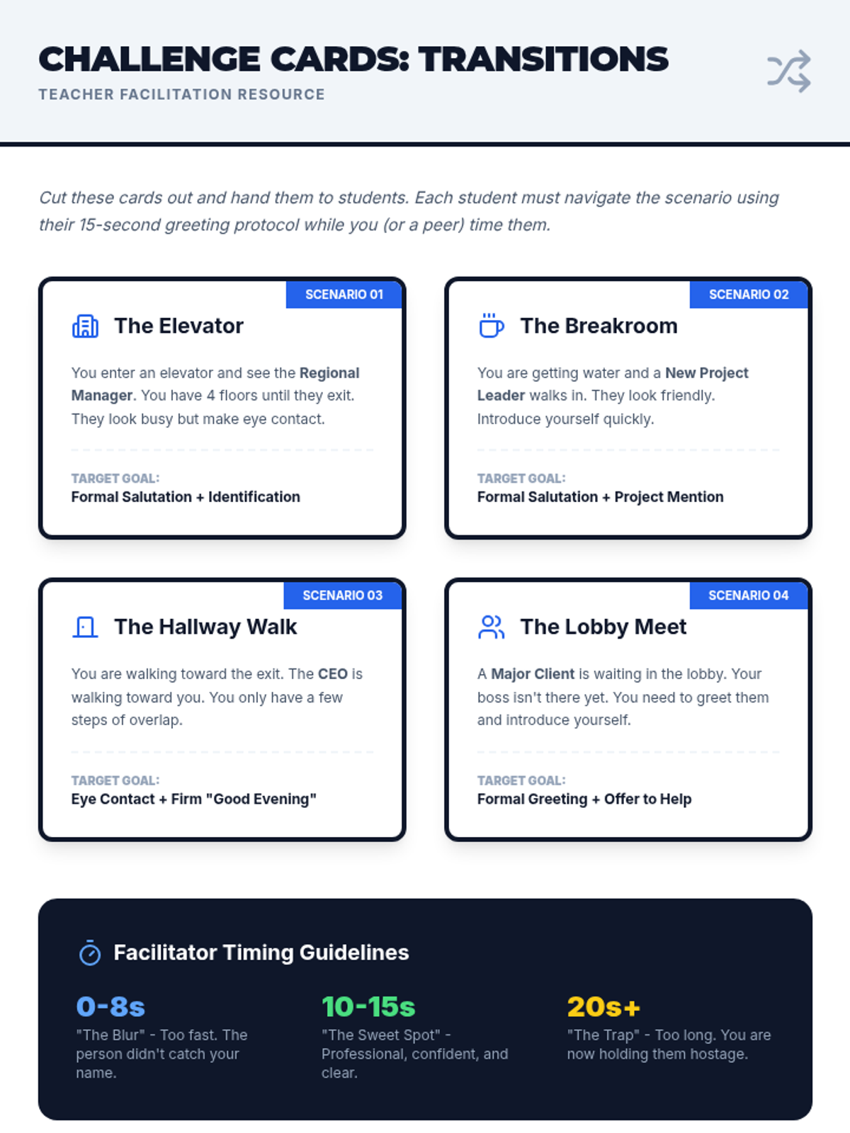 This sequence prepares 11th-grade students for professional environments by teaching the nuances of workplace greetings. Students will master physical mechanics, hierarchy-based title selection, elevator pitches, and digital etiquette through role-play and simulation.