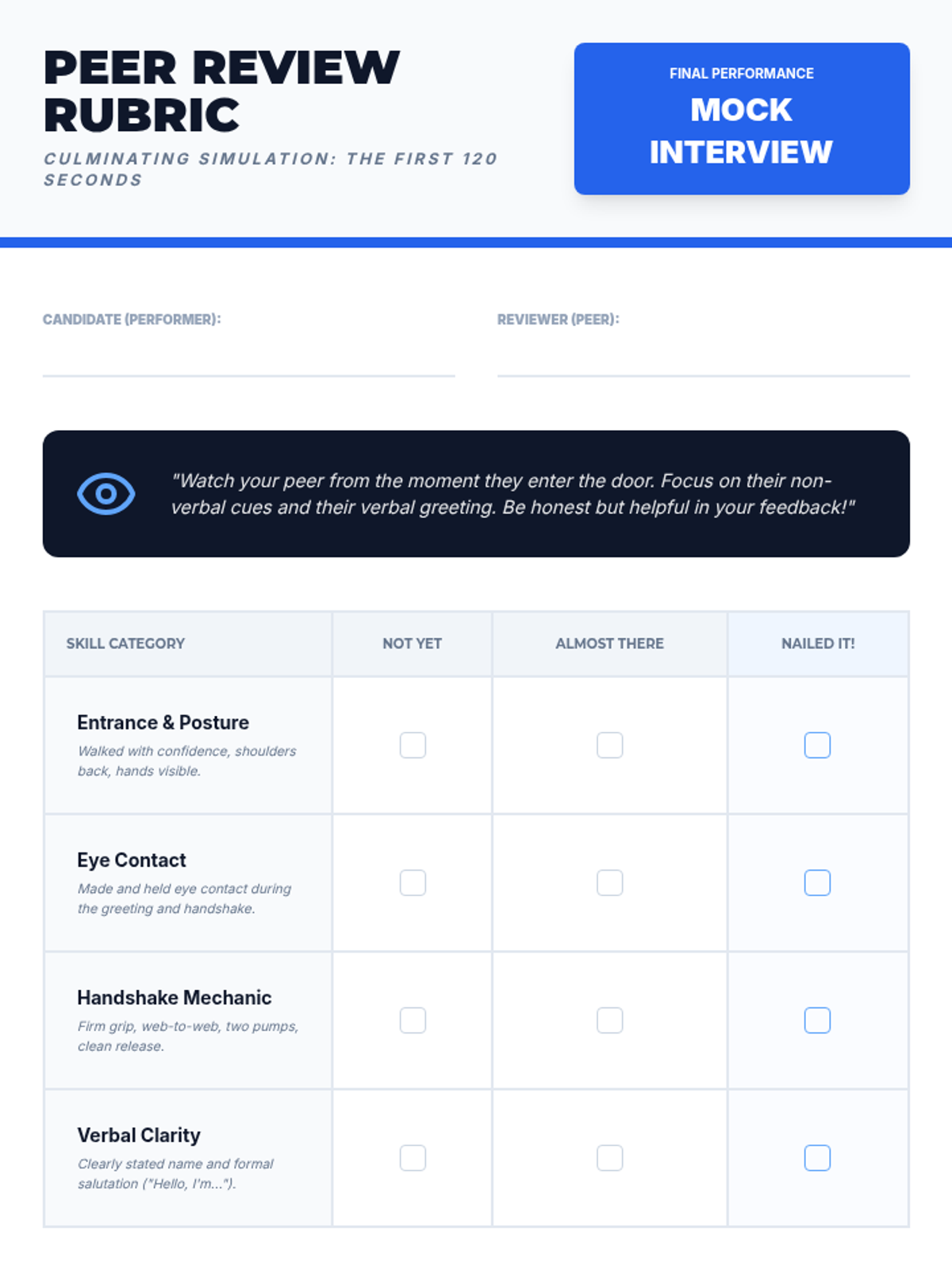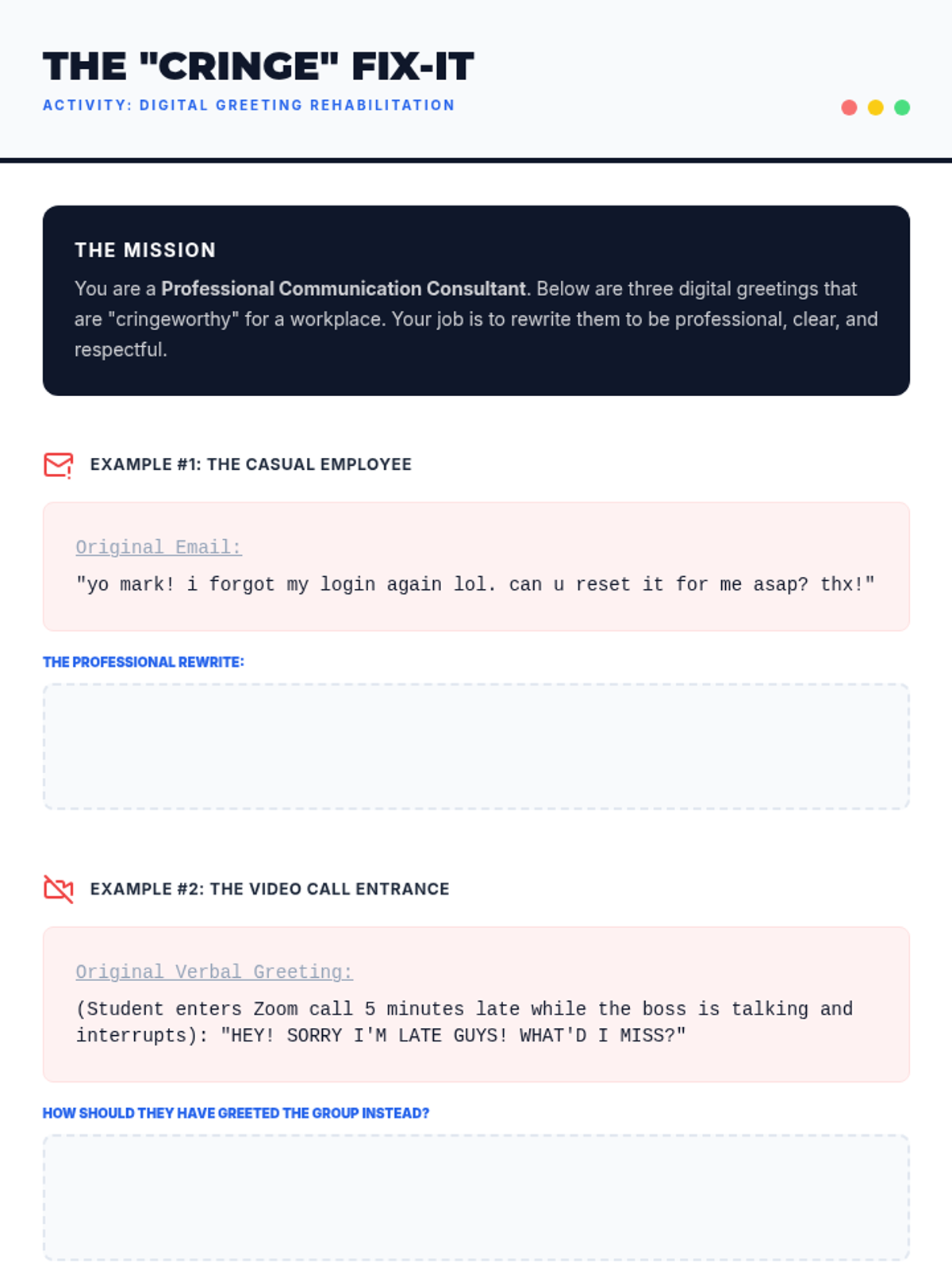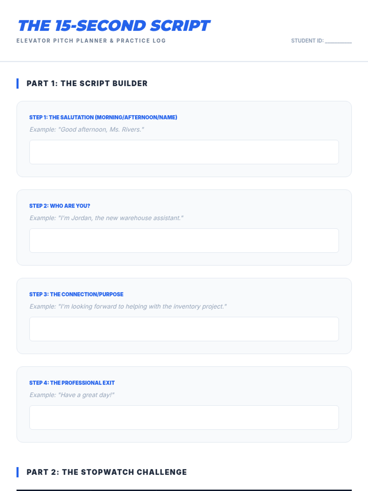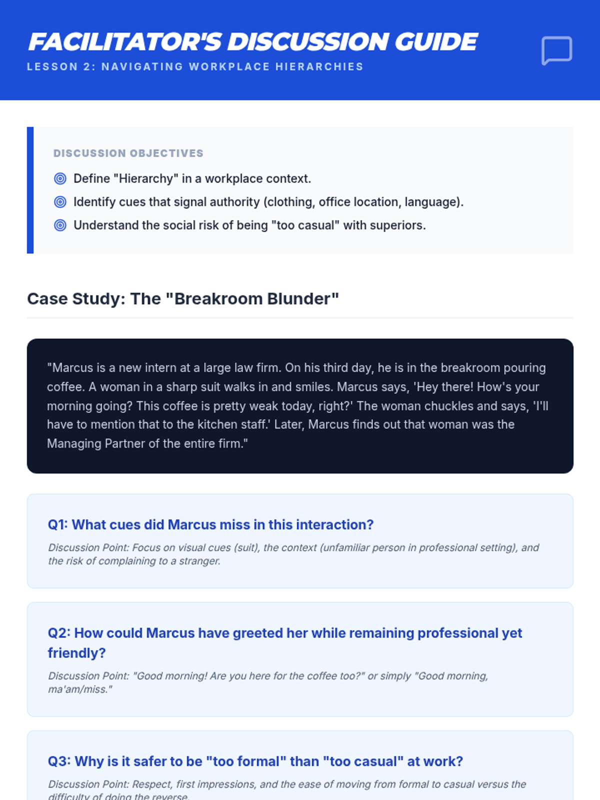 This sequence prepares 11th-grade students for professional environments by teaching the nuances of workplace greetings. Students will master physical mechanics, hierarchy-based title selection, elevator pitches, and digital etiquette through role-play and simulation.