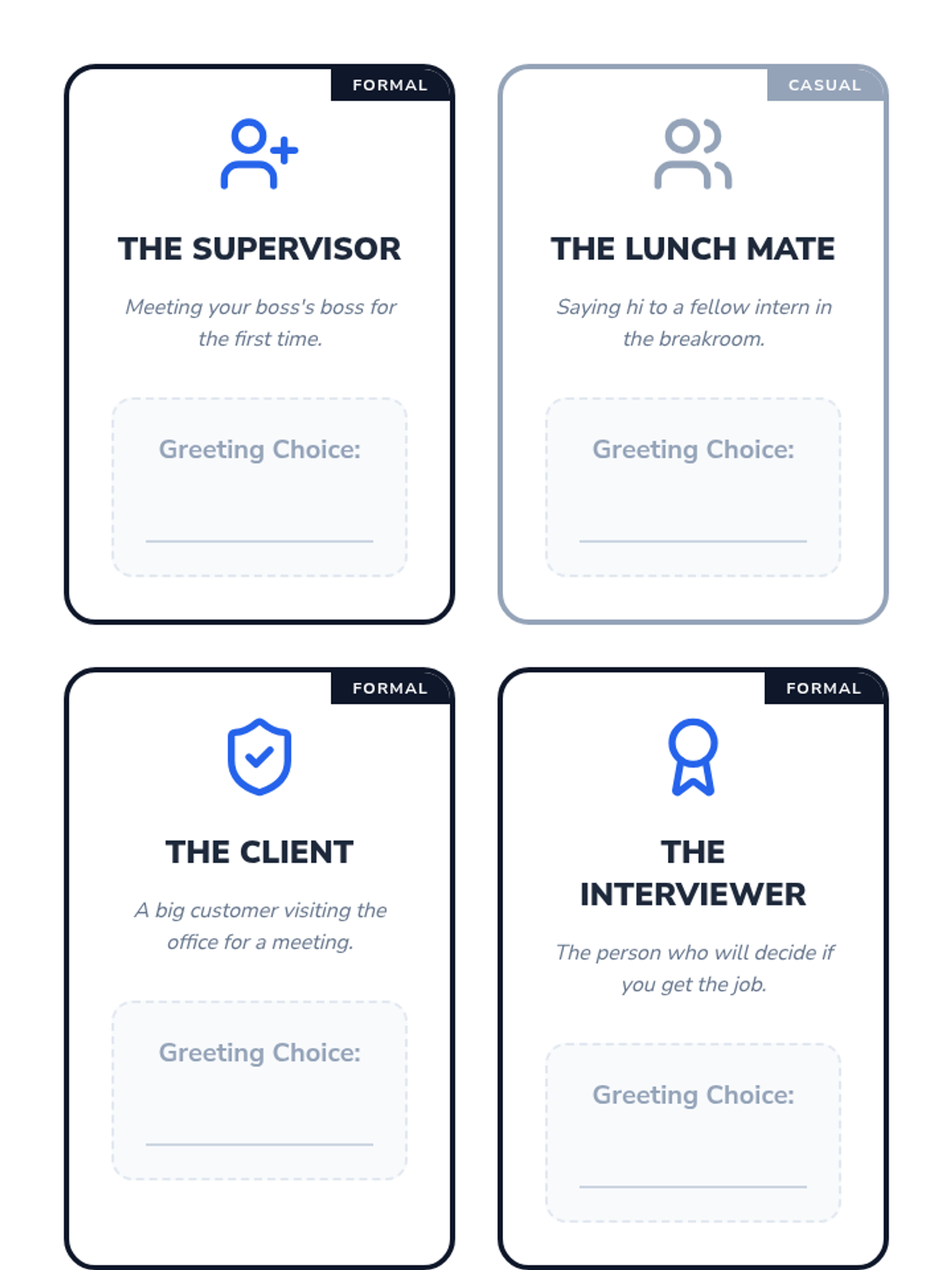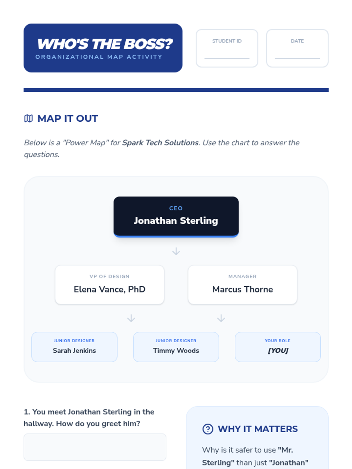 A comprehensive unit for 10th-grade students on navigating professional greetings within workplace hierarchies. Students learn physical mechanics, title usage, situational timing, and consistency across different professional roles to prepare for employment transitions.