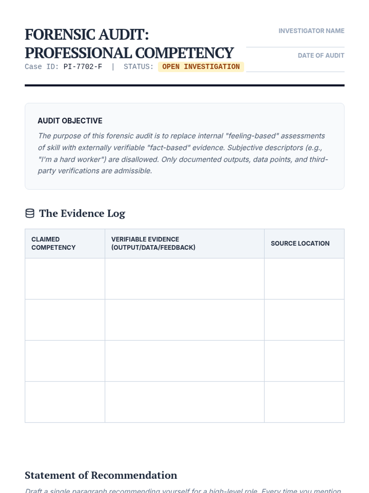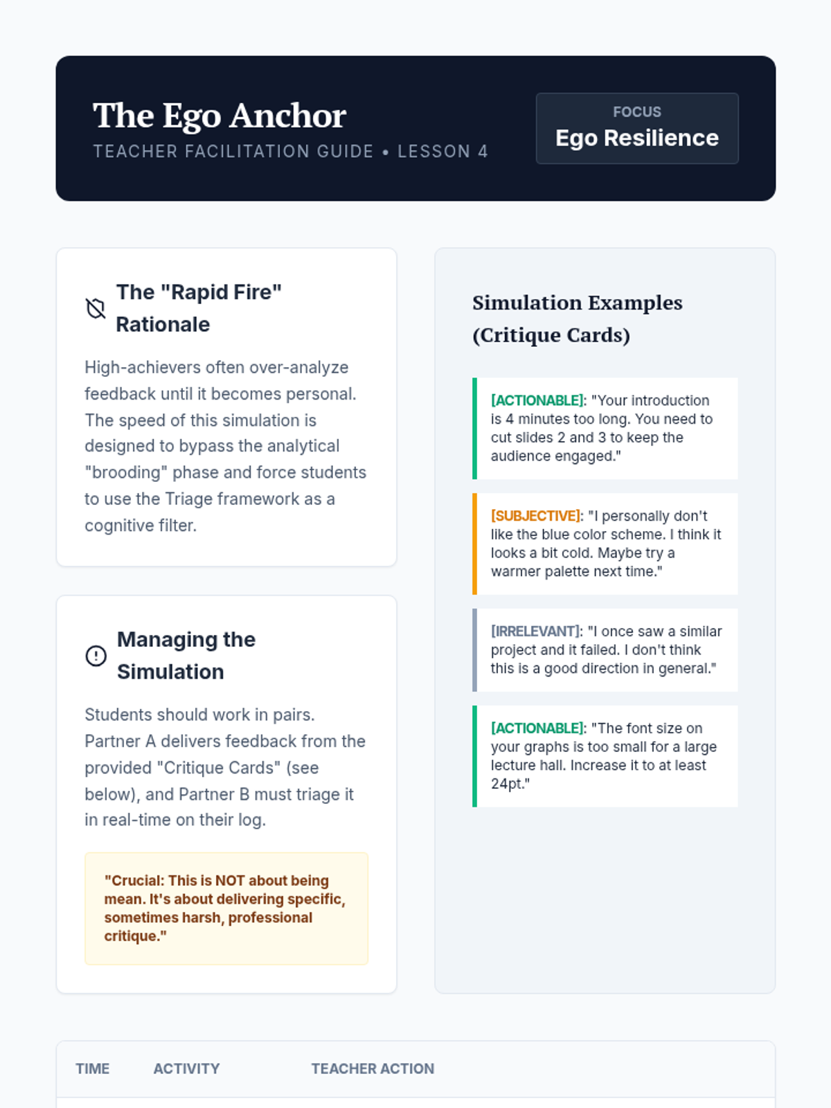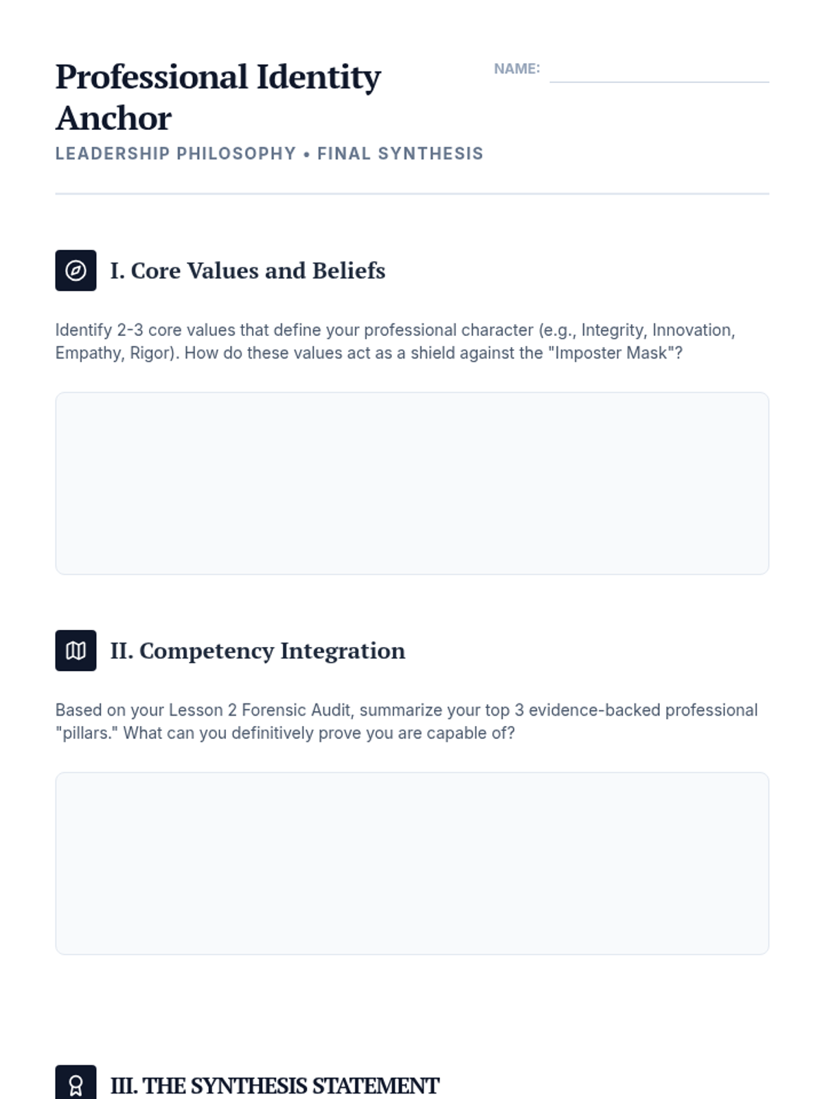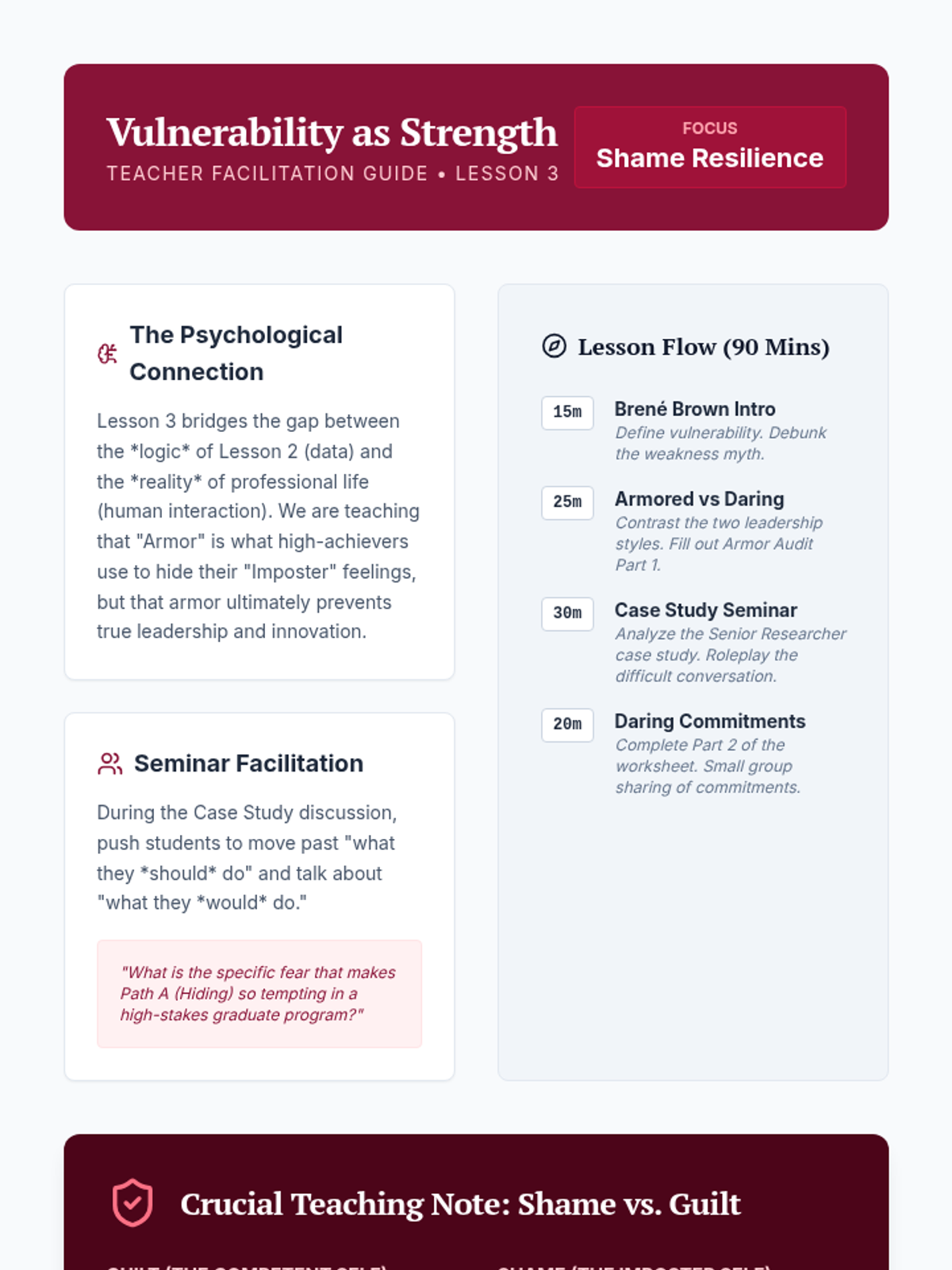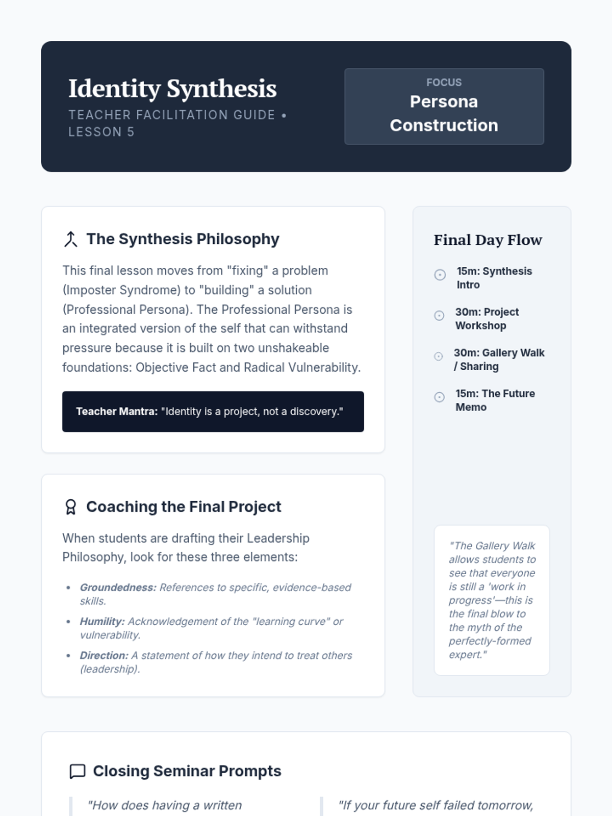 This sequence addresses the 'Imposter Phenomenon' in graduate studies and high-level careers. Students move from diagnosing imposter feelings using psychometric tools to developing evidence-based leadership identities and feedback-integration strategies.