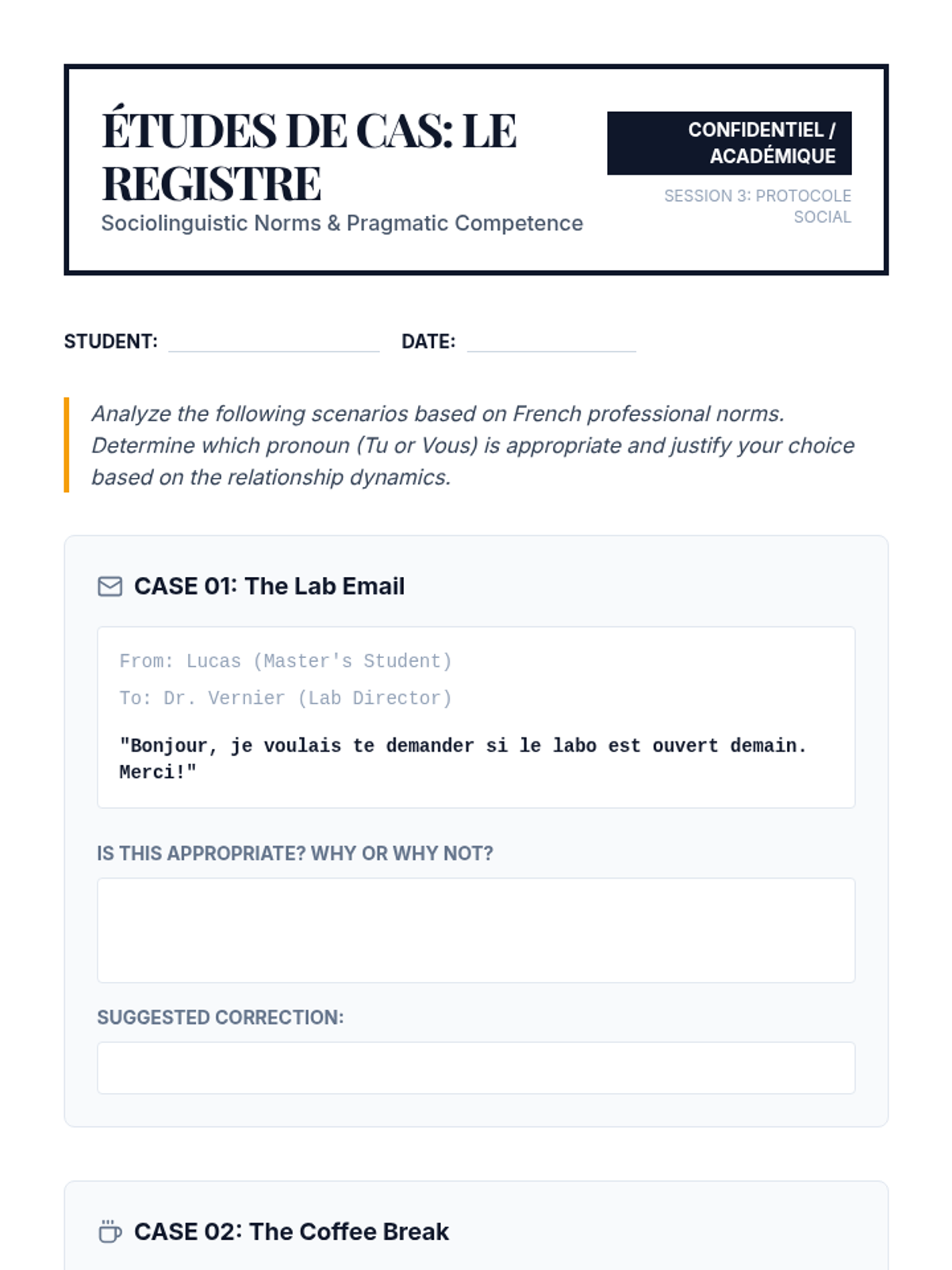 This sequence equips graduate students with French communication skills for academic and professional networking, focusing on formal registers, research descriptions, and scheduling.
