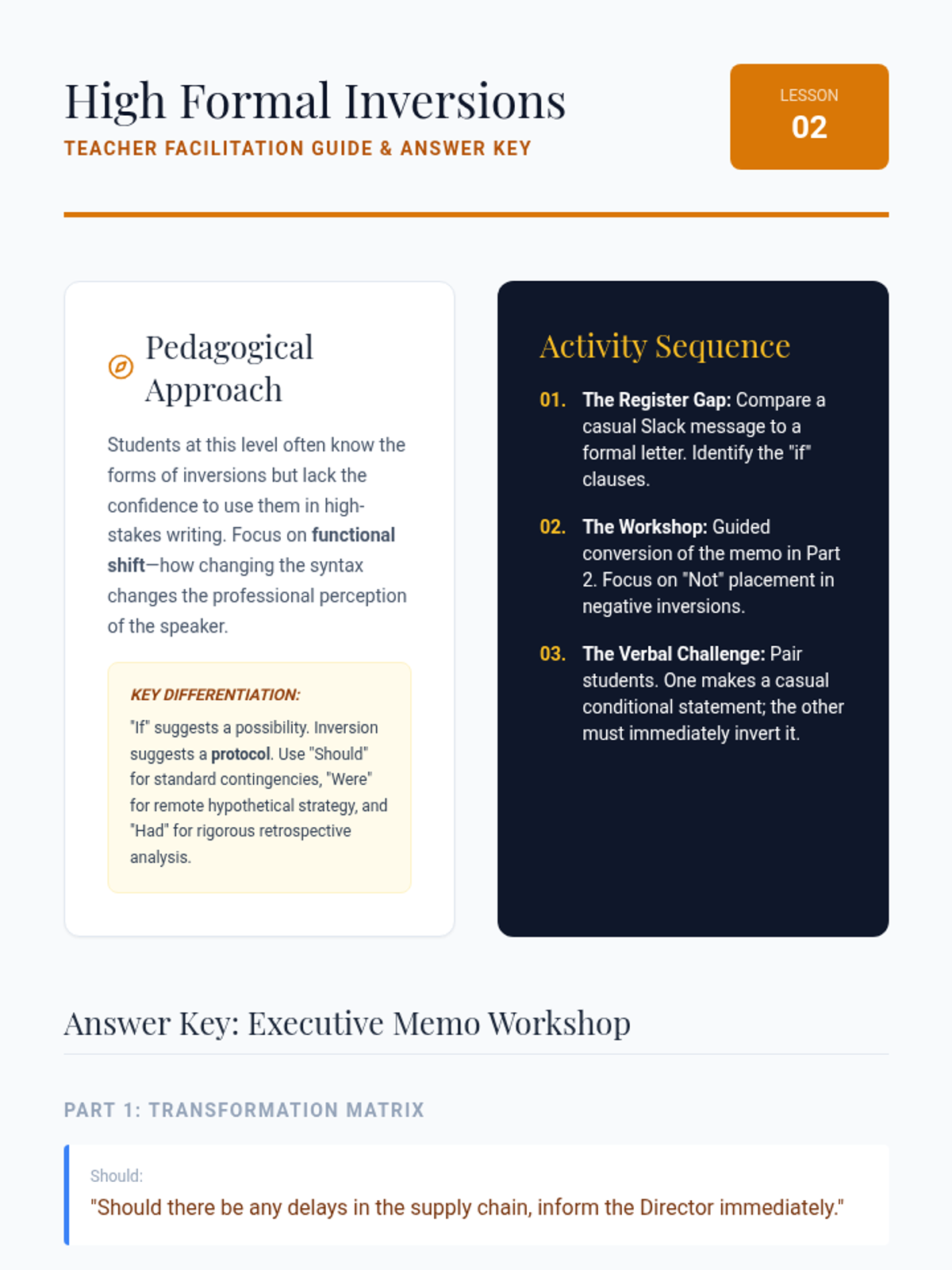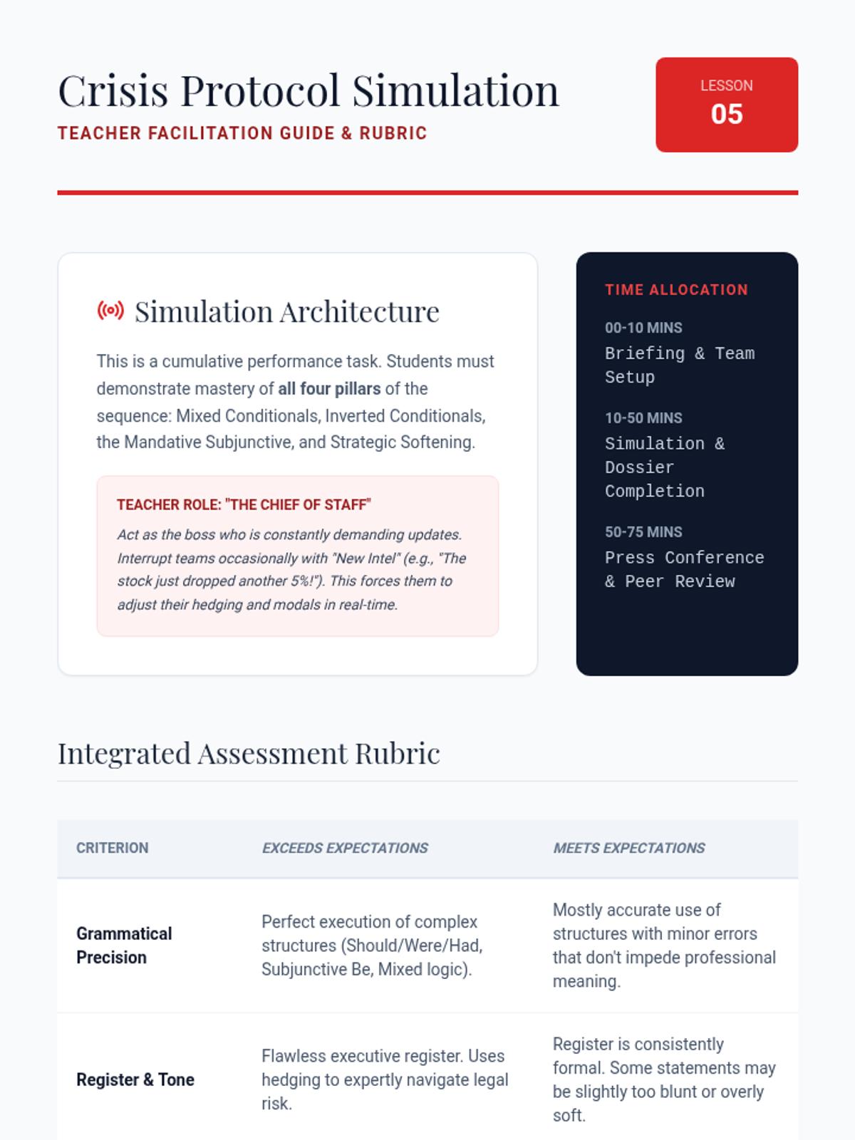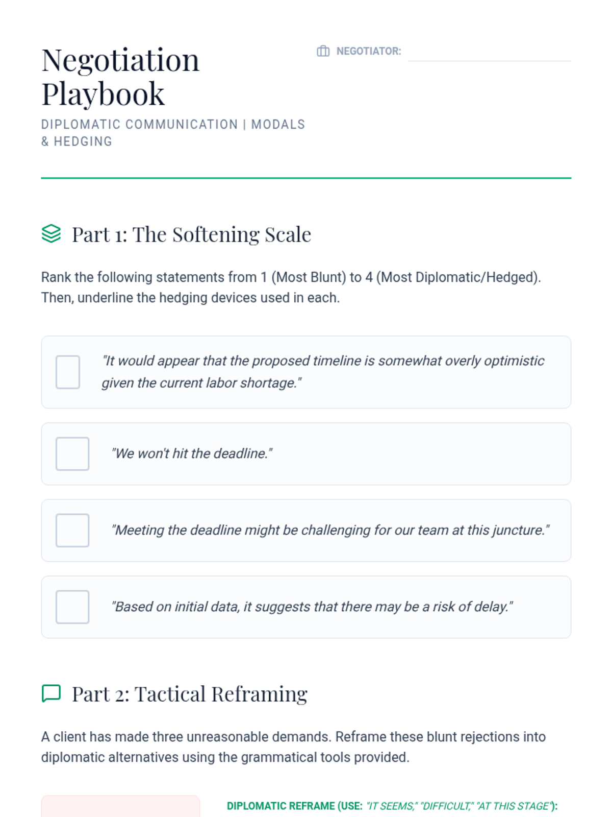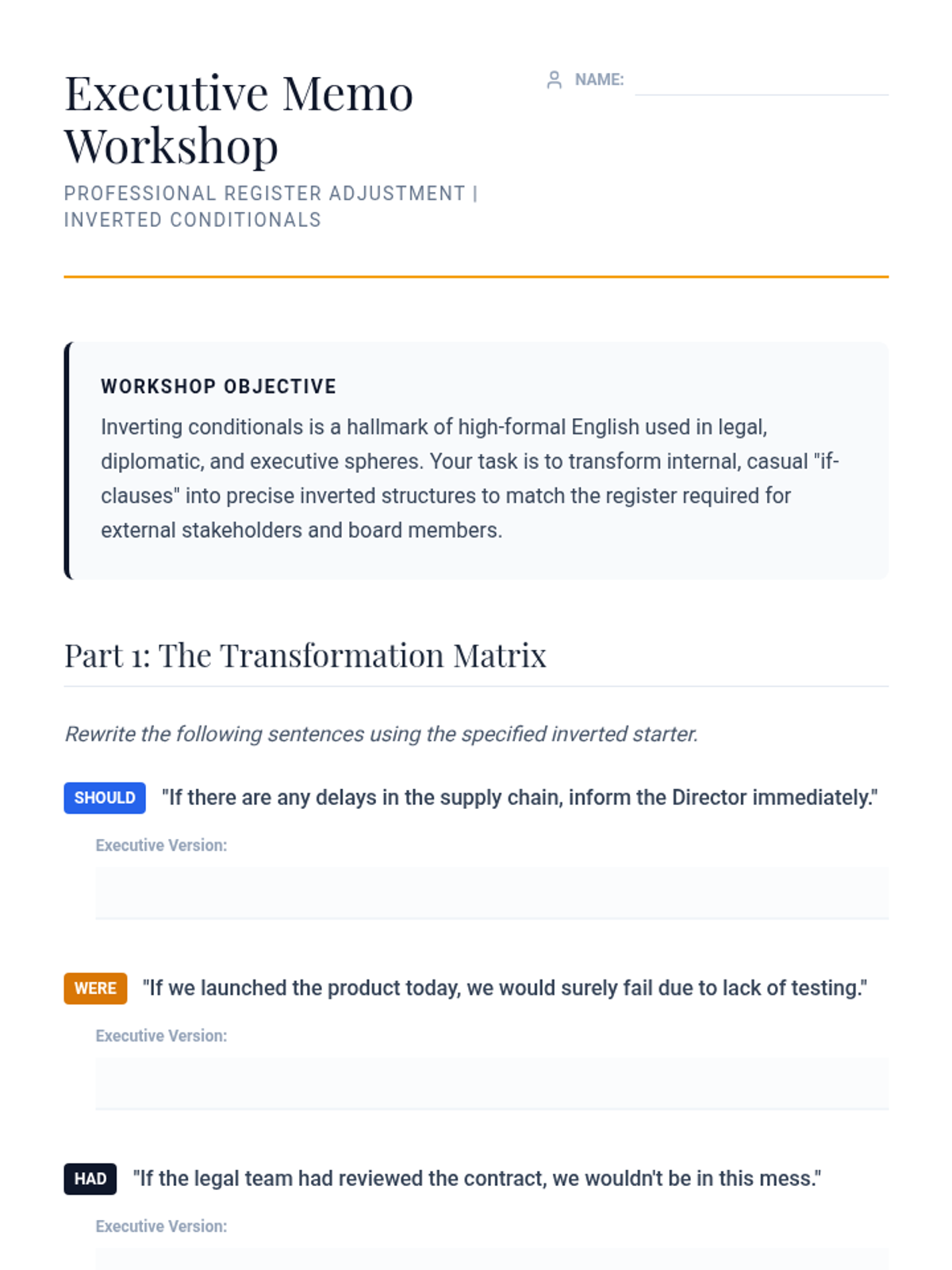 A specialized sequence for graduate-level English learners, focusing on advanced grammatical structures like mixed conditionals, inverted structures, and the mandative subjunctive as tools for professional negotiation, diplomacy, and strategic communication.