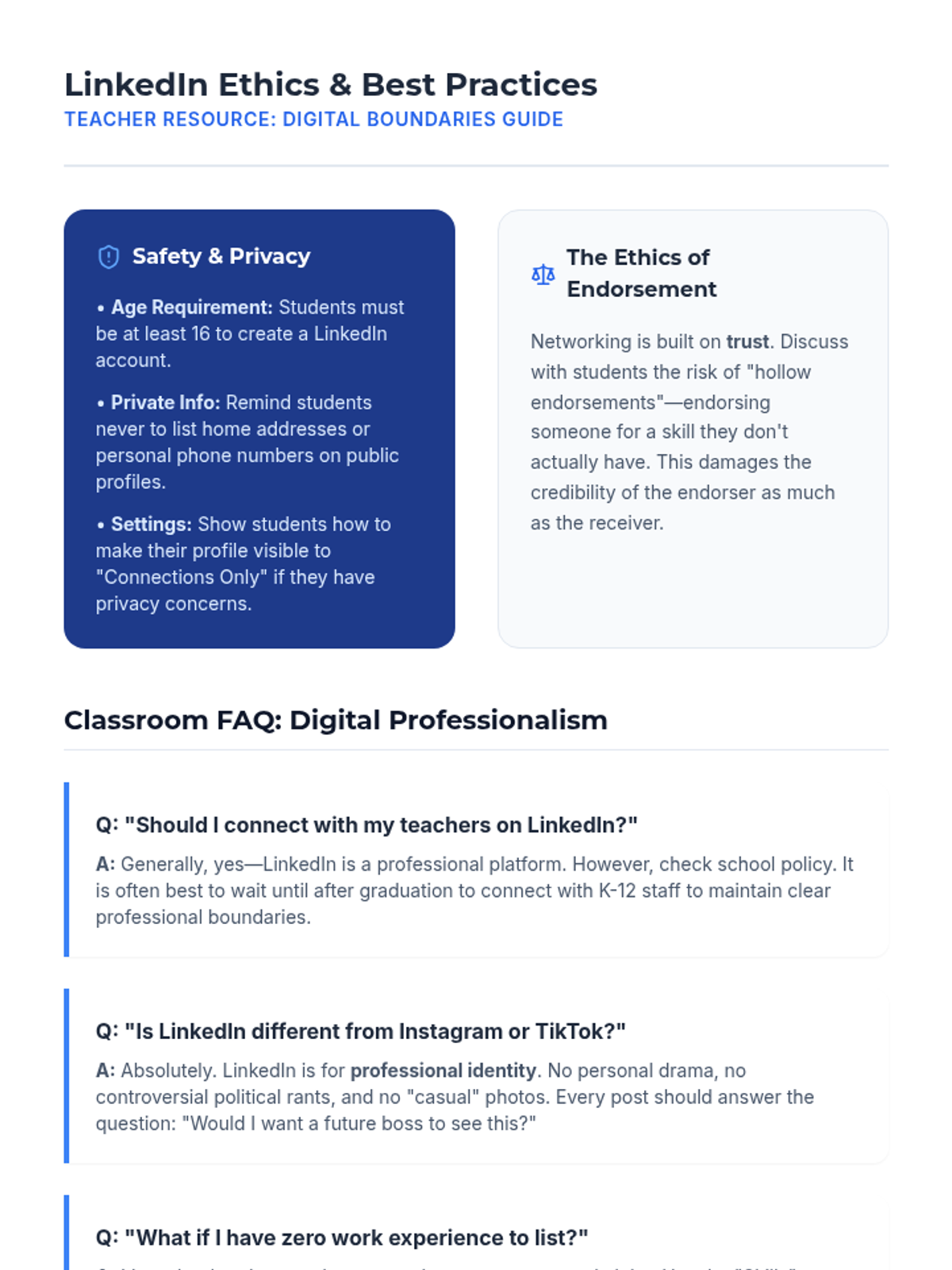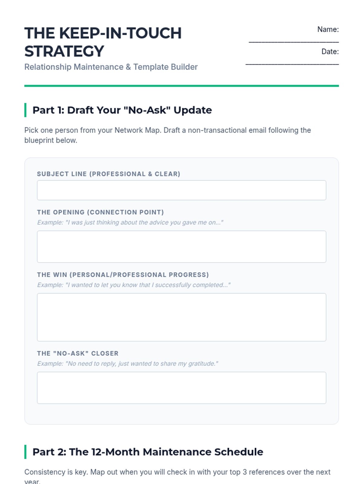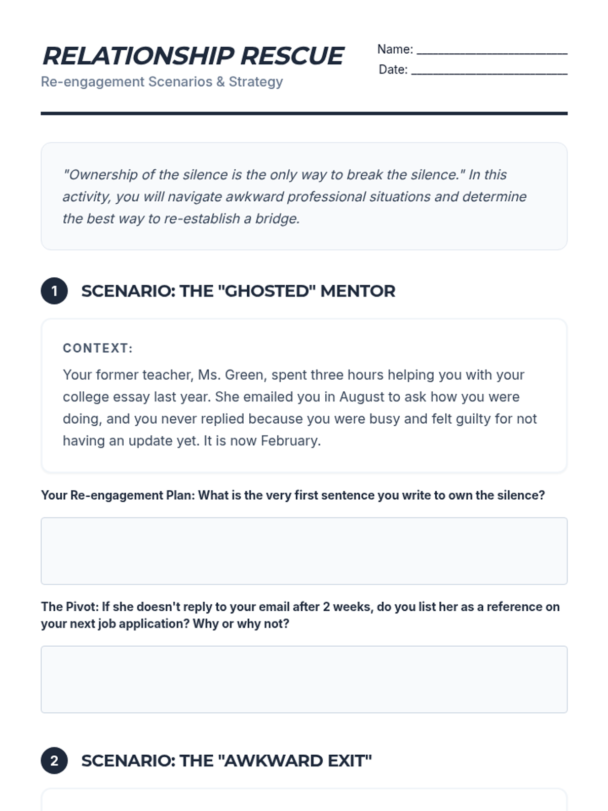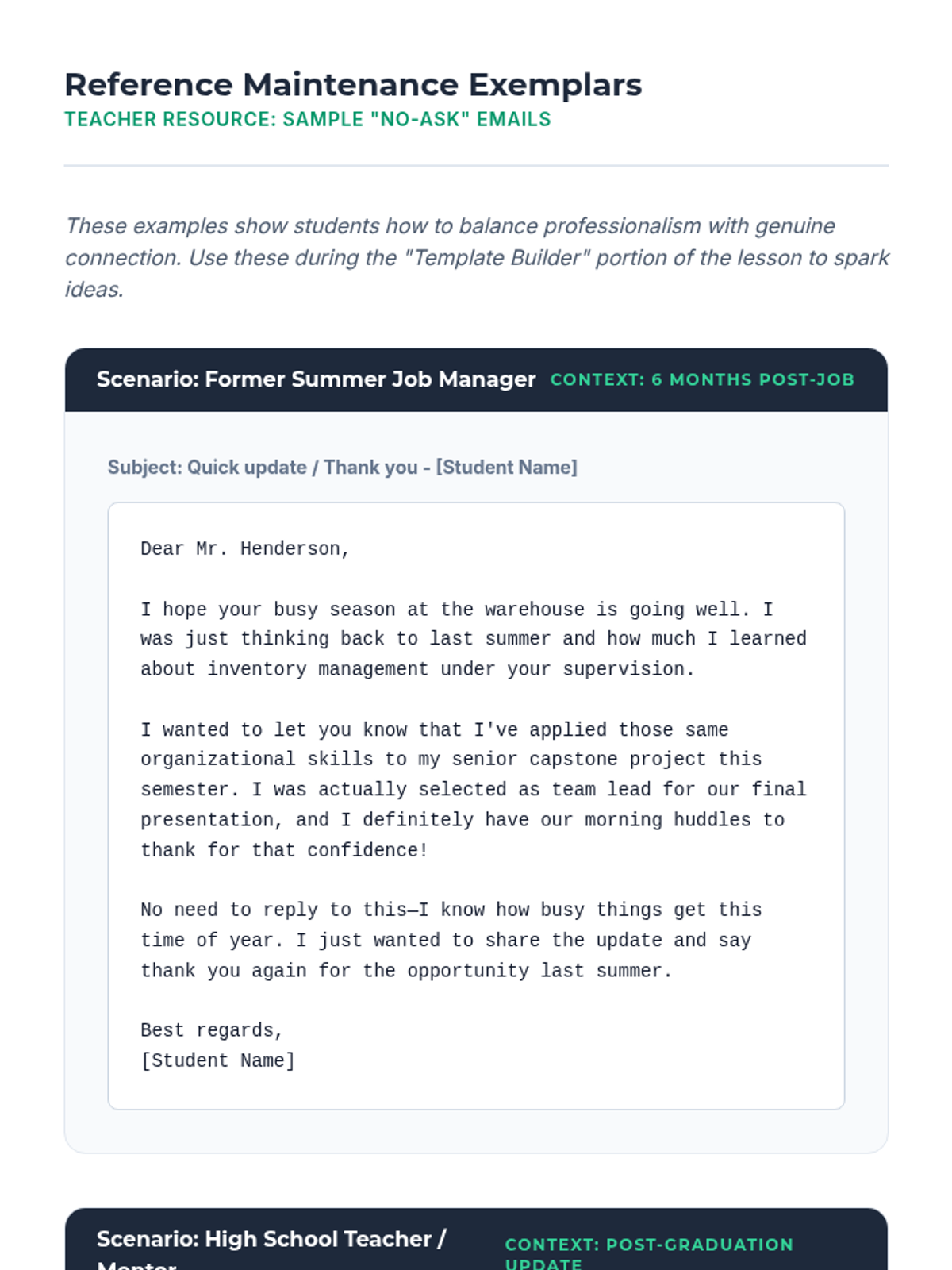A 12th-grade sequence focused on professional relationship maintenance, network mapping, and the ethical cultivation of long-term professional references. Students move beyond transactional requests to strategic connection management.