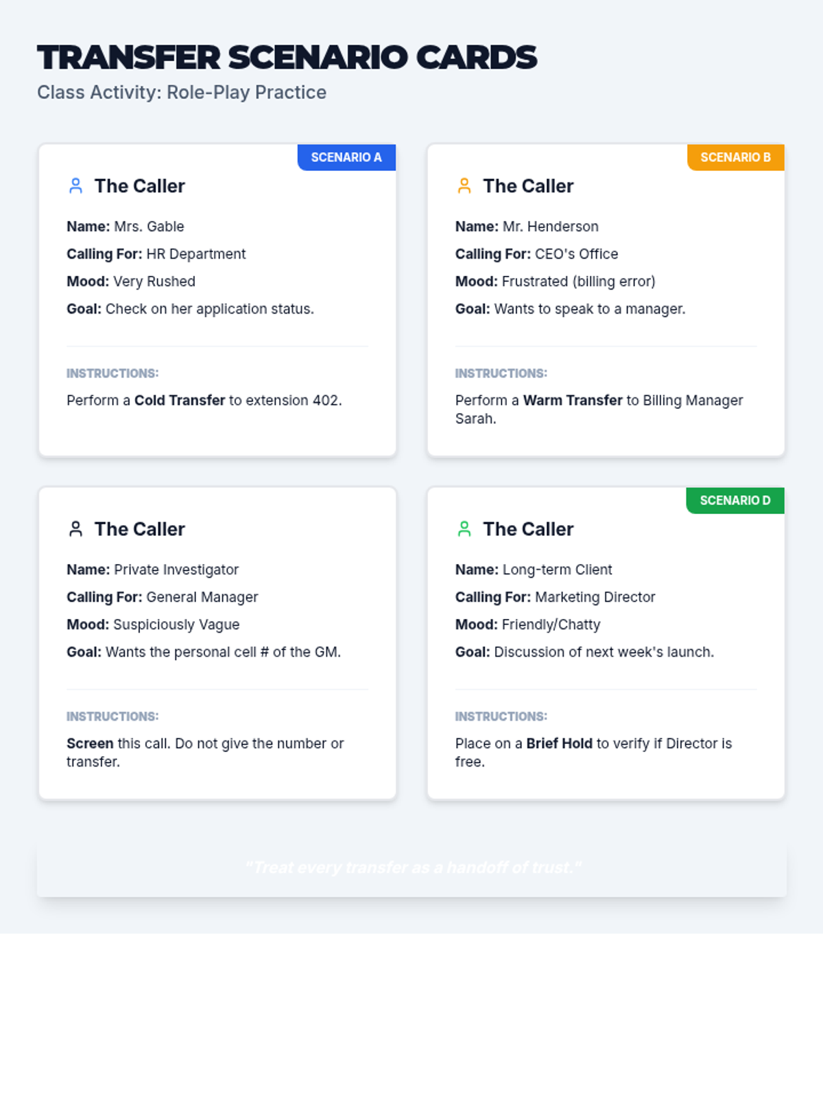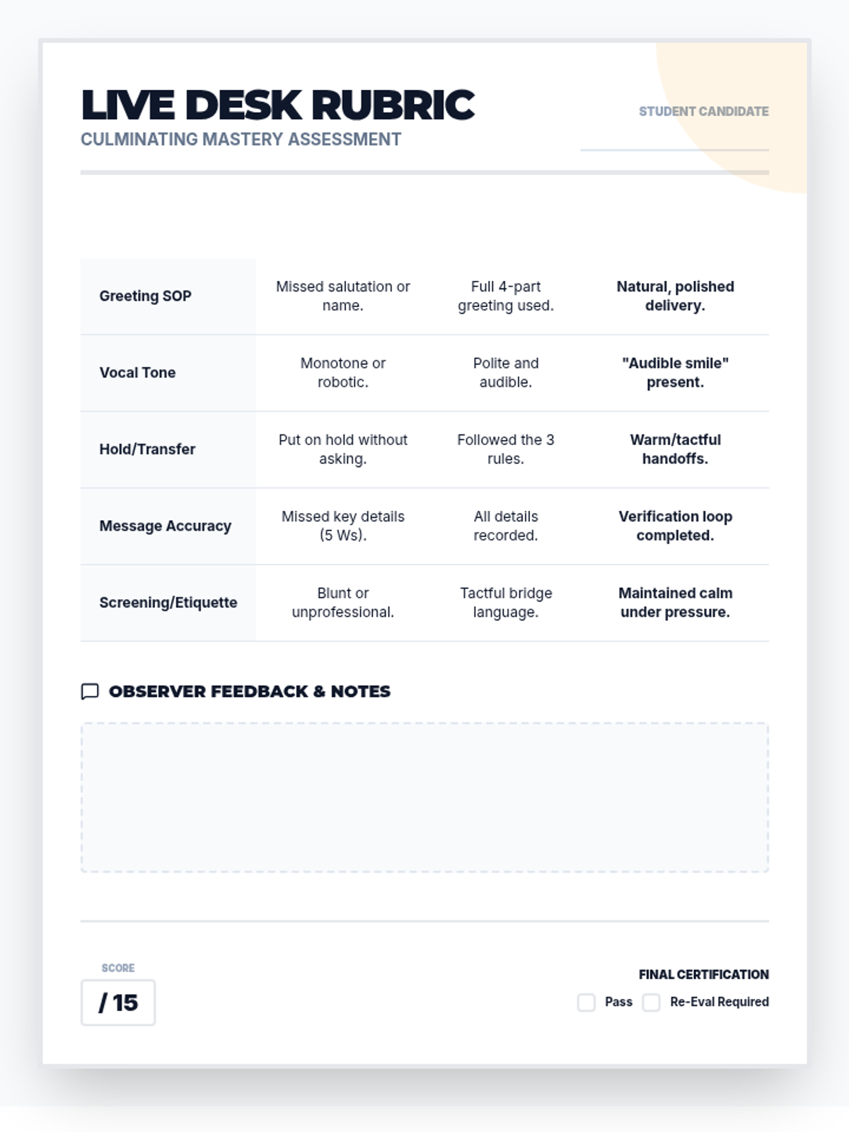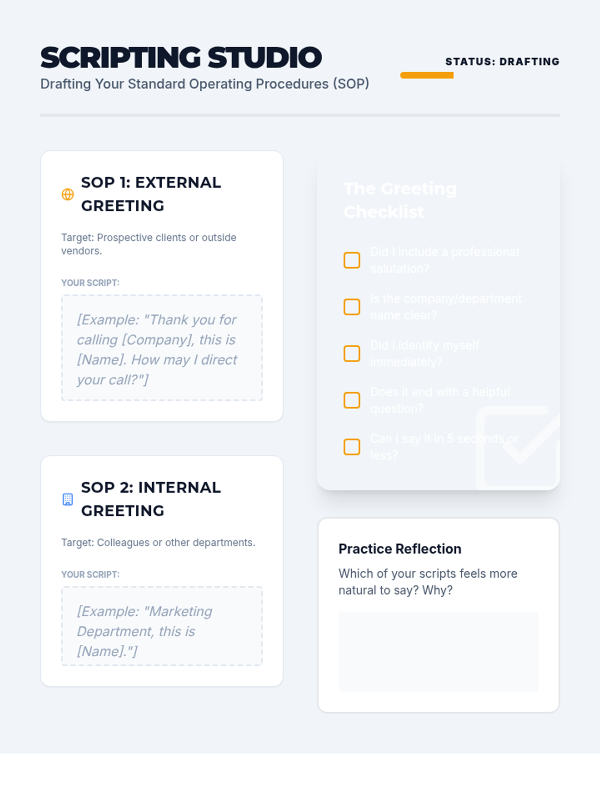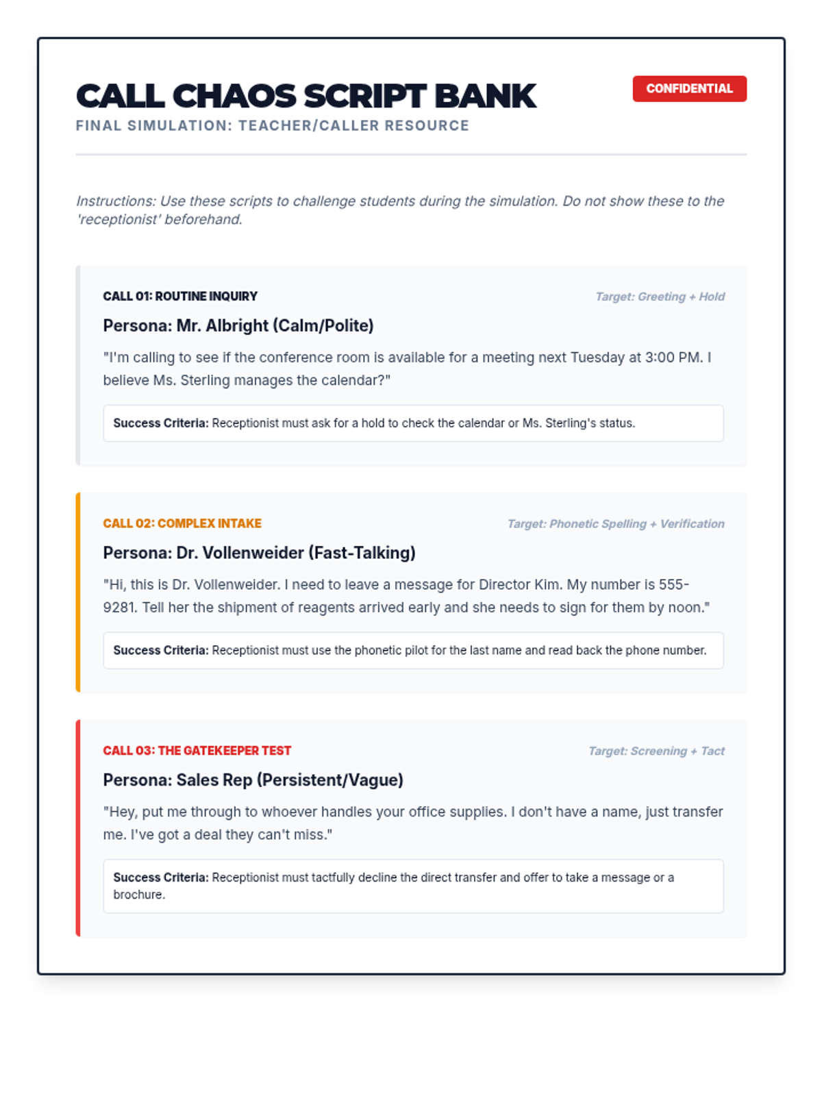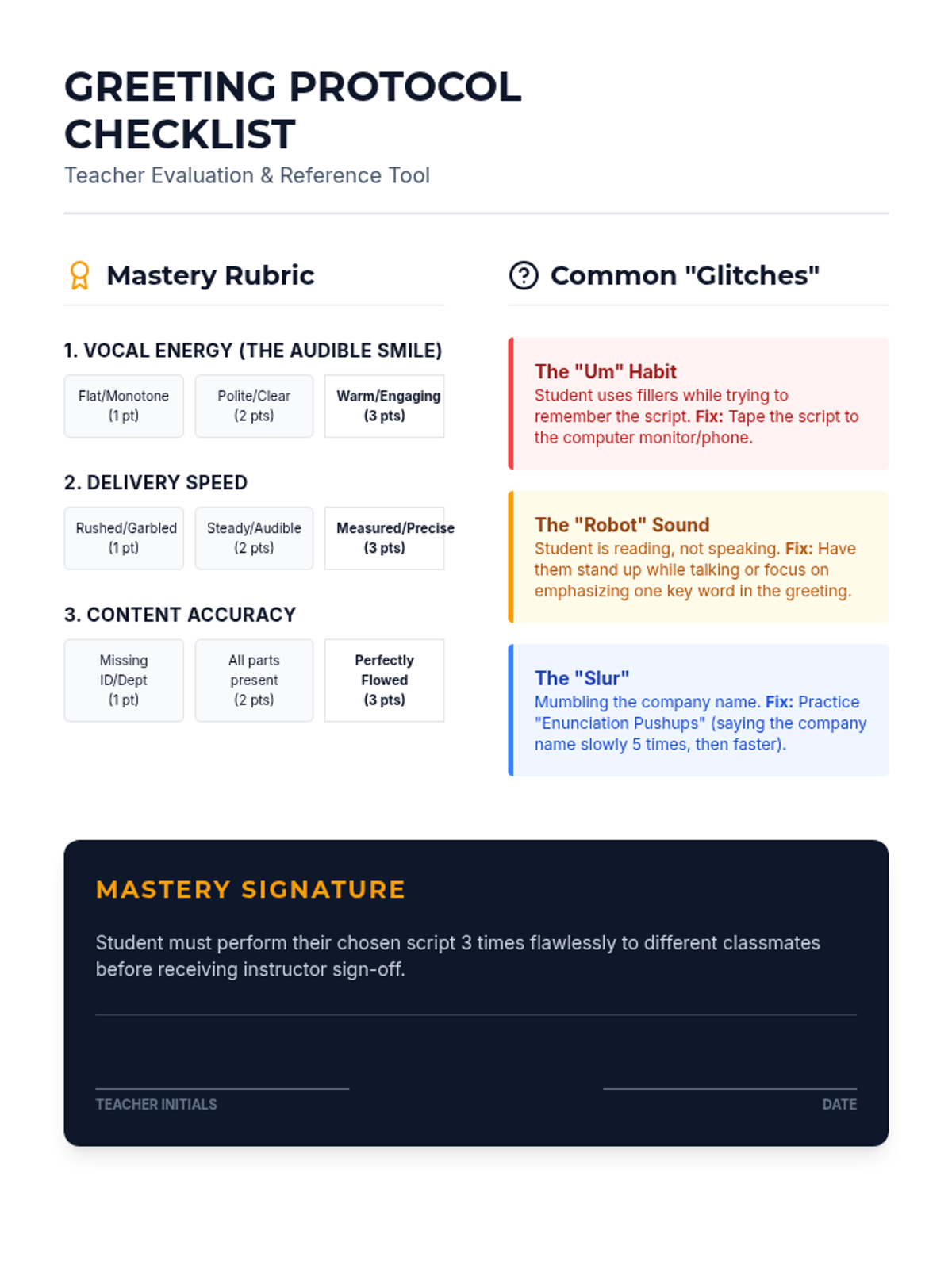 This sequence equips 12th-grade students with the essential verbal communication protocols for professional phone and voicemail interactions. Students will master vocal modulation, script development, accurate message taking, and technical call management through simulations and role-play.