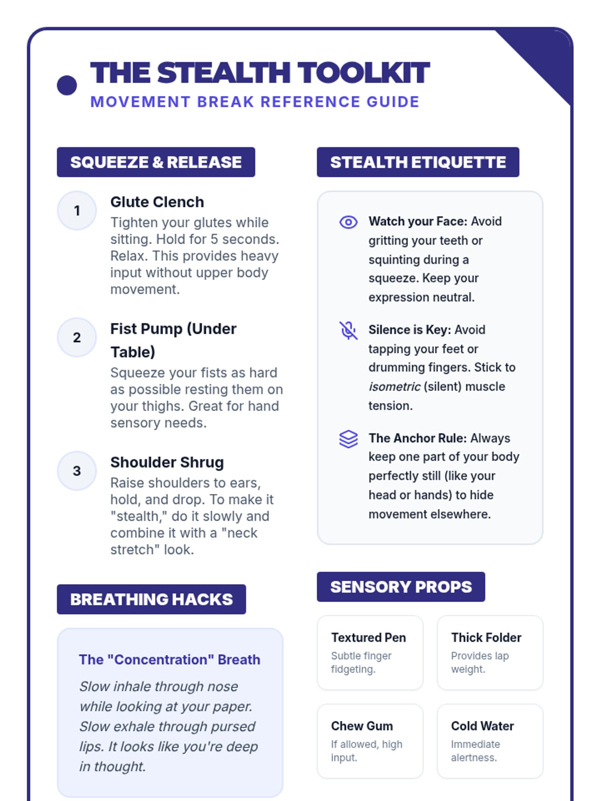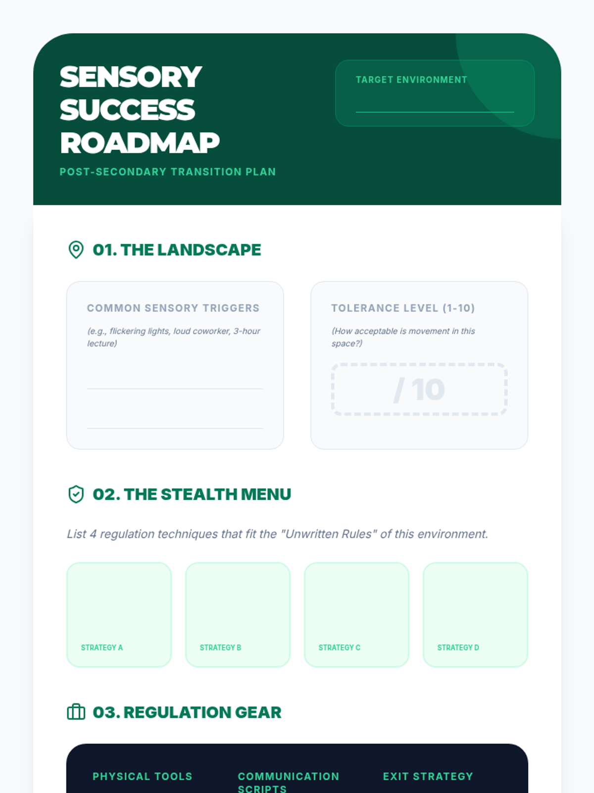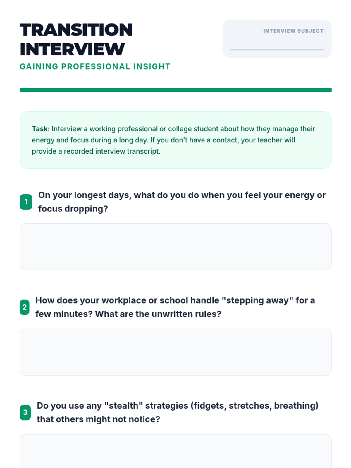 This sequence prepares 10th-grade students to adapt sensory regulation and movement strategies for professional, academic, and social settings beyond the classroom. Students learn to analyze environment-specific norms, practice discreet 'stealth' techniques, and plan for their post-secondary transition into careers and higher education.
