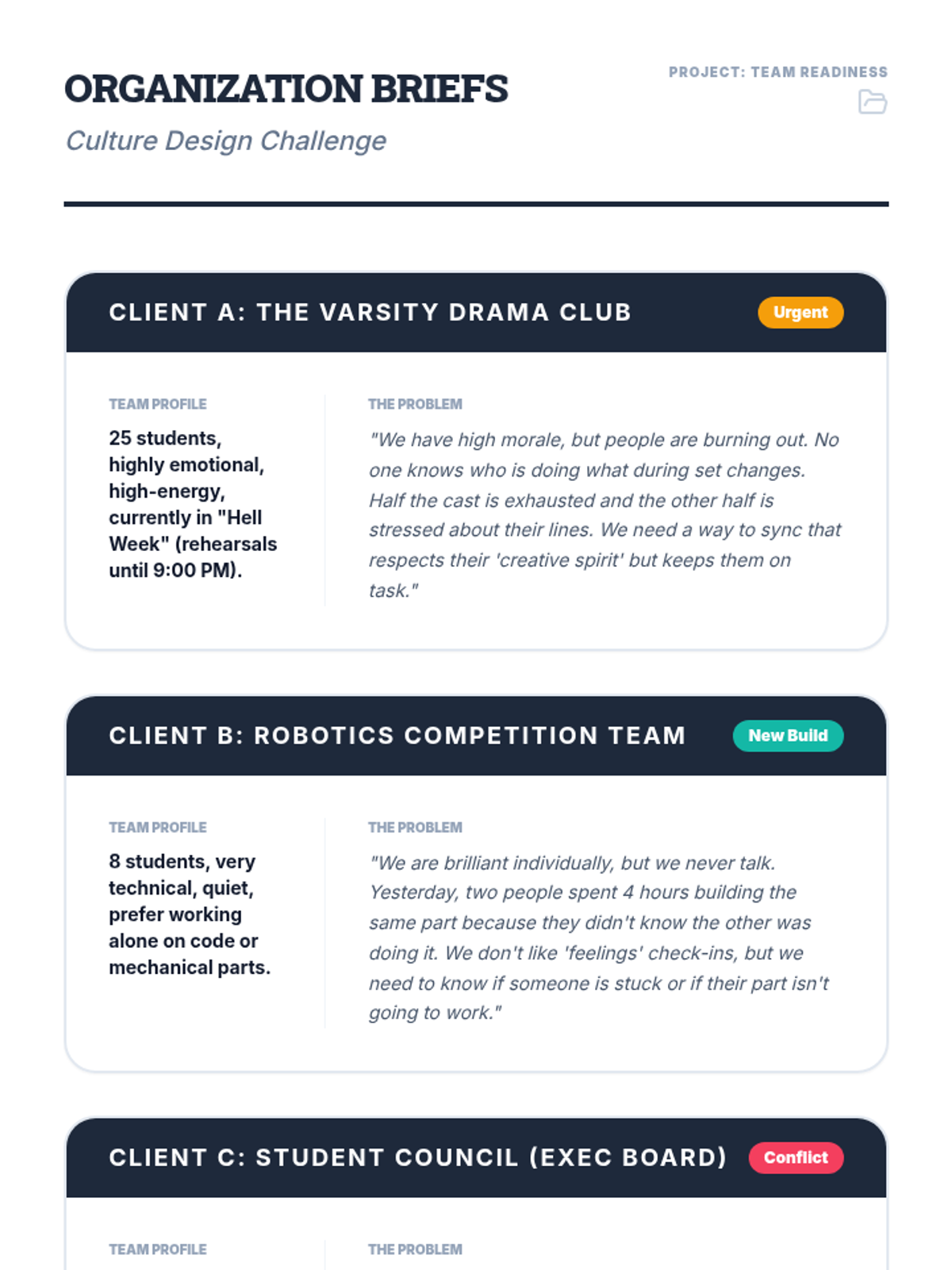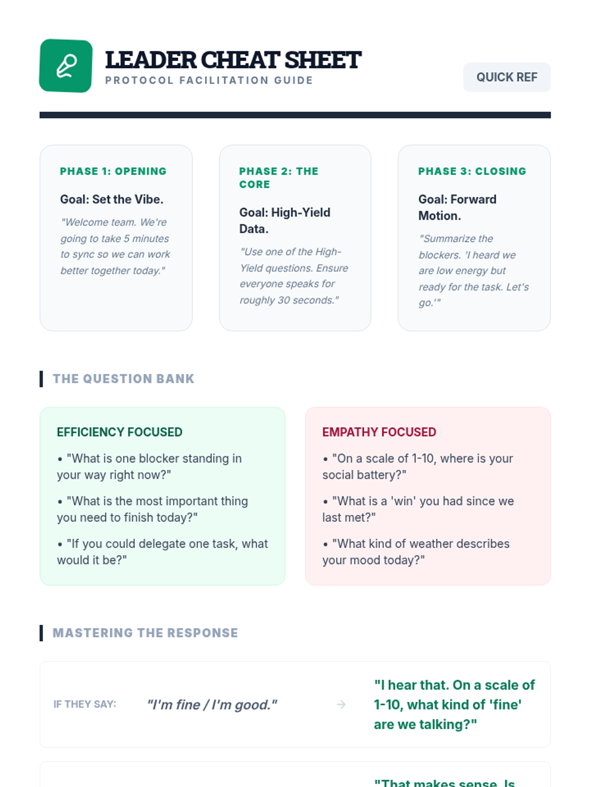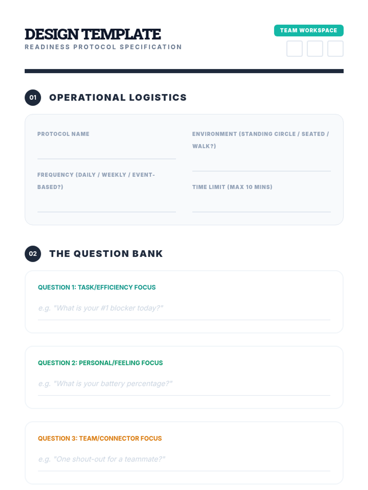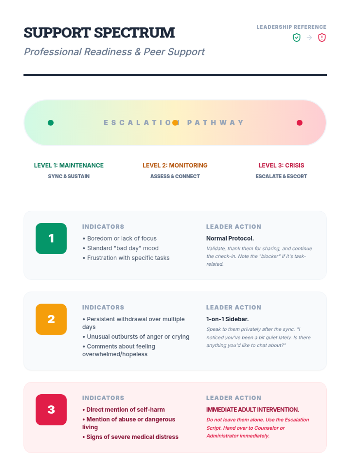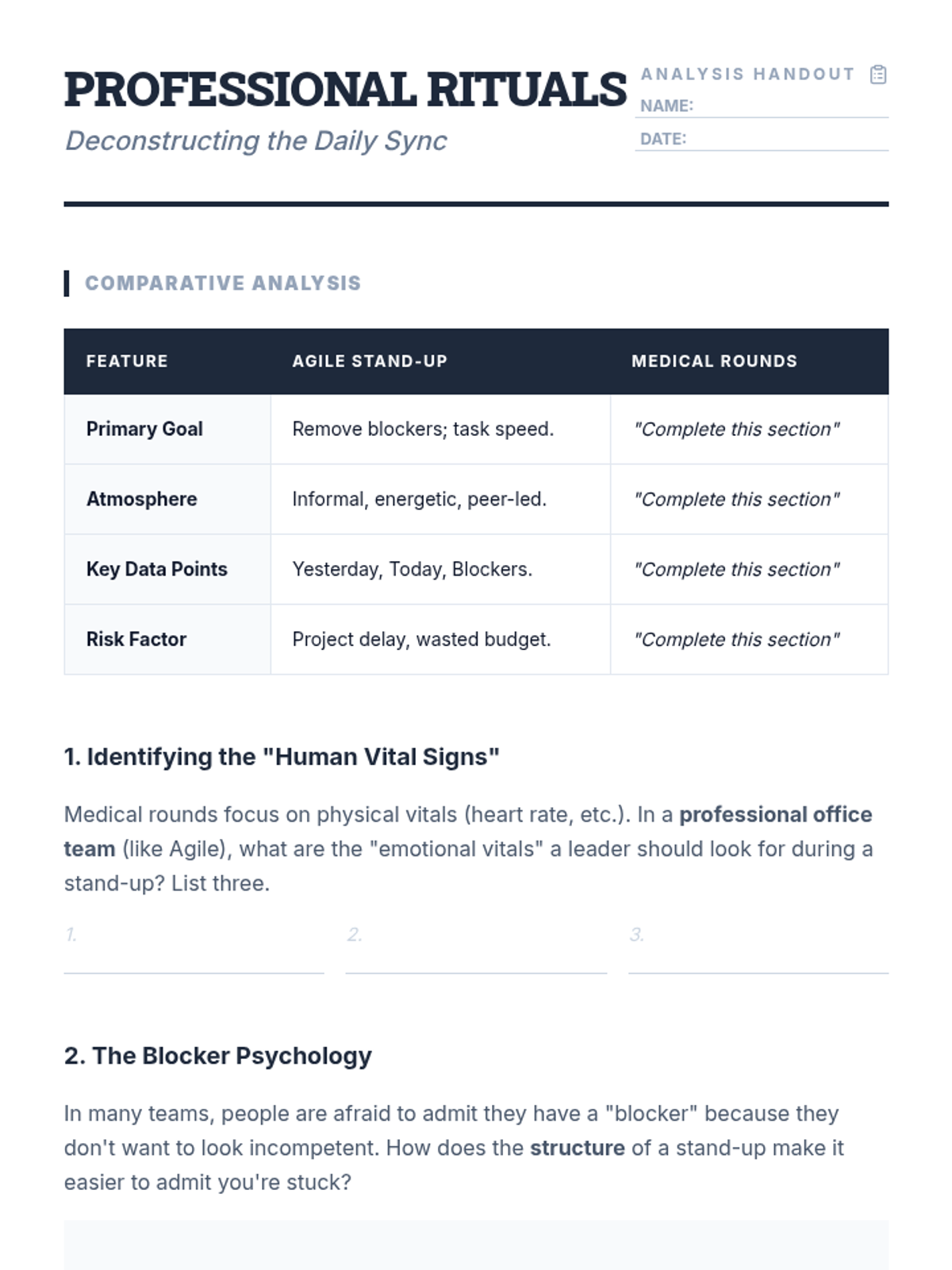 This sequence frames daily check-ins as a professional leadership and team management competency. Students explore psychological safety, real-world professional stand-ups, and facilitation techniques to design their own 'Readiness Protocols' for teams.