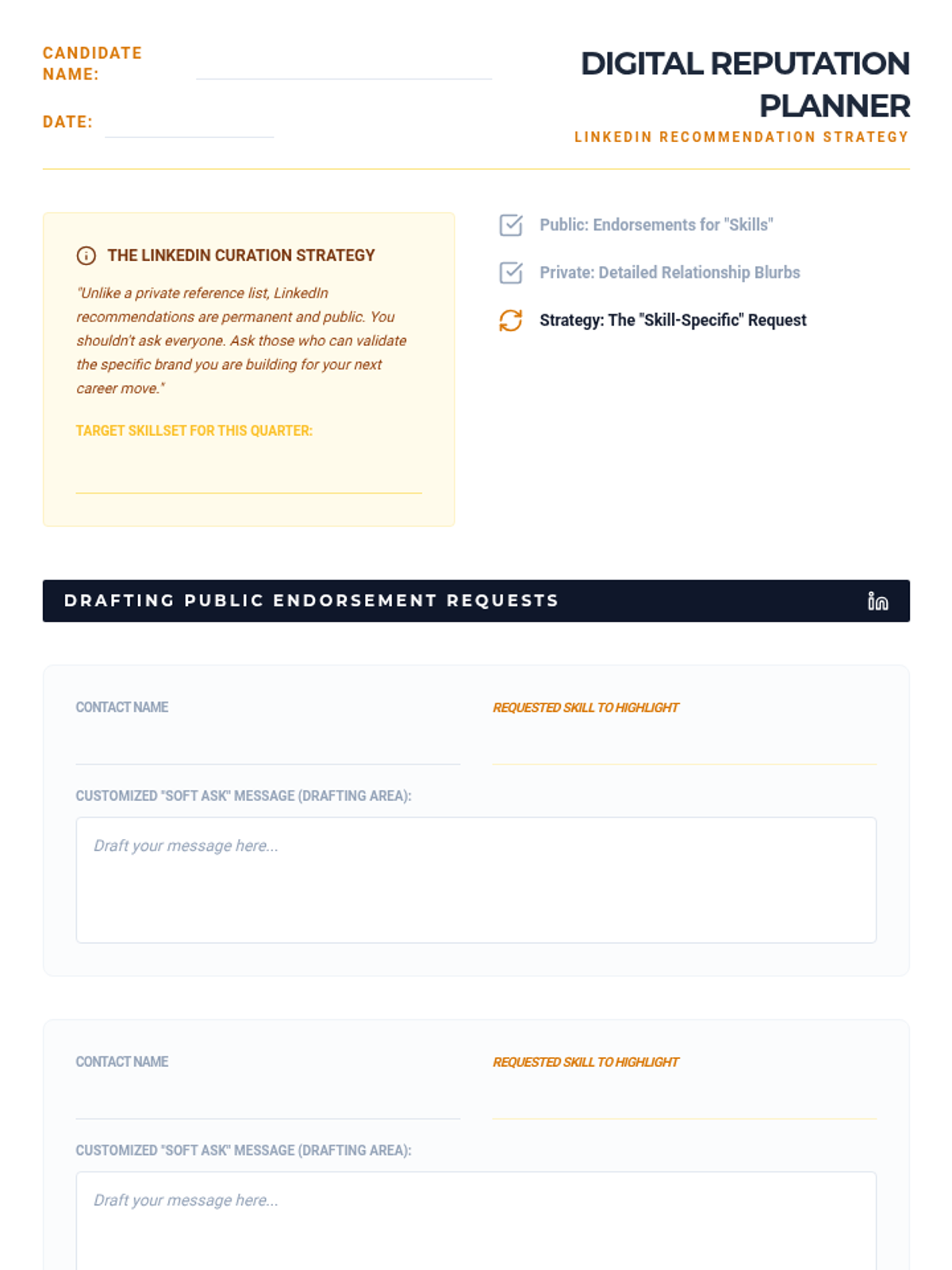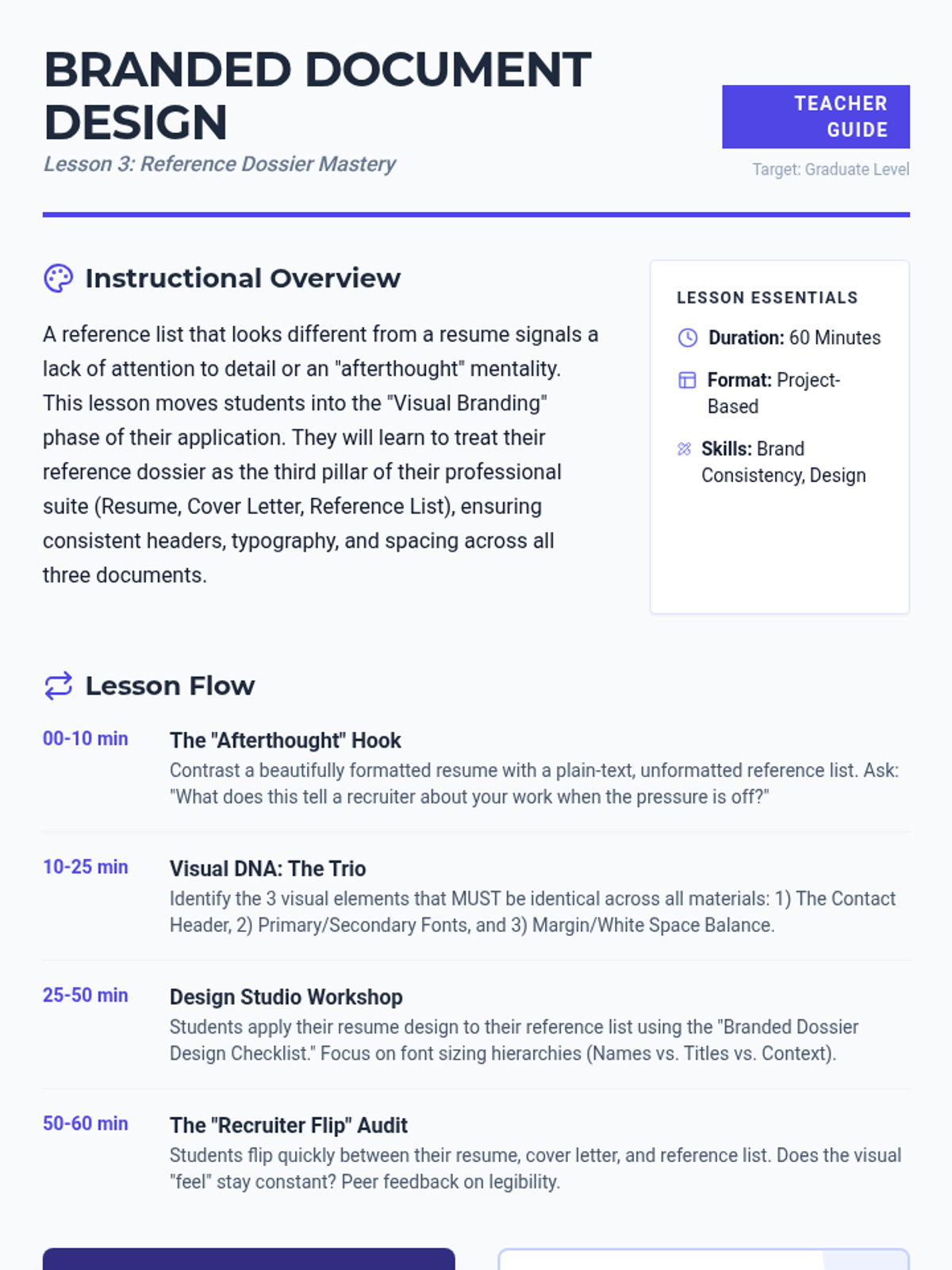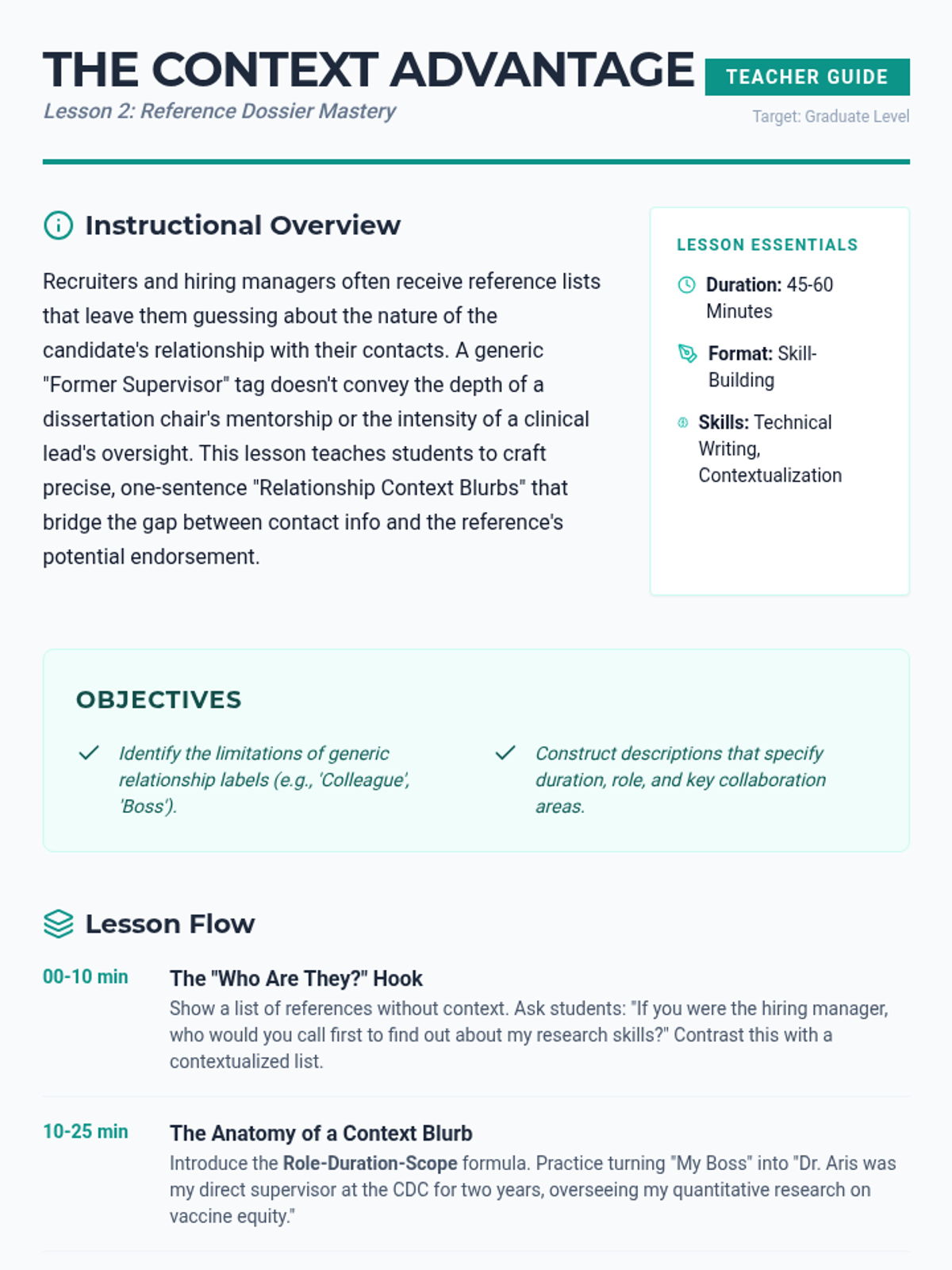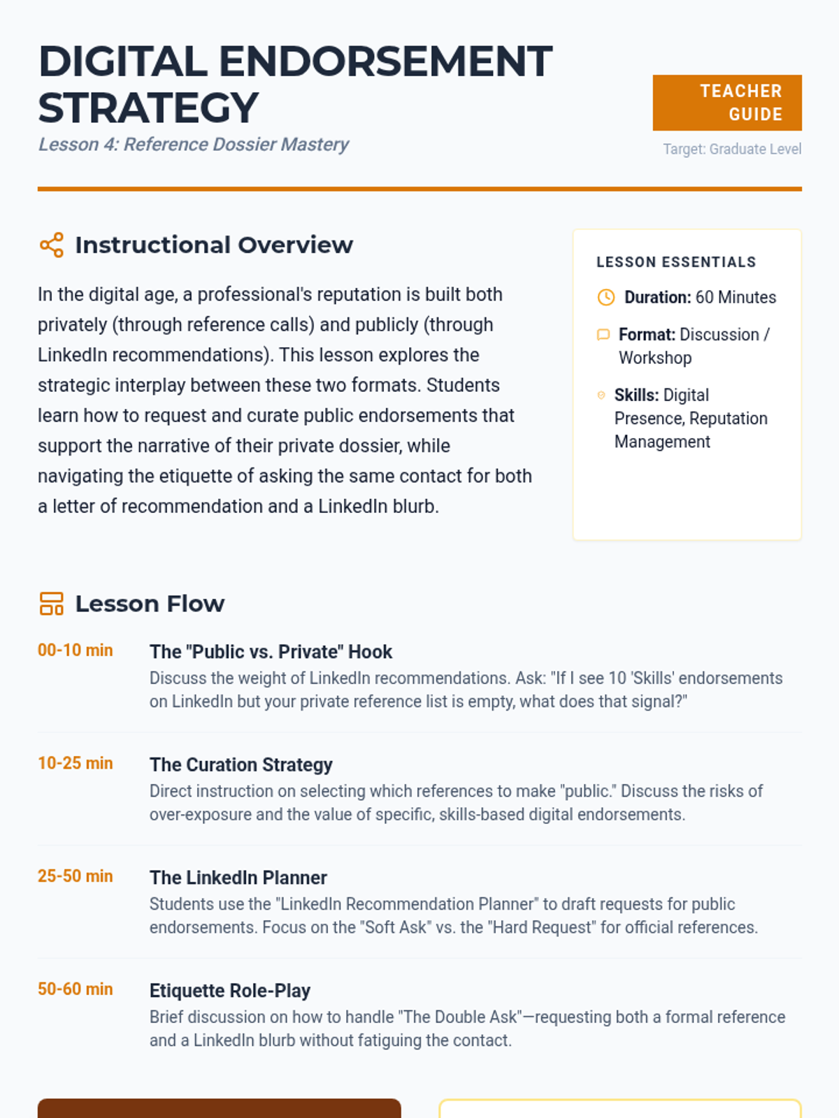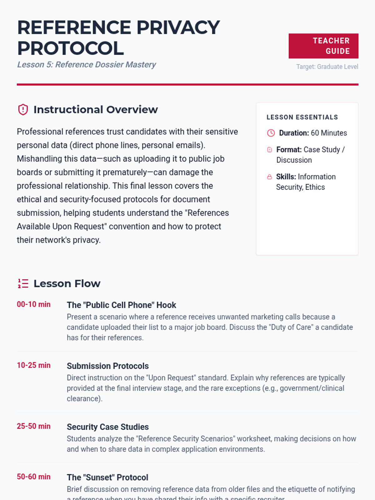 A comprehensive workshop series for graduate students on formatting, presenting, and securing professional reference dossiers. This sequence moves from basic data accuracy to advanced personal branding and digital reputation management.