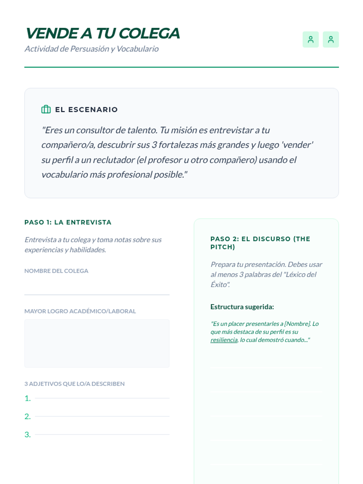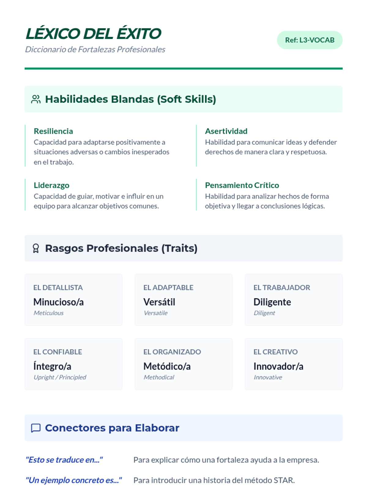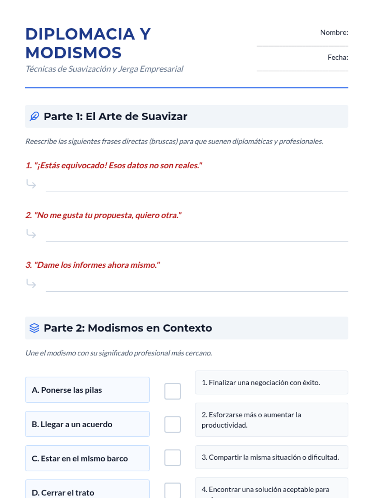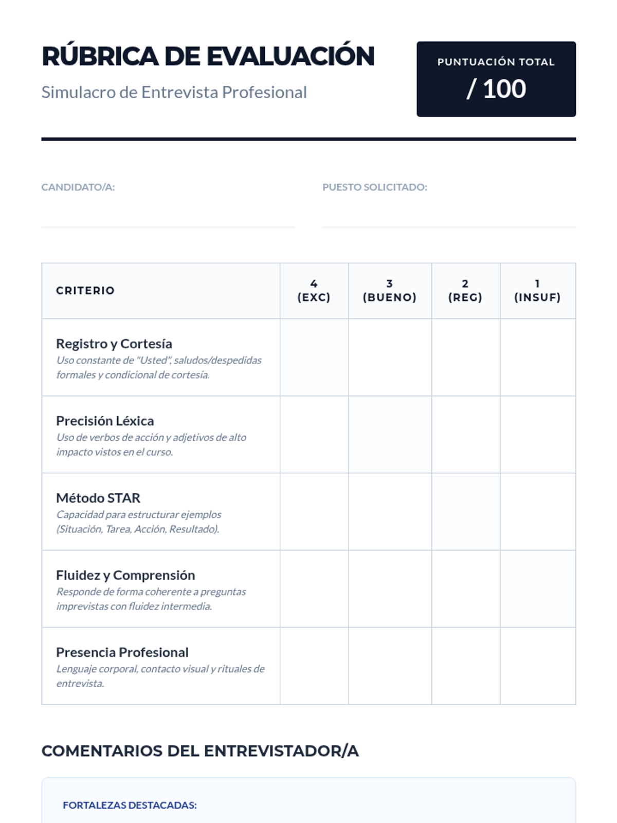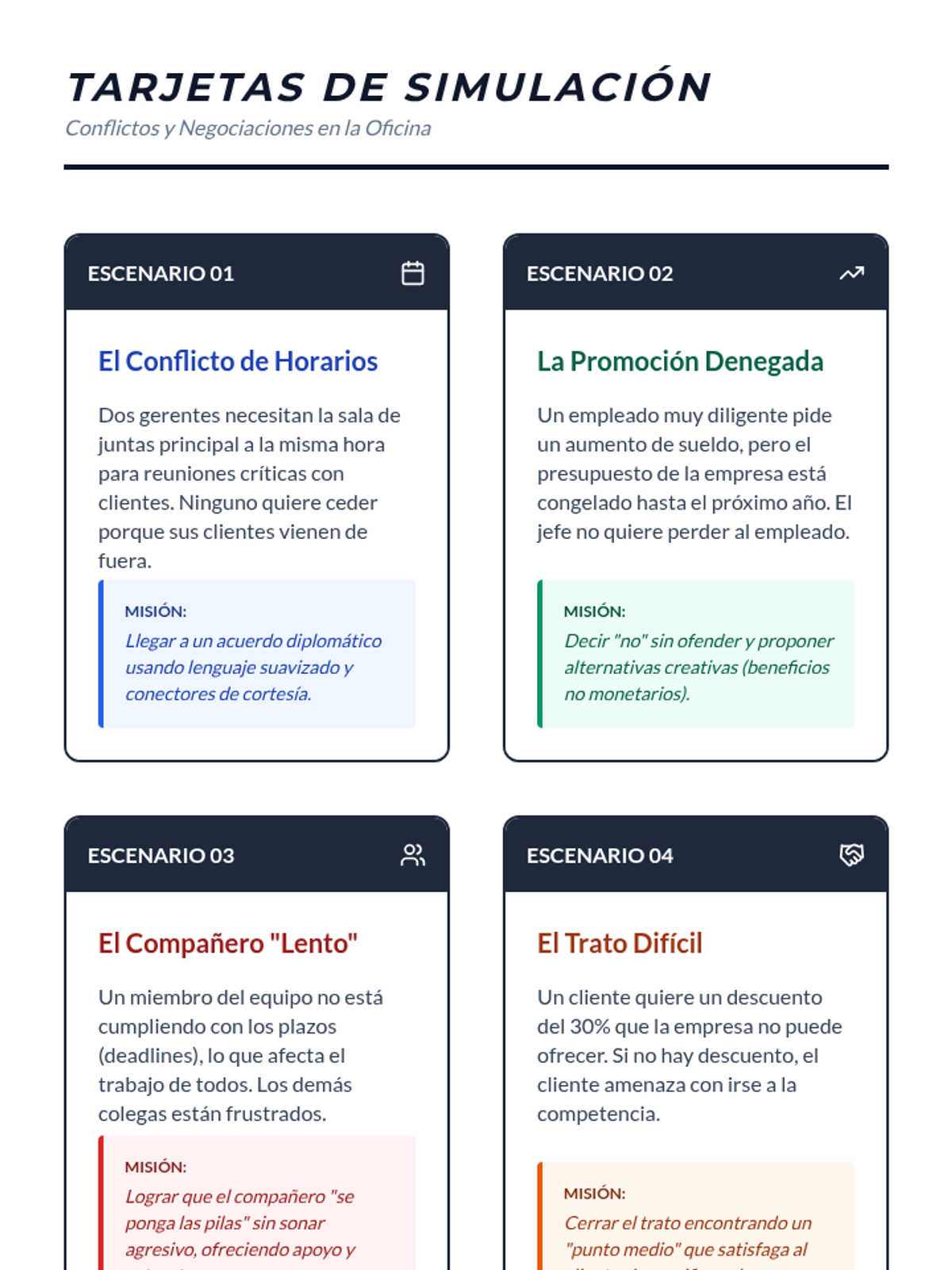 This sequence prepares intermediate Spanish students for professional environments by focusing on specialized vocabulary, formal registers, and workplace communication protocols. Students progress from written self-presentation in CVs and cover letters to oral proficiency in interviews and workplace negotiations.