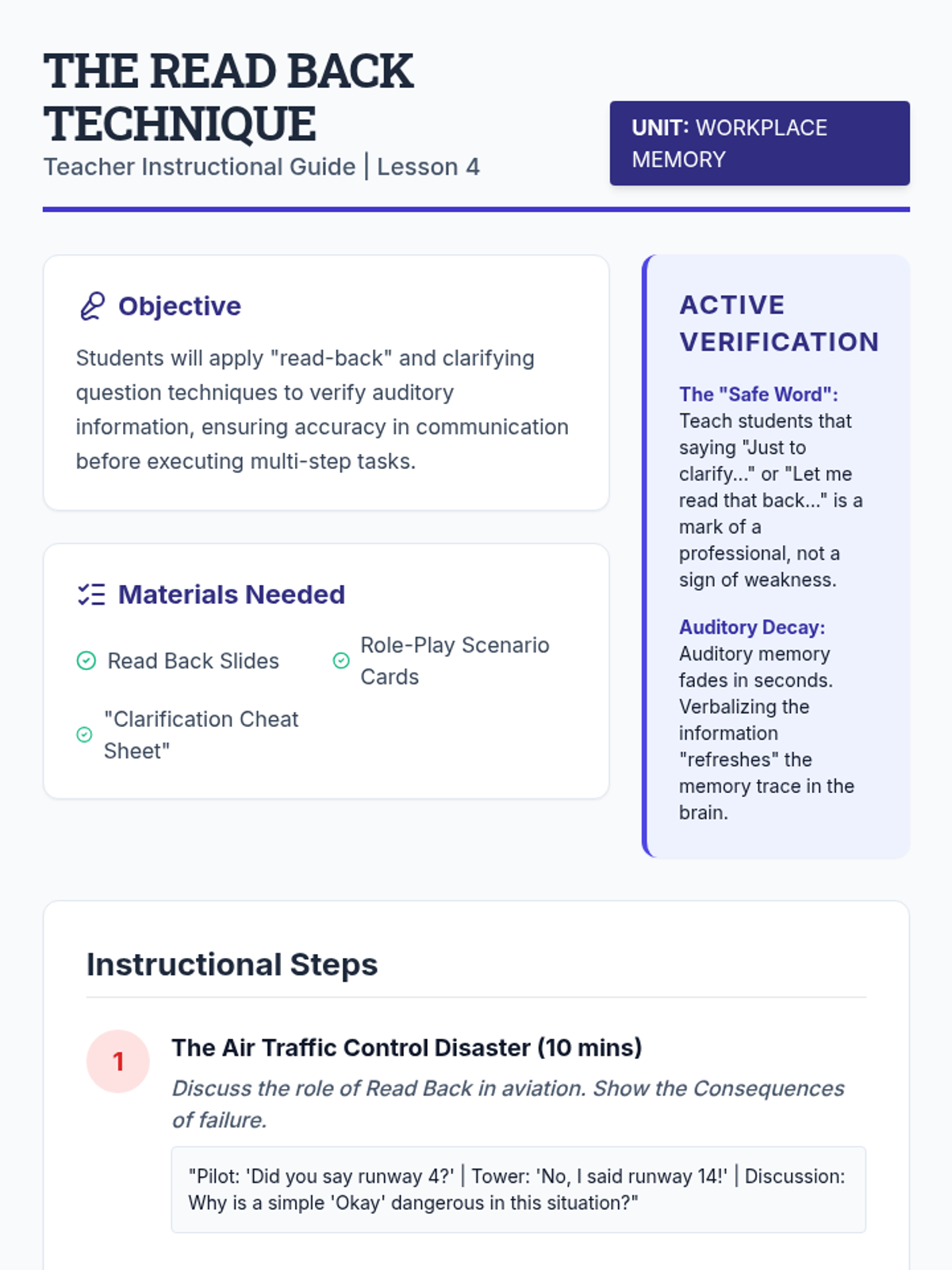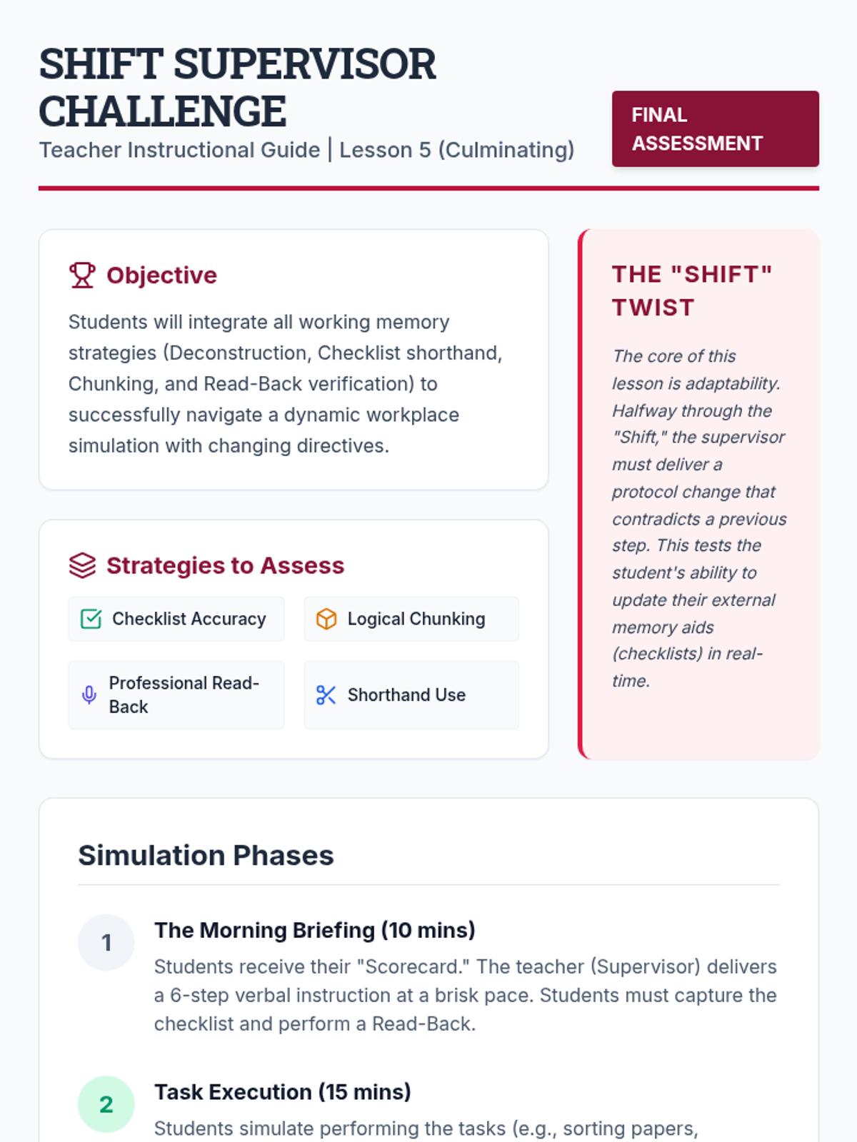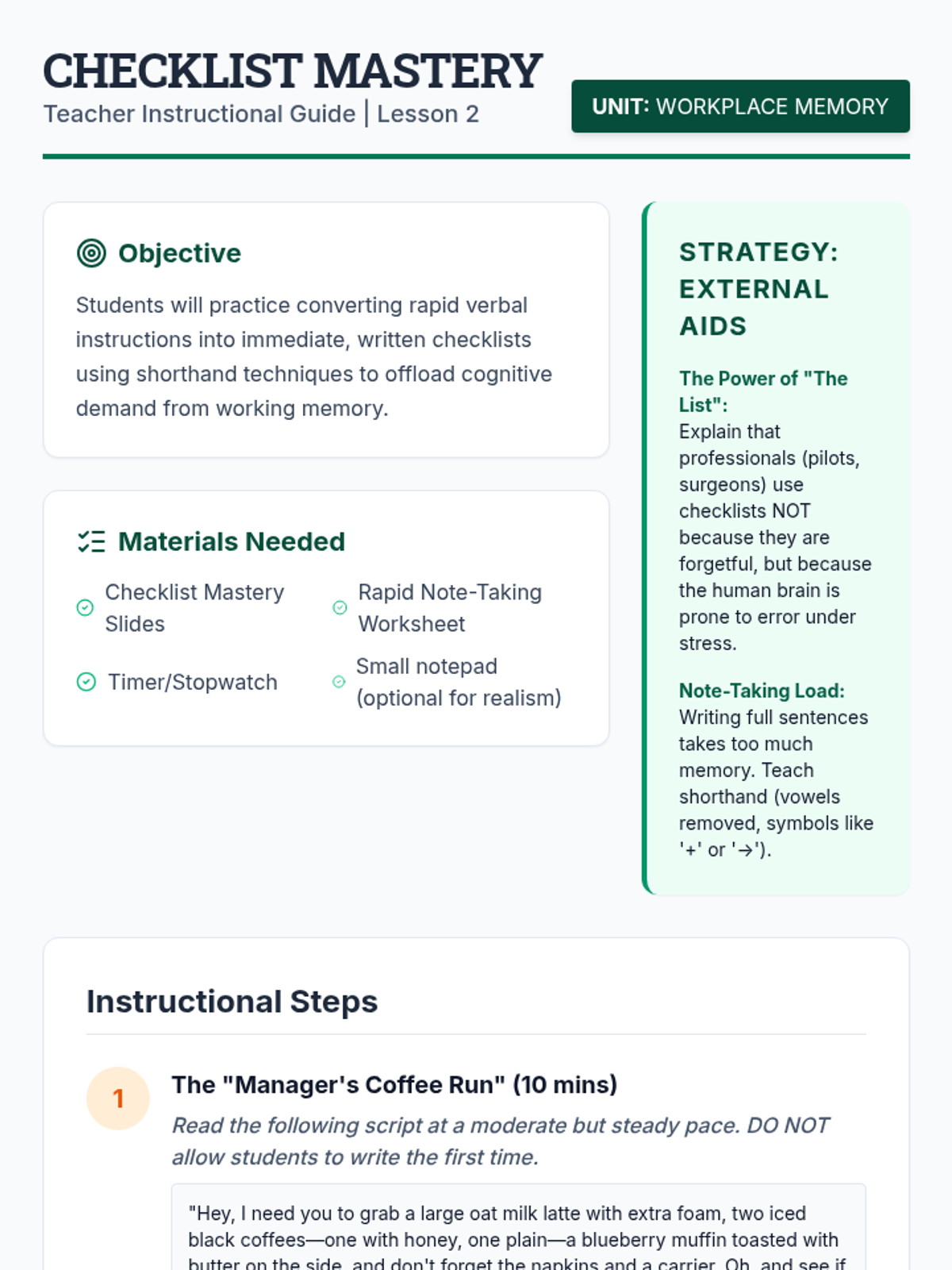 A specialized sequence for 9th-grade students focusing on working memory strategies within vocational contexts. Students learn to deconstruct complex protocols, use checklists, chunk tasks, and utilize professional communication to manage multi-step directions effectively in the workplace.