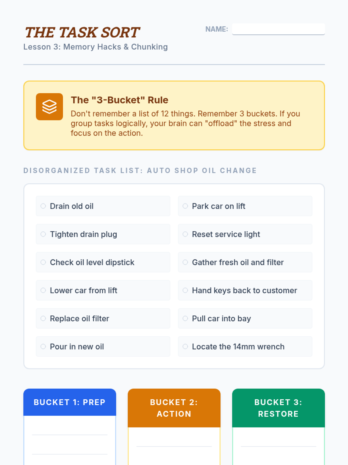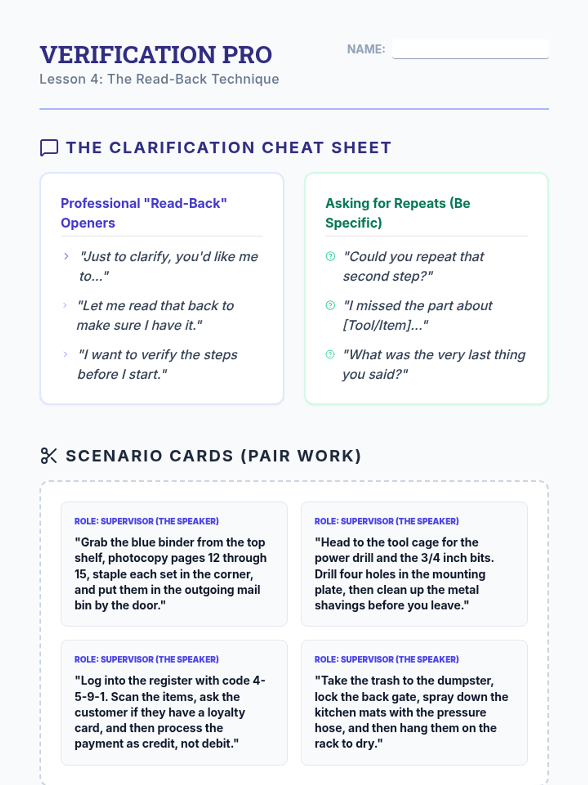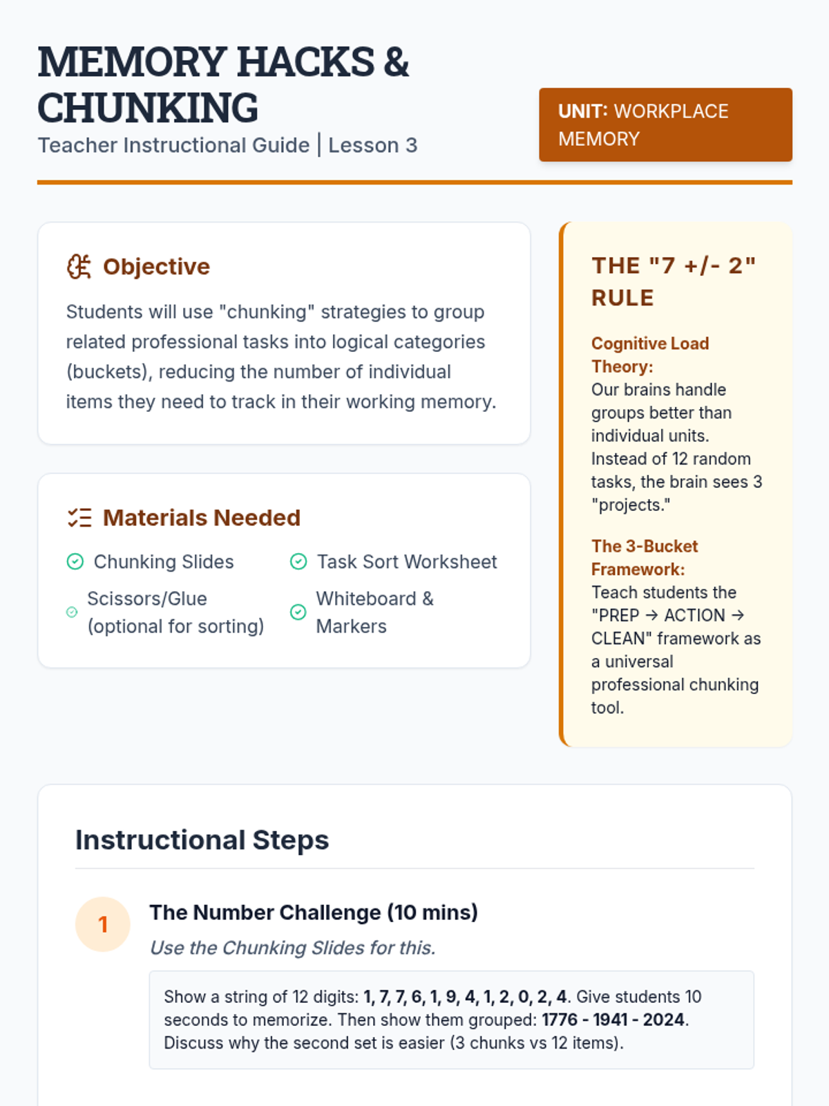 A specialized sequence for 9th-grade students focusing on working memory strategies within vocational contexts. Students learn to deconstruct complex protocols, use checklists, chunk tasks, and utilize professional communication to manage multi-step directions effectively in the workplace.