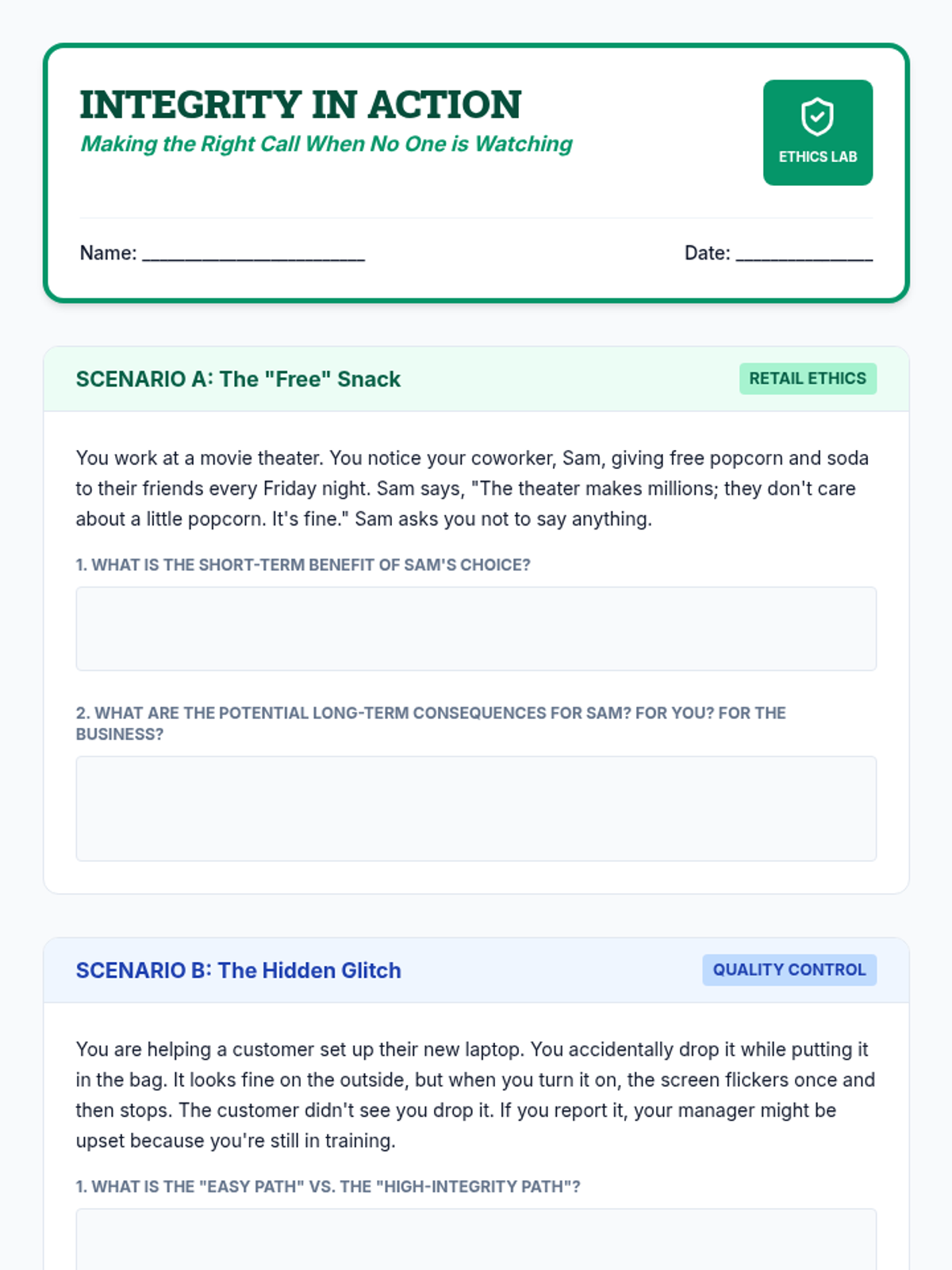 A 5-lesson unit for 7th graders on developing professional work ethic, reliability, and accountability. Students move from defining professionalism to practicing ethical decision-making and professional communication.