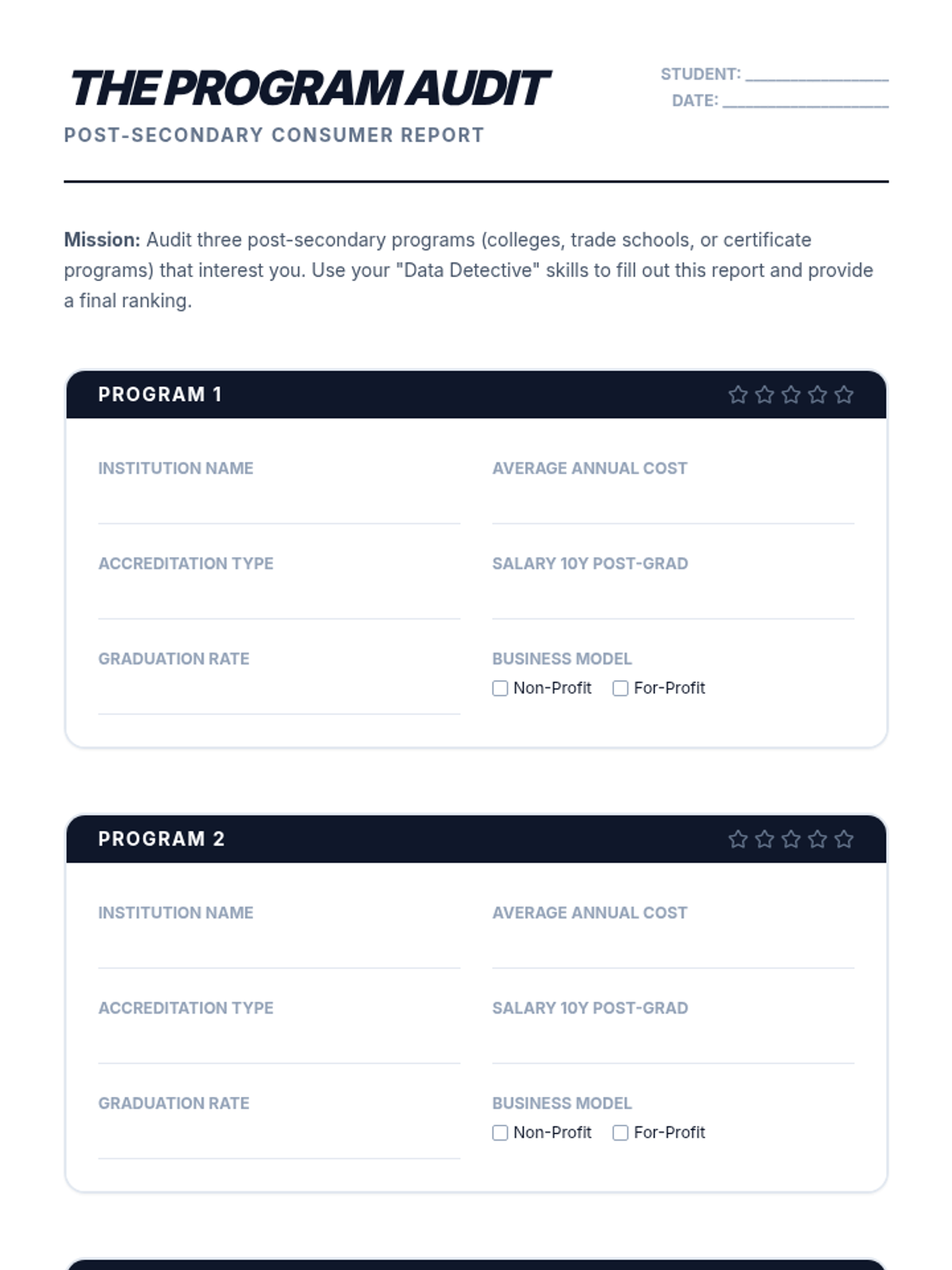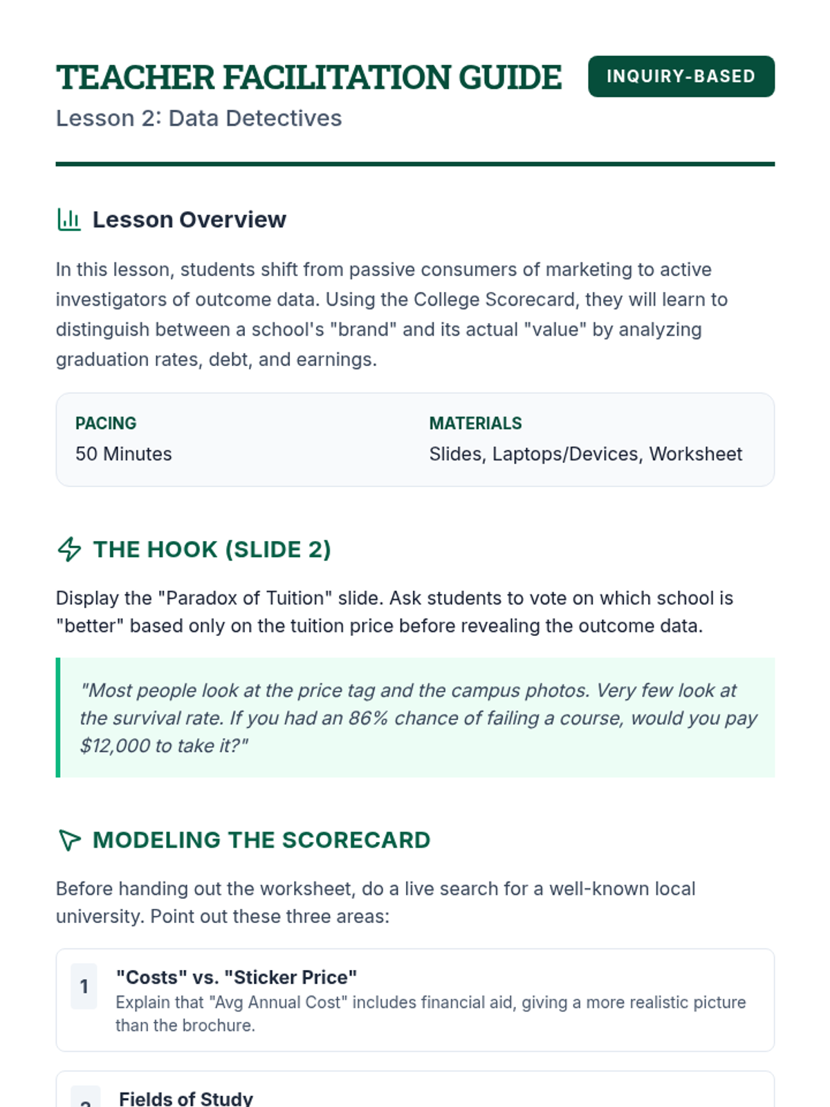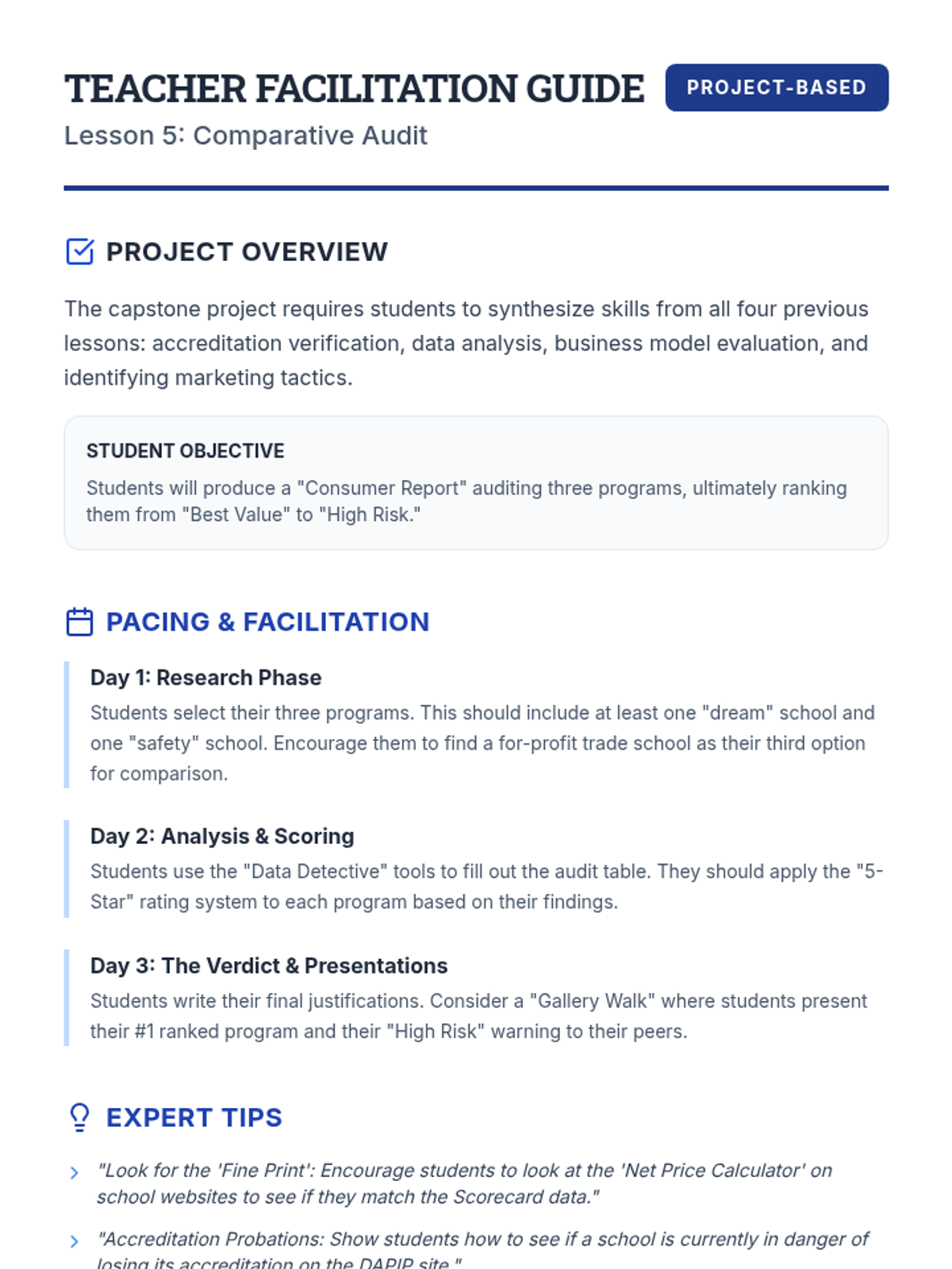 This sequence empowers 12th-grade students to evaluate post-secondary program quality. Students explore accreditation systems, analyze outcome data, compare non-profit vs. for-profit models, and identify predatory marketing to make informed educational investments.