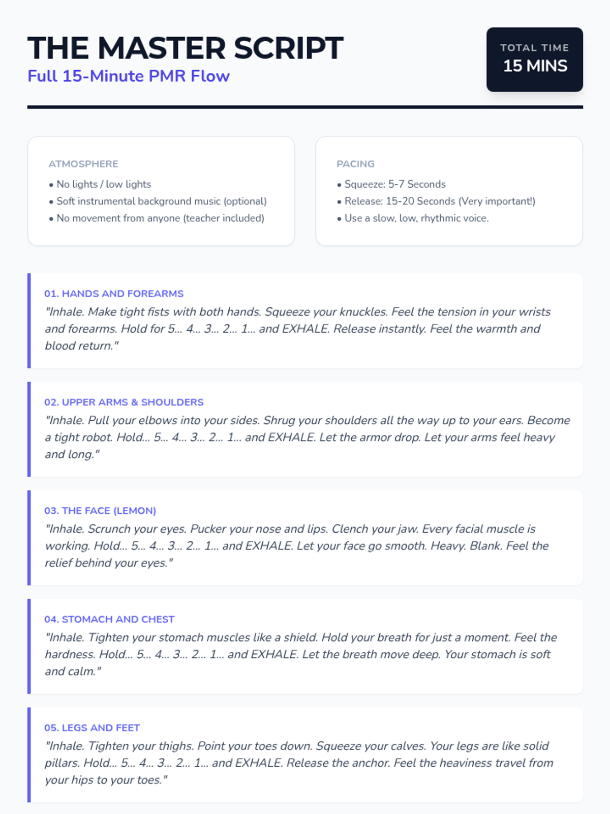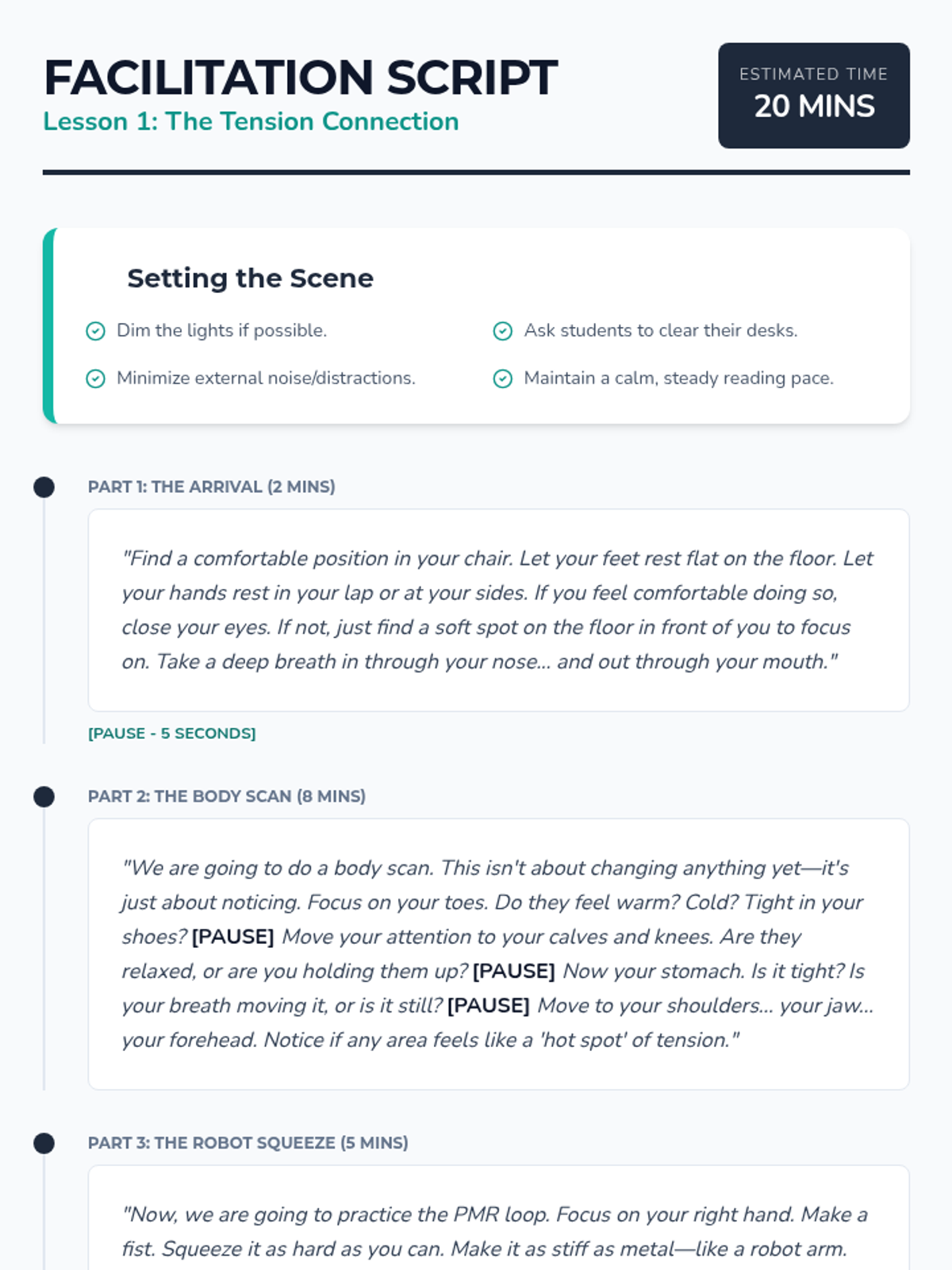 A structured introduction to Progressive Muscle Relaxation (PMR) for 7th-grade students. This sequence guides students from identifying somatic tension to mastering a full-body relaxation routine to manage stress and improve well-being.