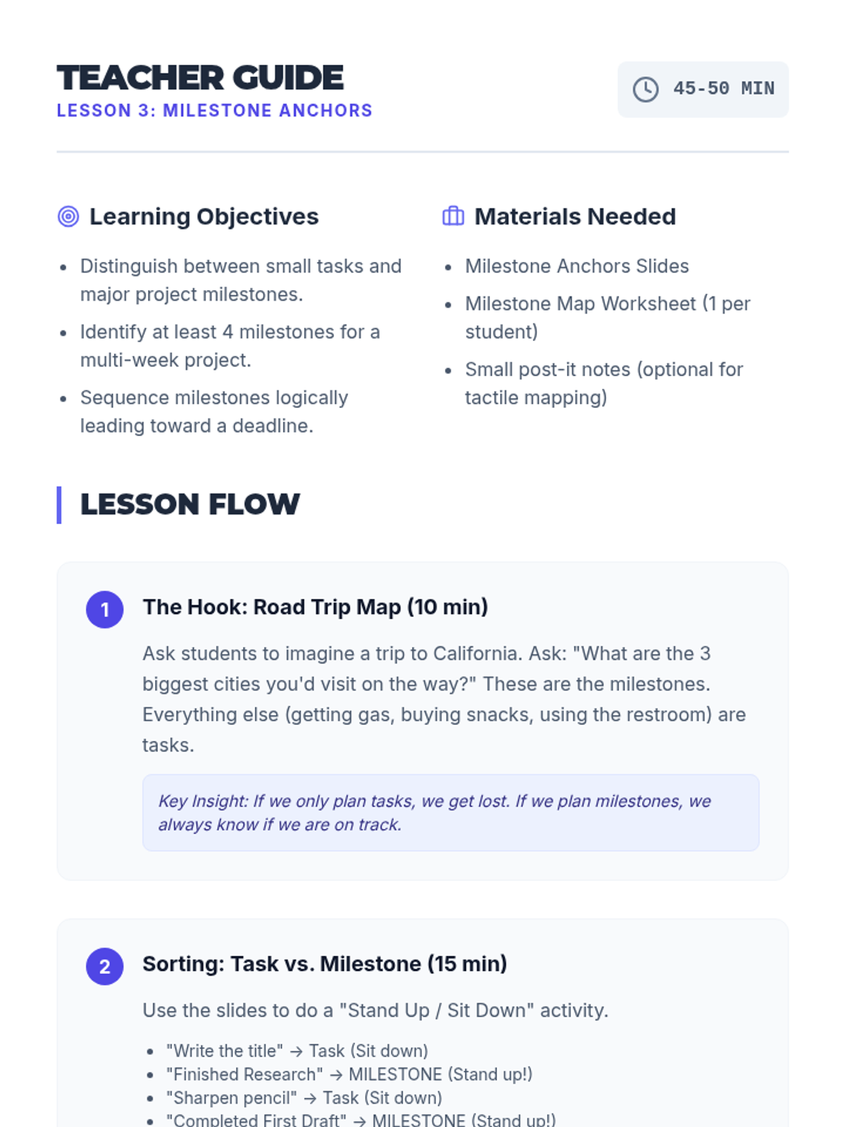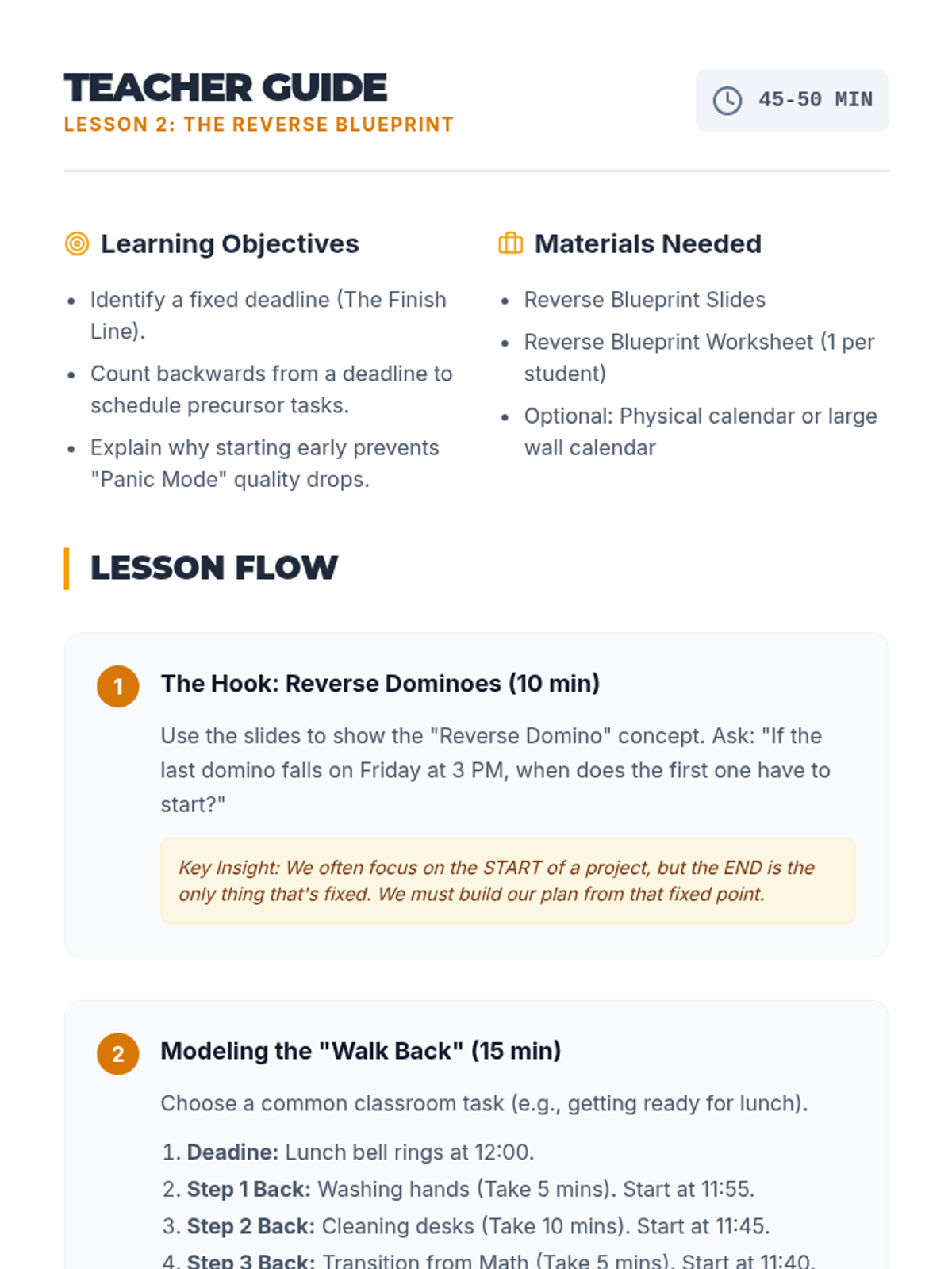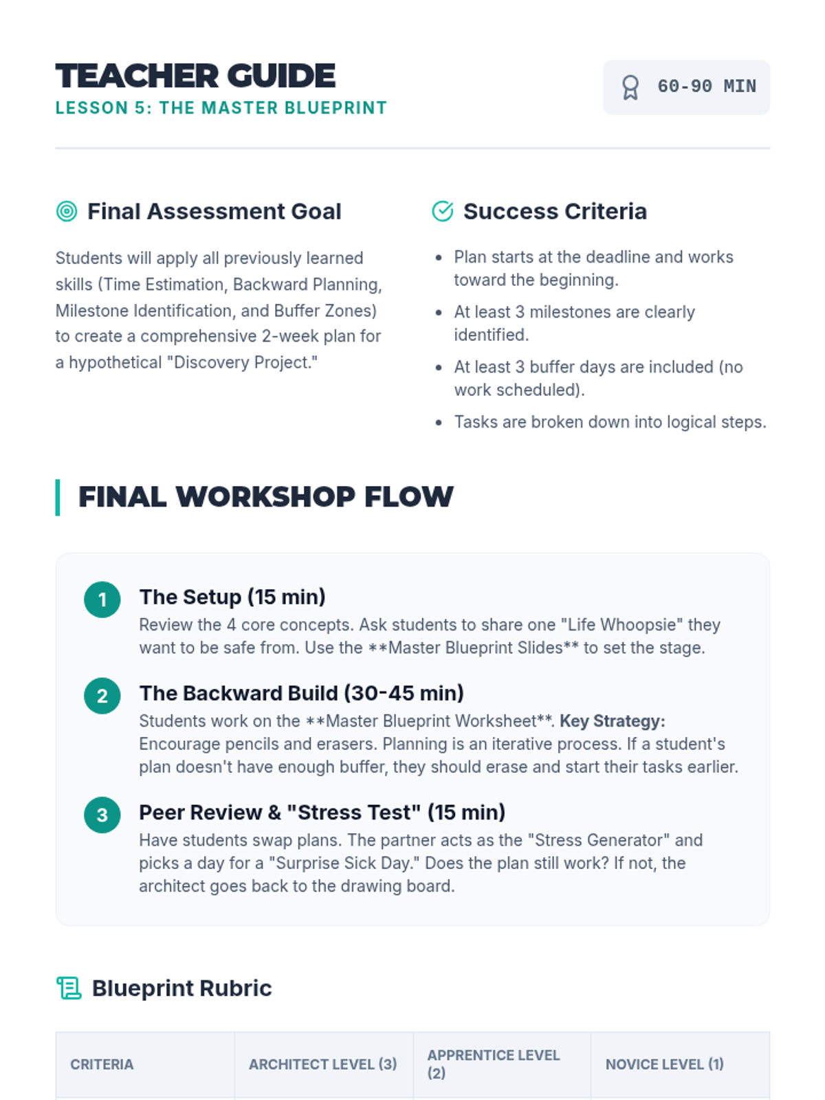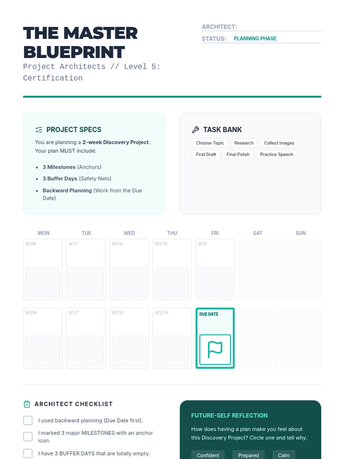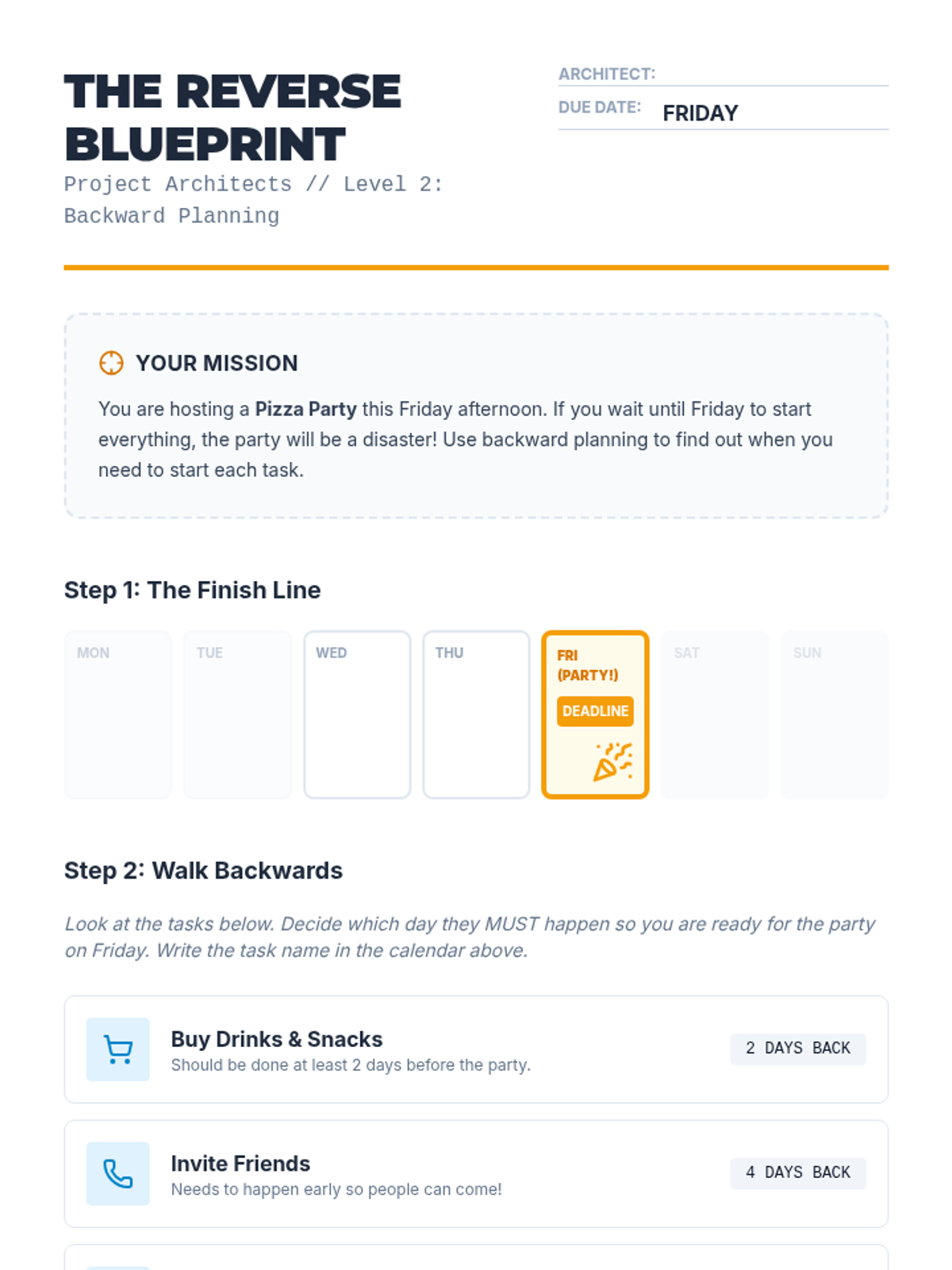 A comprehensive guide to project management for 6th graders, focusing on backward design, time estimation, and managing time blindness to reduce deadline stress.