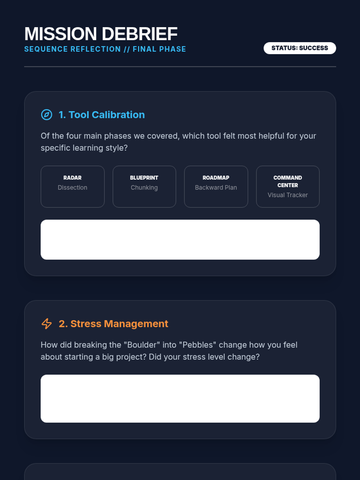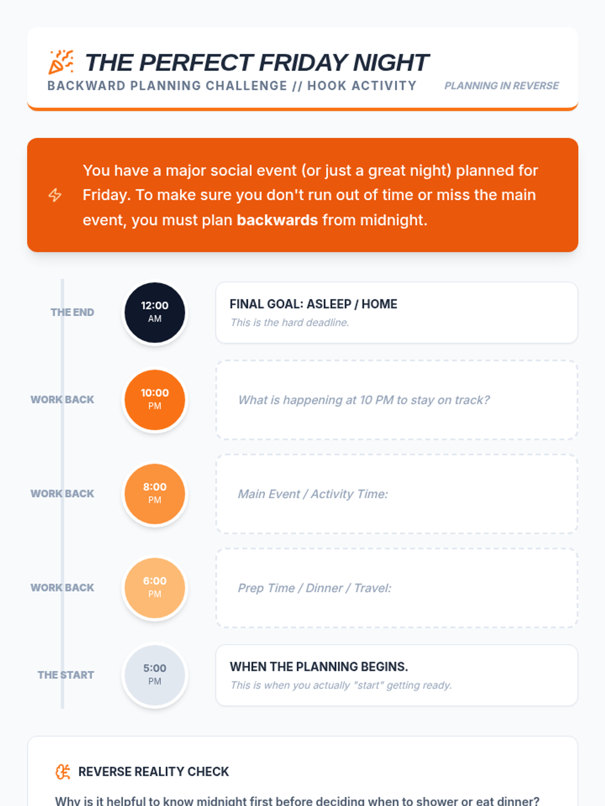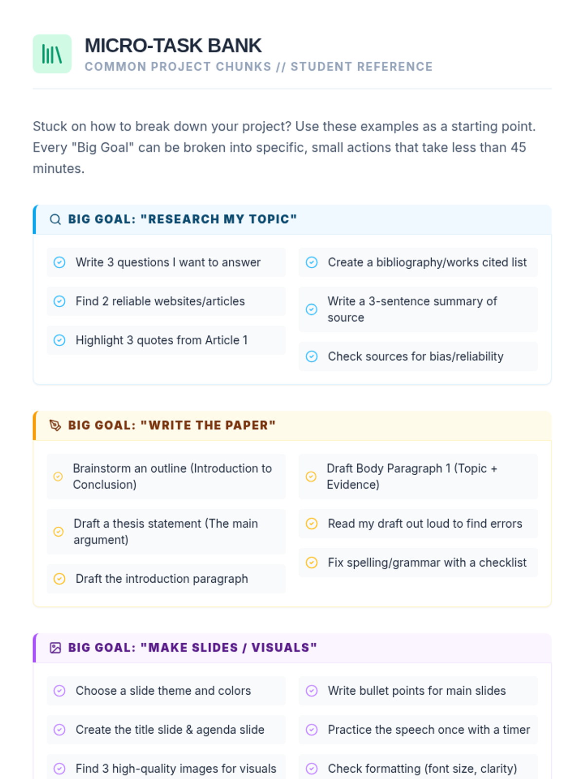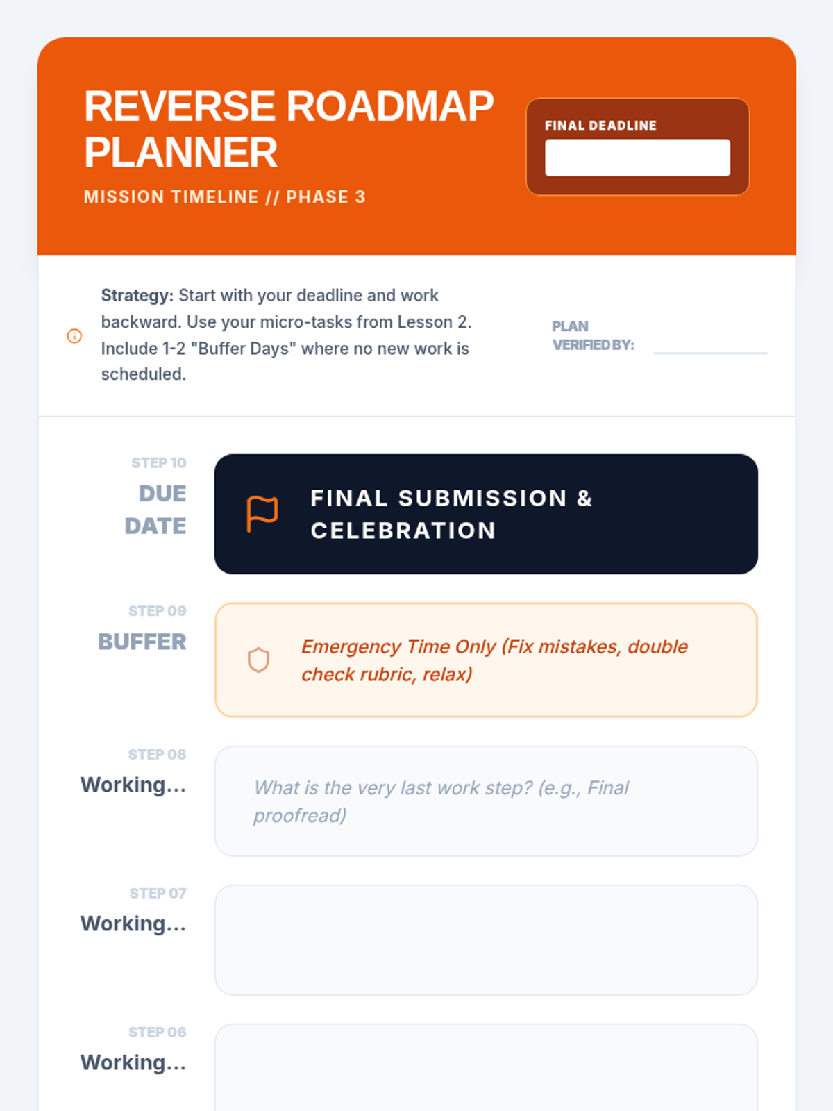 This sequence equips 11th-grade students with executive functioning strategies to manage complex projects. Students learn to analyze requirements, deconstruct tasks into micro-steps, plan backwards from deadlines, and use visual monitoring tools to track progress and adapt to obstacles.