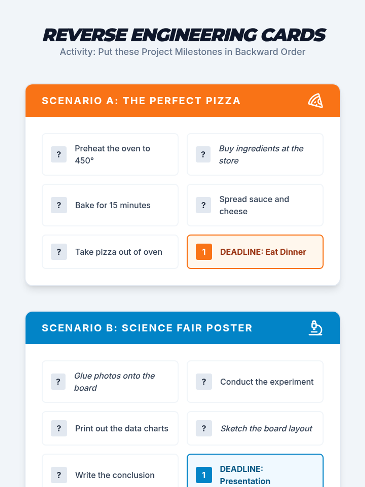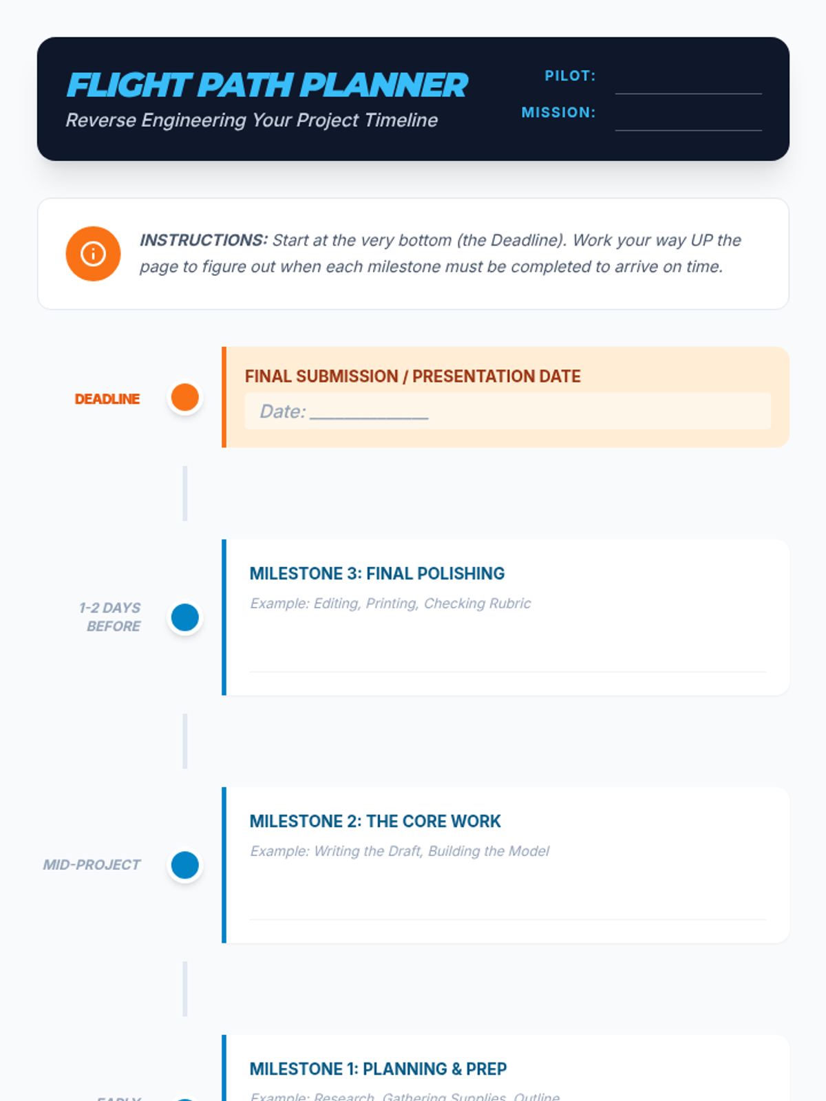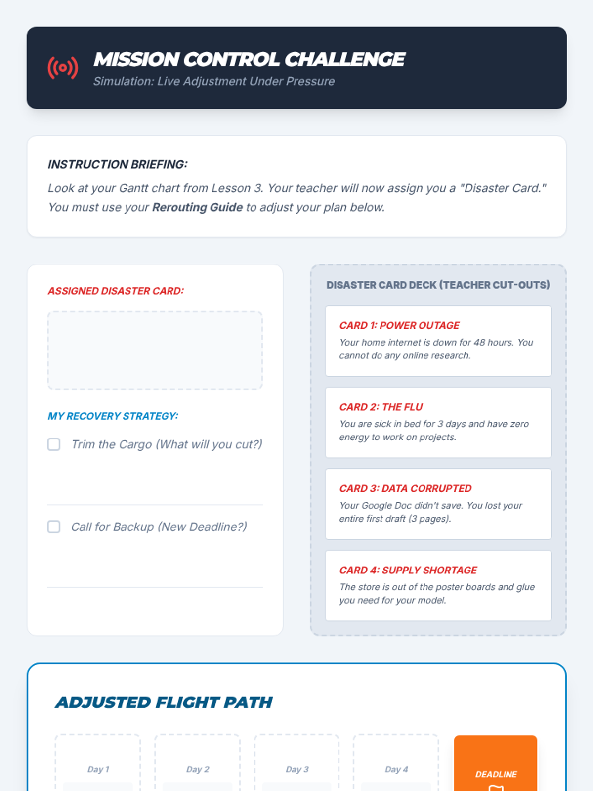 A specialized sequence for 8th-grade students focusing on executive functioning skills related to project management. Students learn to deconstruct complex assignments, plan backwards from deadlines, visualize overlapping tasks using Gantt charts, and adjust plans when setbacks occur.