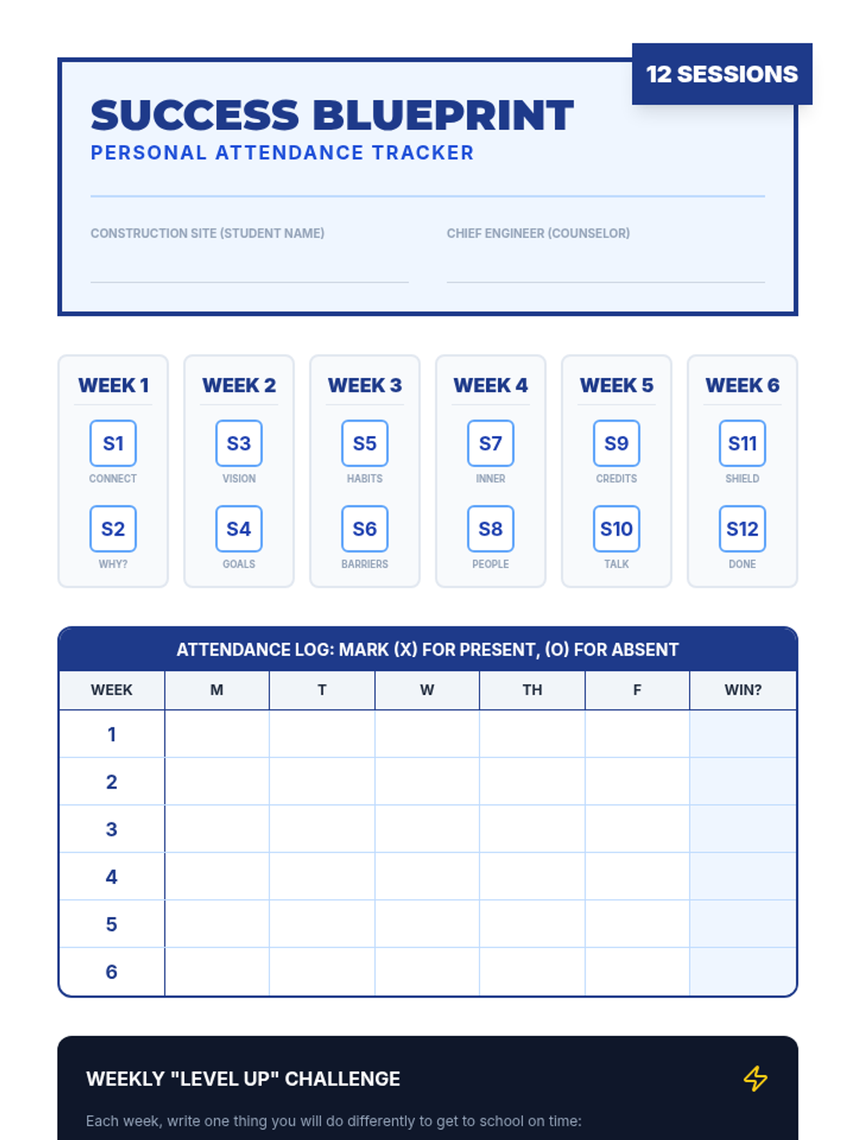 A 6-week individual counseling intervention for 9th graders struggling with attendance, focused on identifying barriers, setting goals, and building school engagement using the ASCA Mindsets & Behaviors framework.