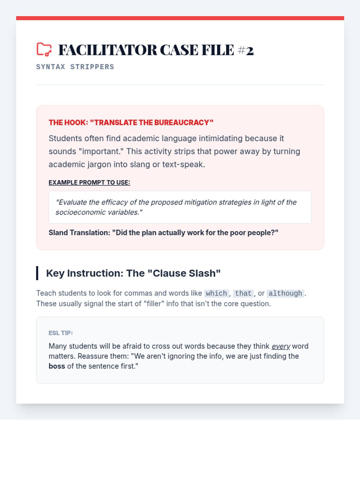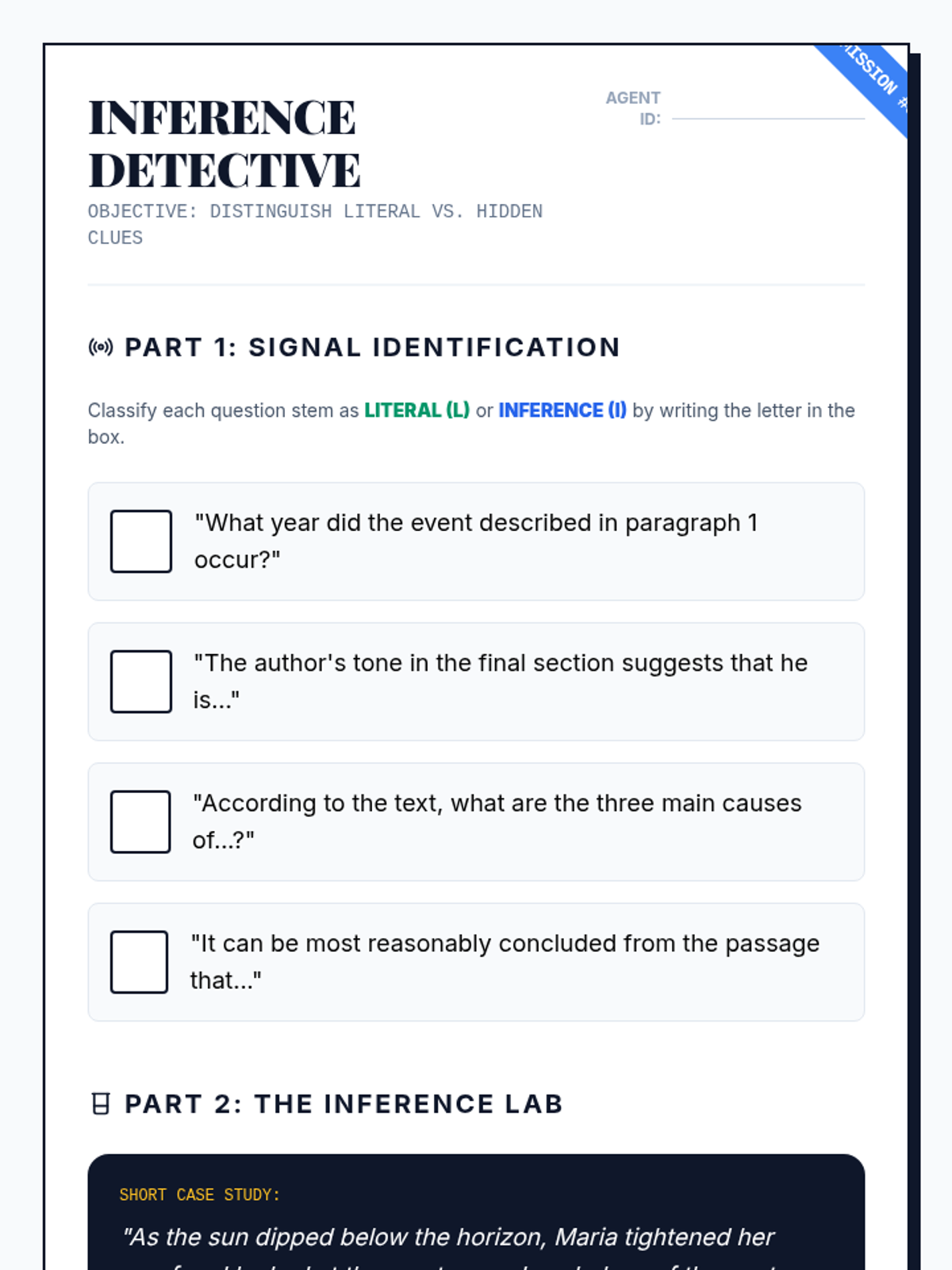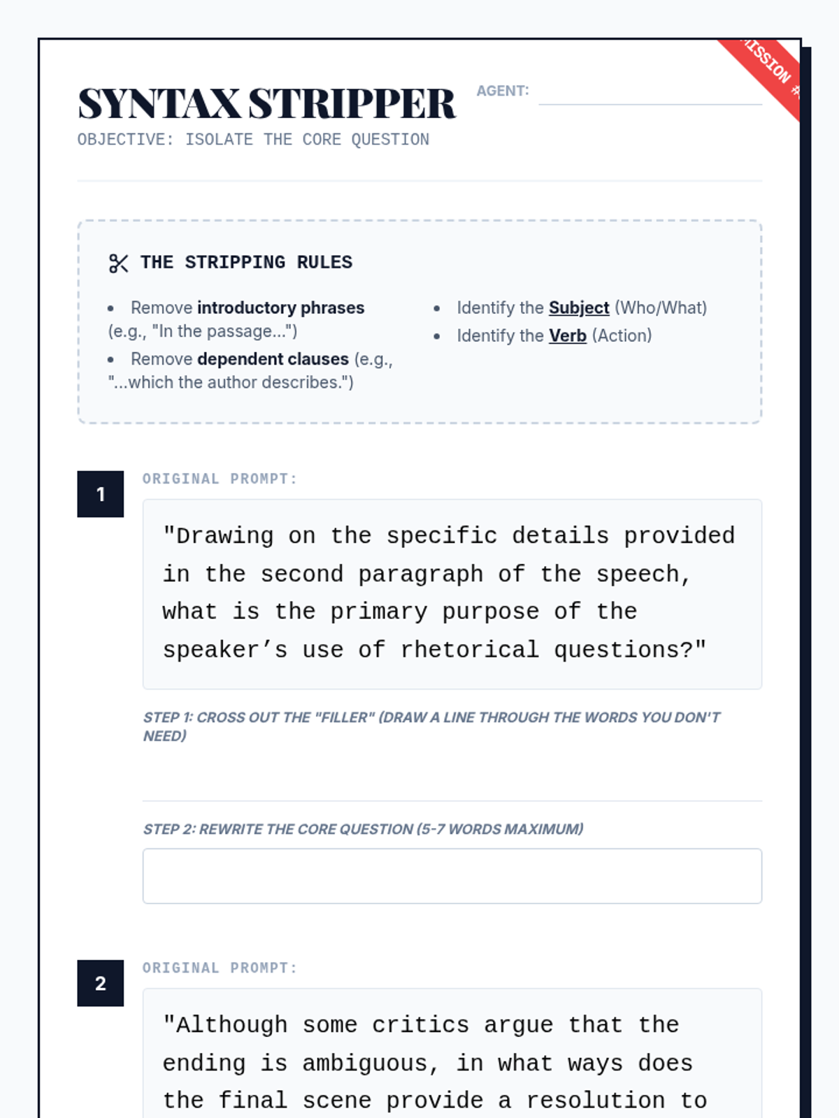 A comprehensive 5-lesson unit for 11th-grade ESL students focused on deconstructing complex academic test prompts. Students transition from identifying instructional verbs to parsing syntax, distinguishing inference from literal recall, and mastering advanced strategies like prediction and handling negative constraints.
