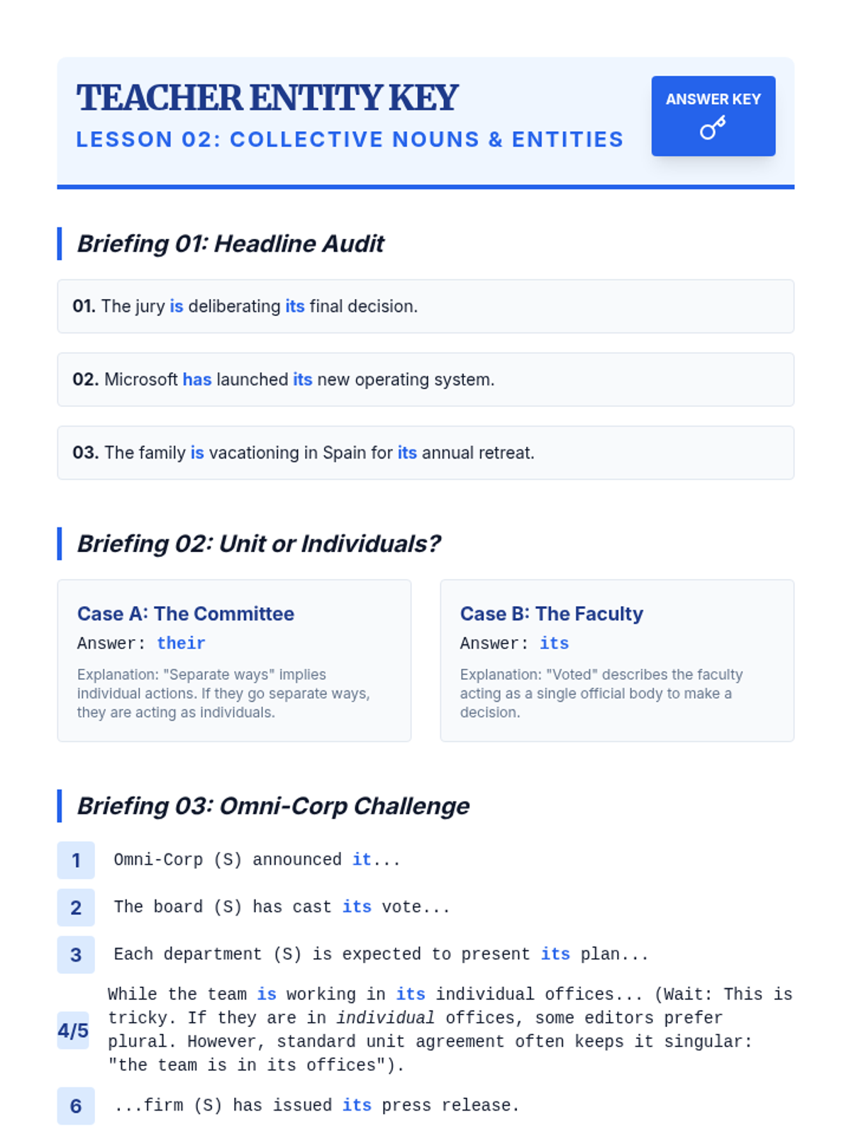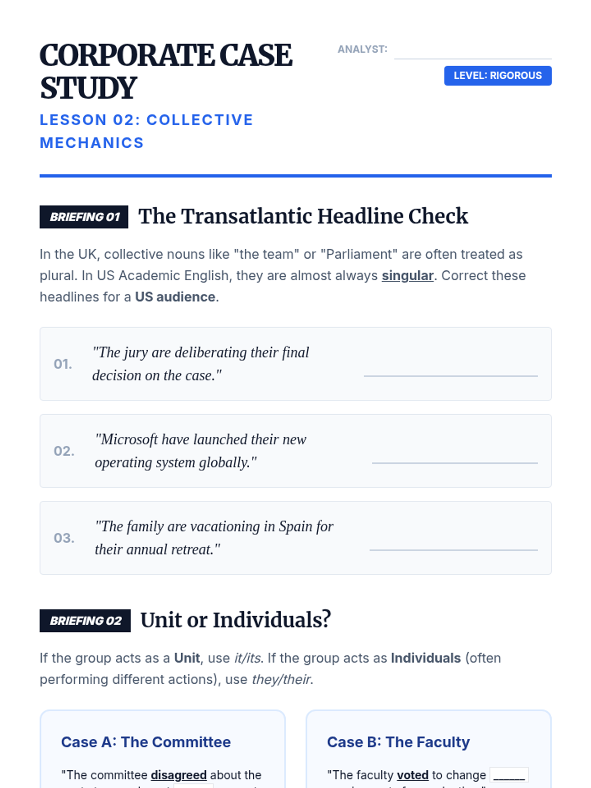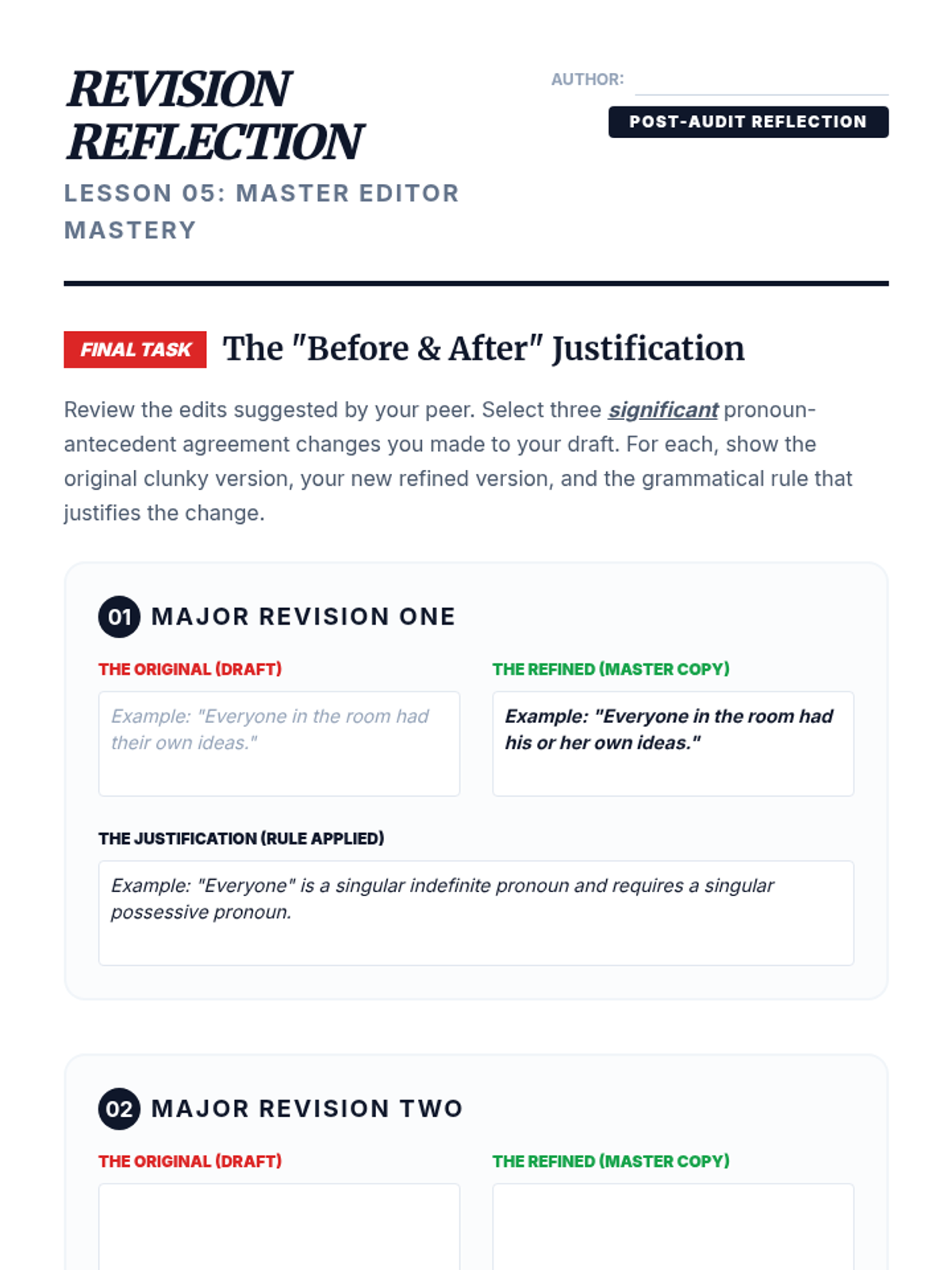 A rigorous grammar workshop focused on pronoun-antecedent agreement in academic editing, moving from basic diagnostics to complex collective nouns and indefinite pronouns.