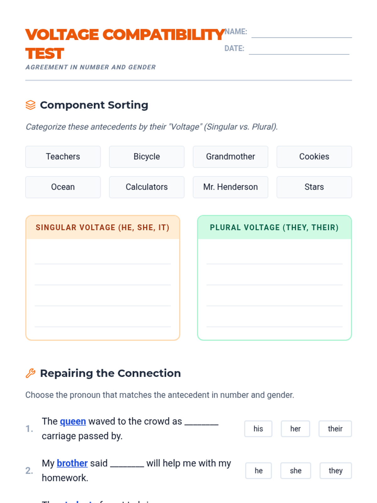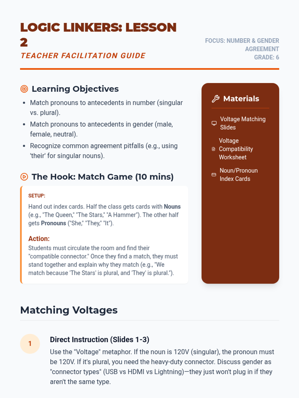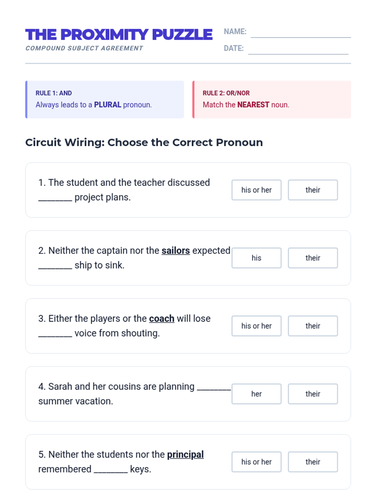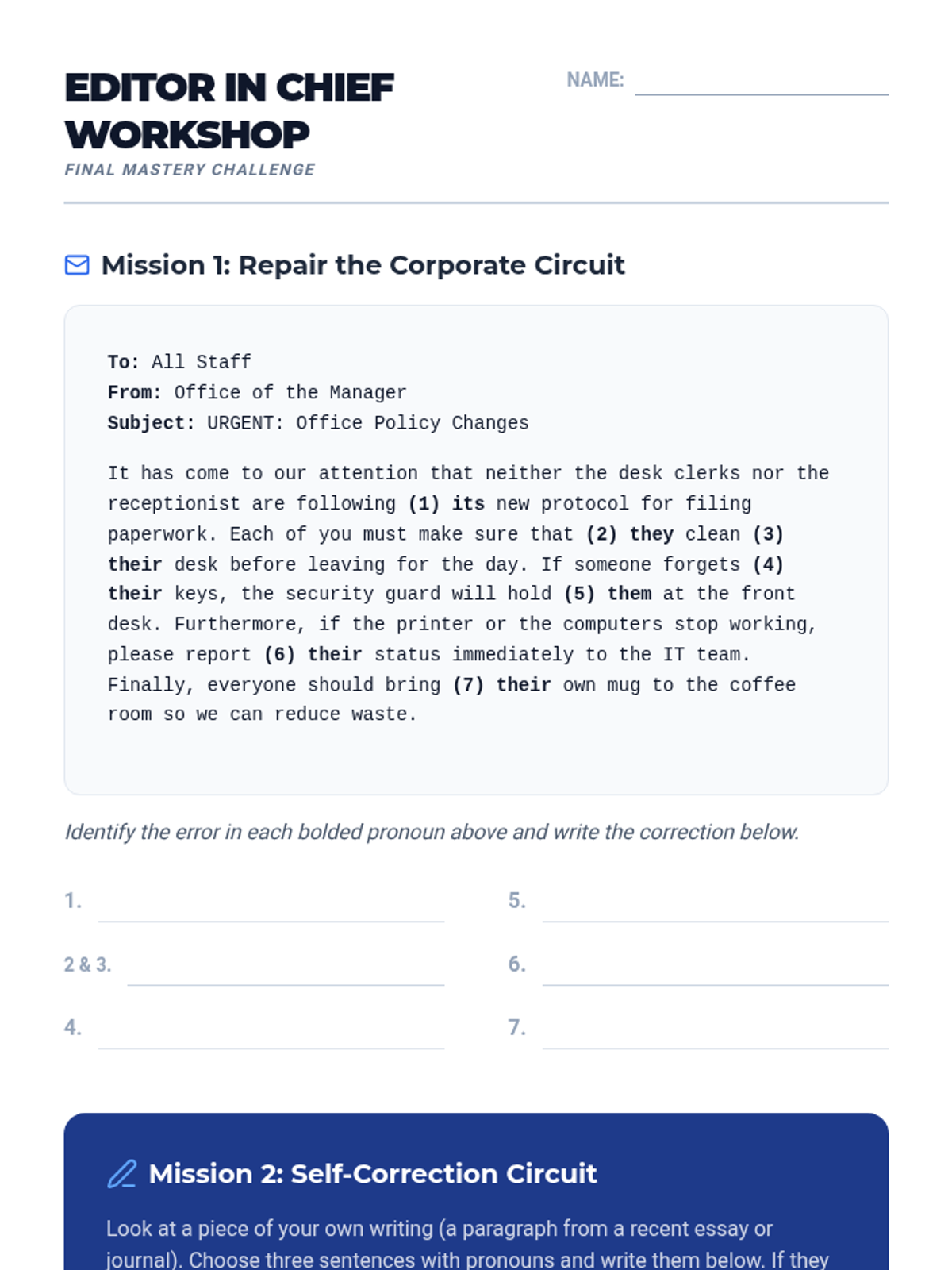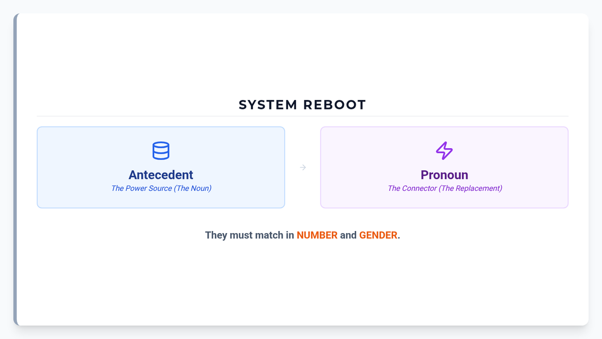 This sequence establishes the foundational rule of pronoun-antecedent agreement, ensuring students can consistently match pronouns to nouns in number and gender. Students progress from basic identification to complex scenarios involving indefinite pronouns and compound subjects, culminating in a real-world editing workshop.